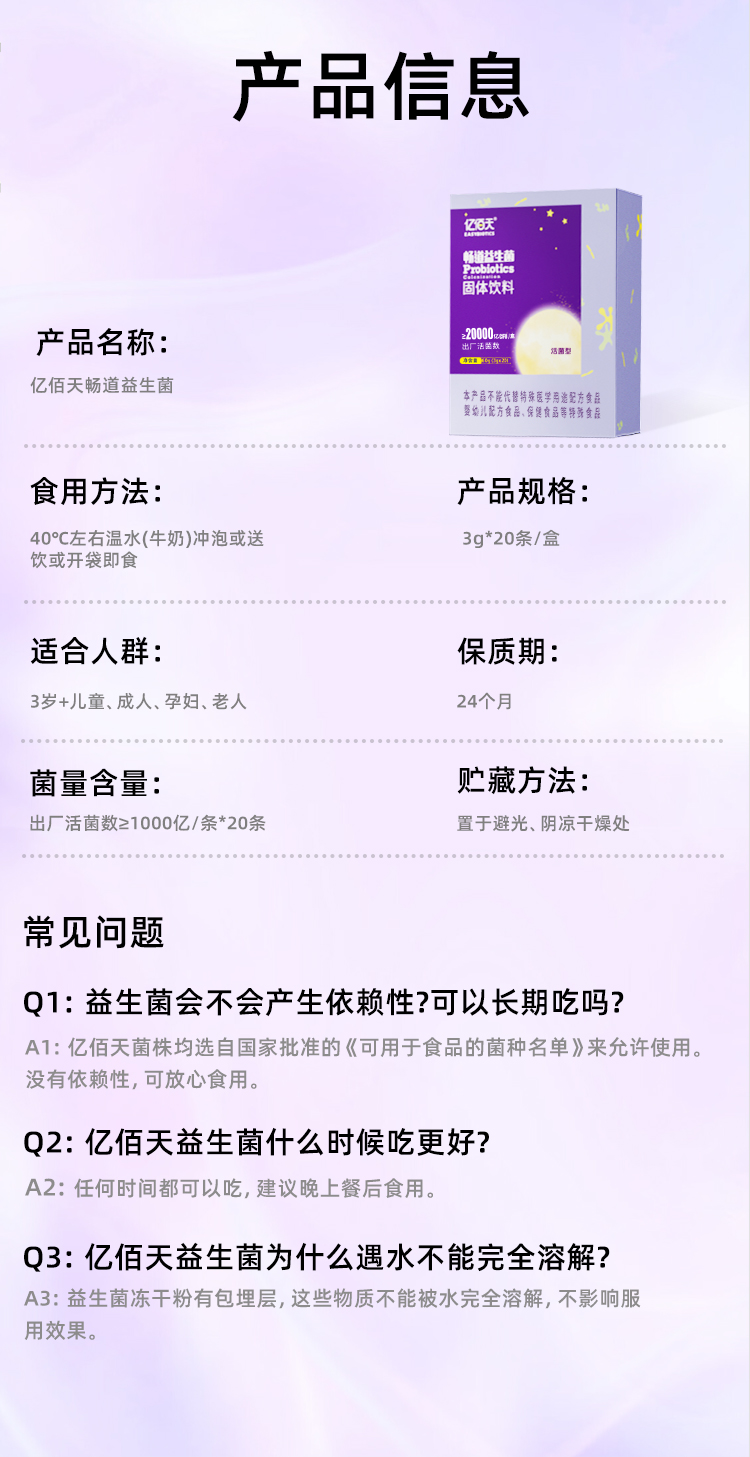 【升级加强版】亿佰天畅道益生菌 60g(3g*20条)/盒 20000亿高活菌 睡眠护胃肠道专利菌