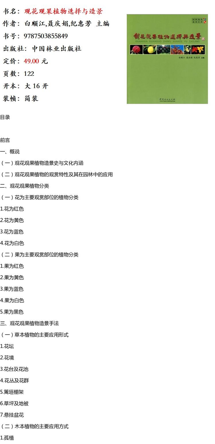 观花观果植物选择与造景 5584 植物分类 植物造景手法 盆栽 盆景 屋顶花园 植篱 棚架 园林绿化 造景艺术 中国林业出版社 畅销书