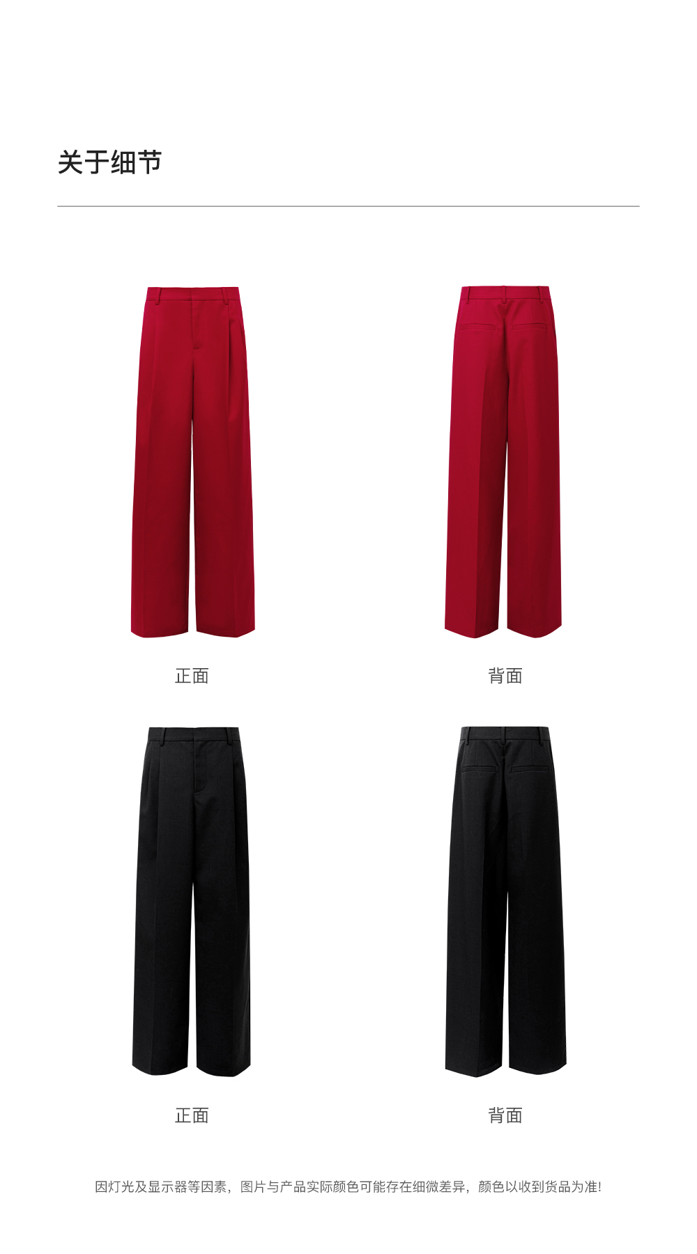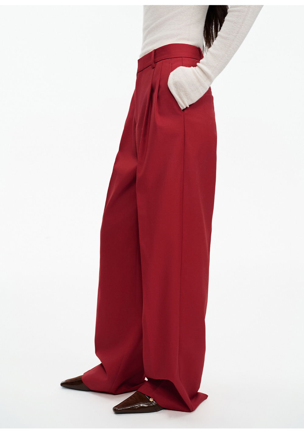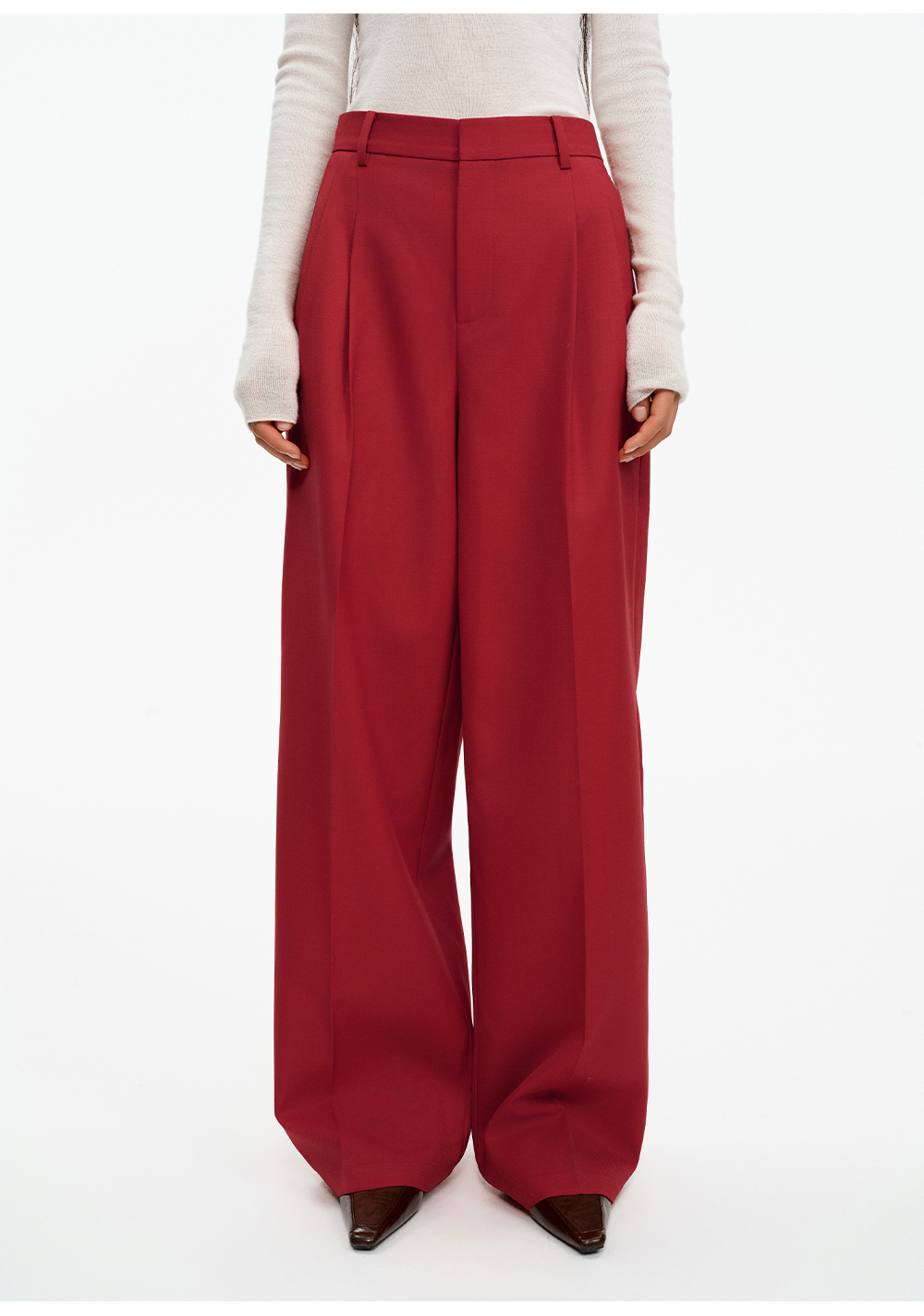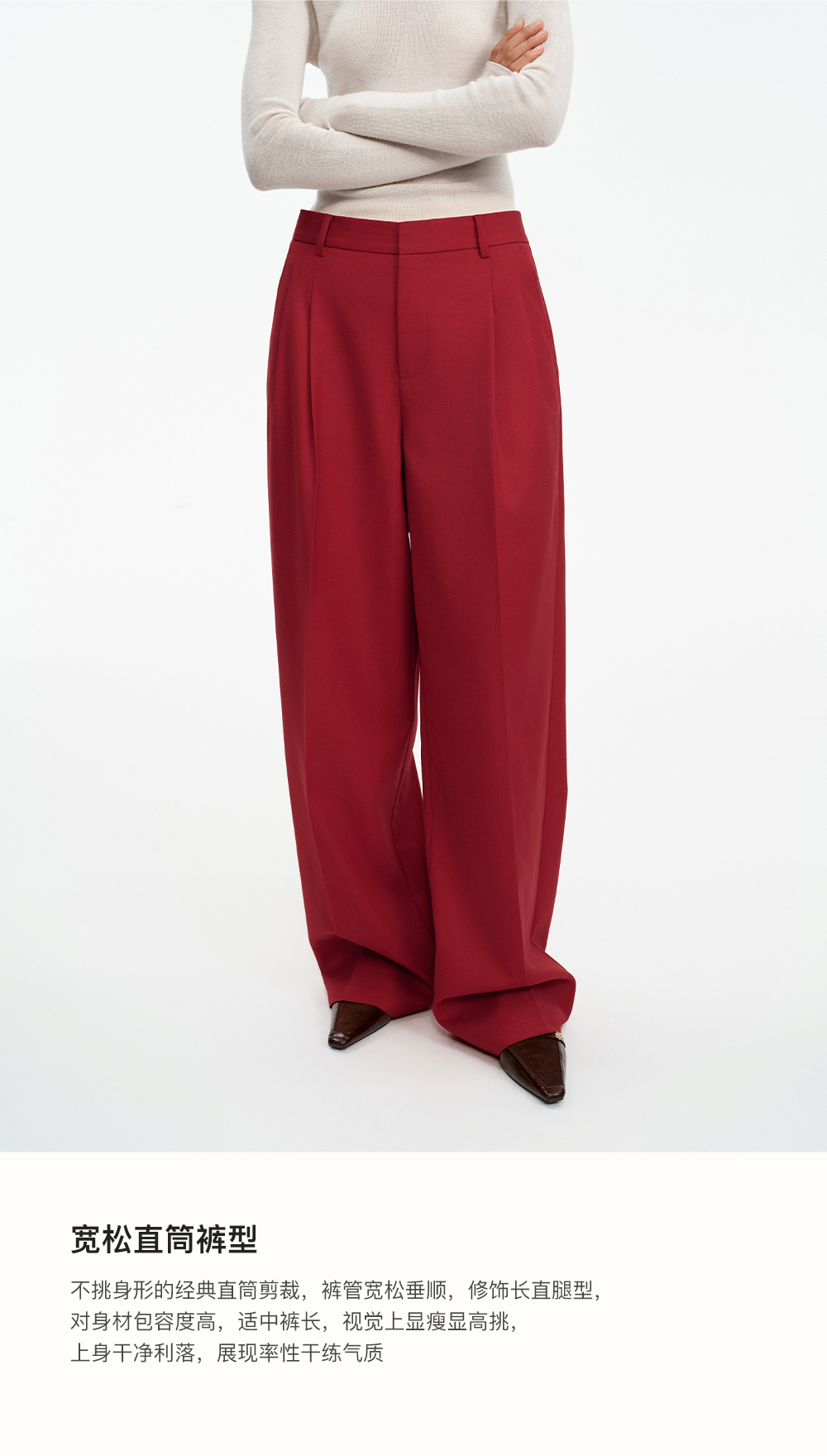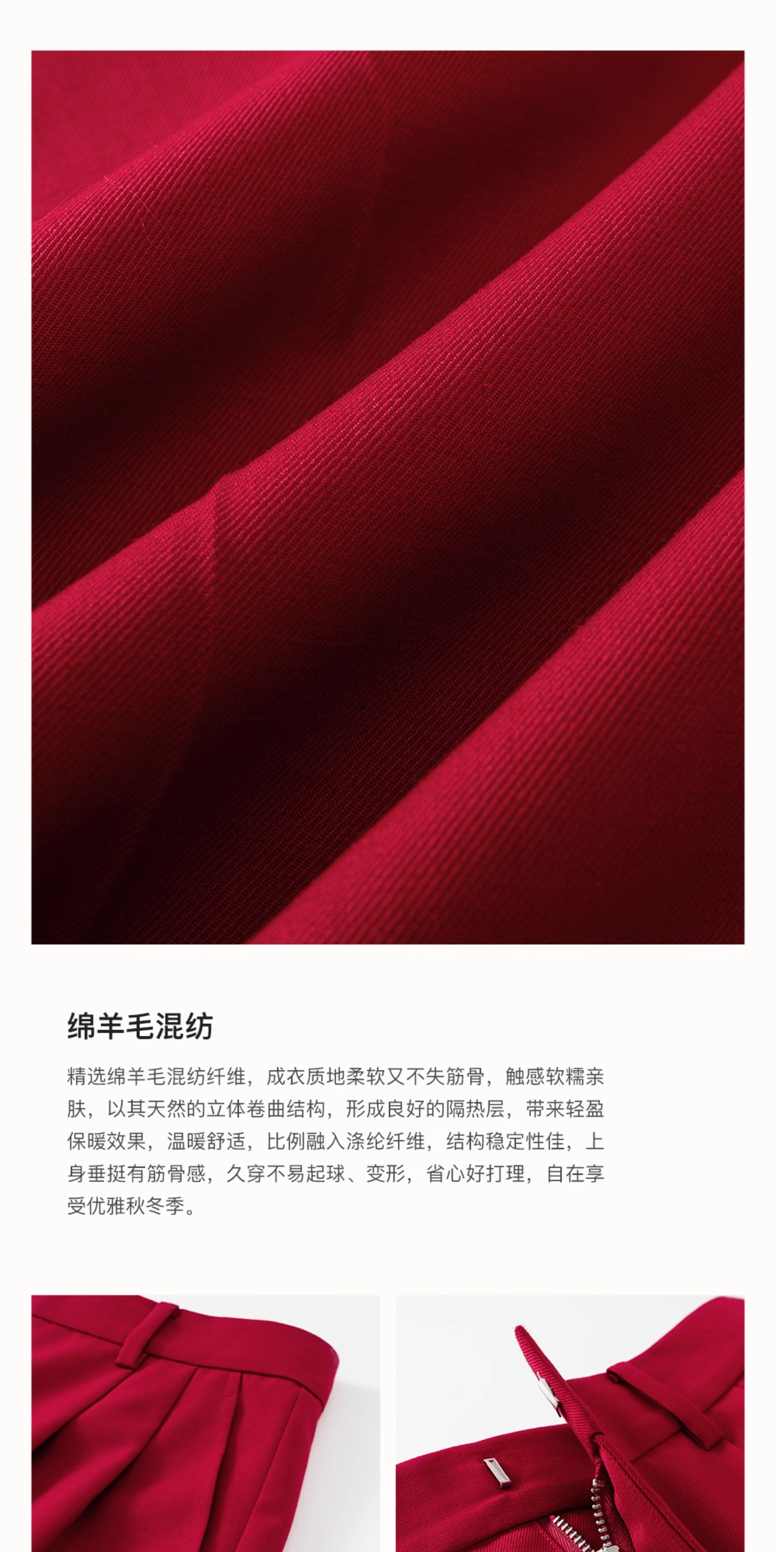 SELFWHO绵羊毛混纺圣诞红压褶西装裤女2025冬新款宽松直筒休闲裤