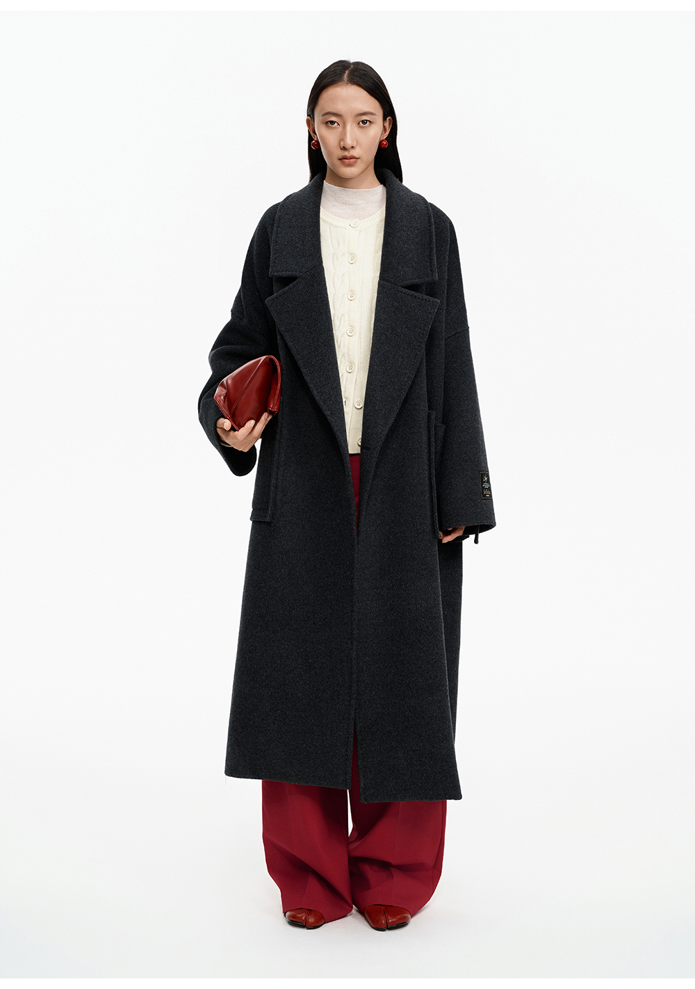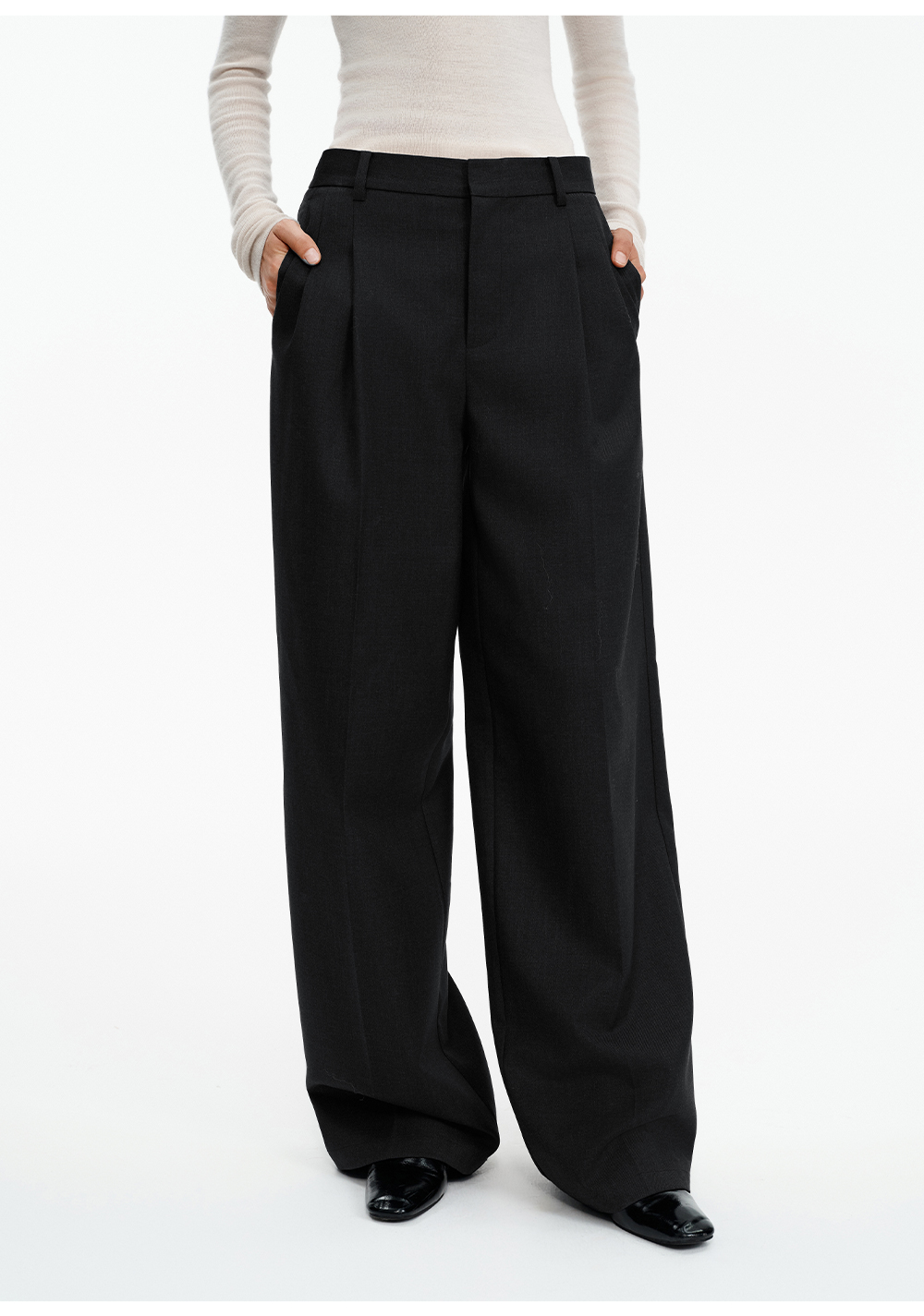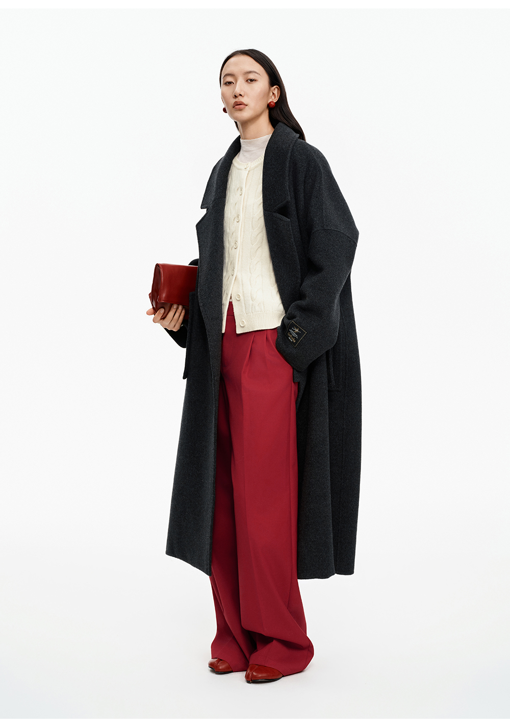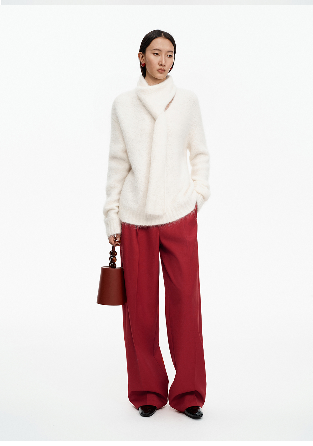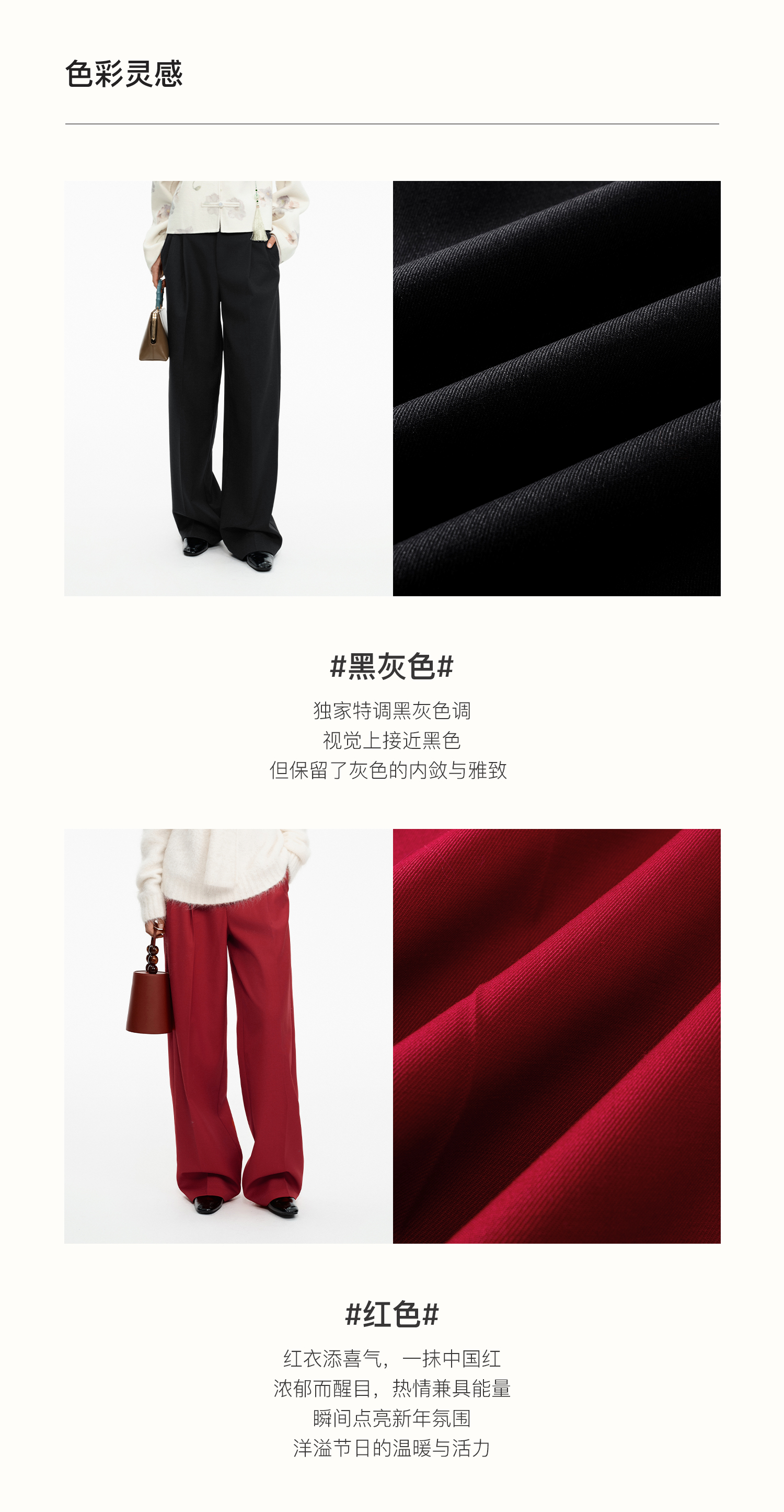 SELFWHO绵羊毛混纺圣诞红压褶西装裤女2025冬新款宽松直筒休闲裤