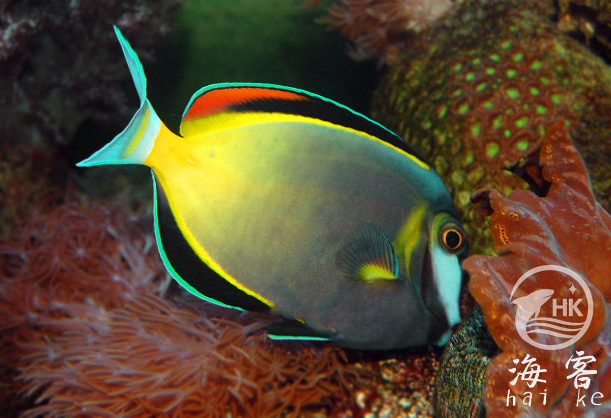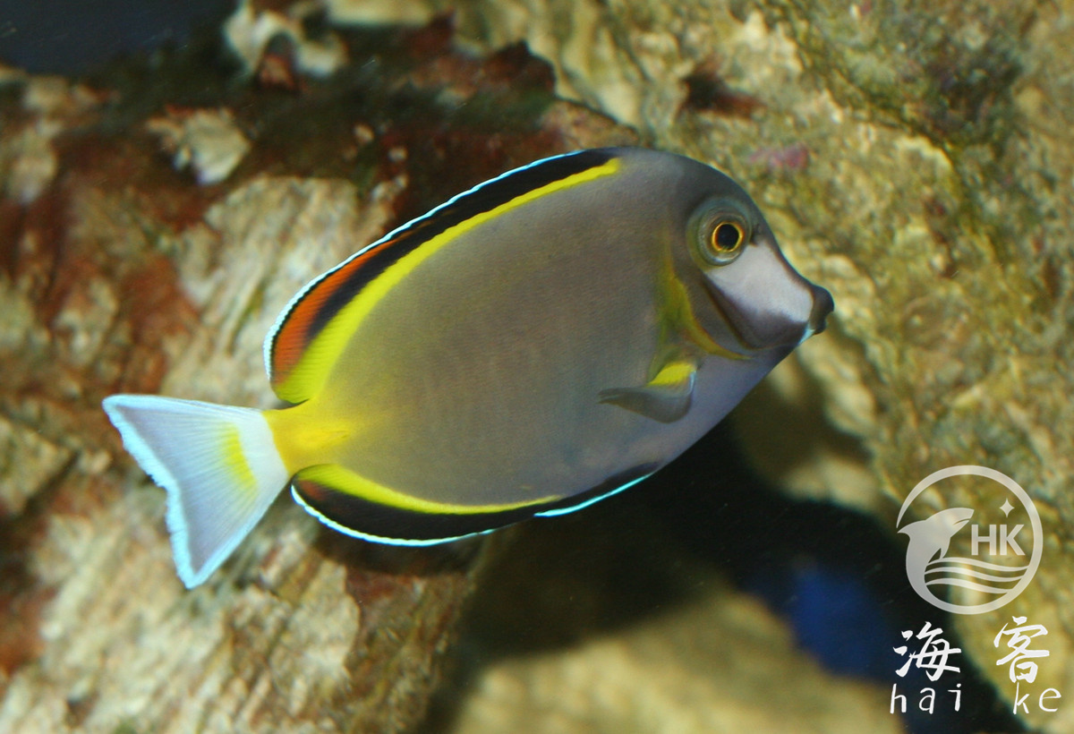 是一种美丽的吊。身体大部分是巧克力色,面部白色,背鳍及臀鳍的底部是亮黄色,各鳍带白边。