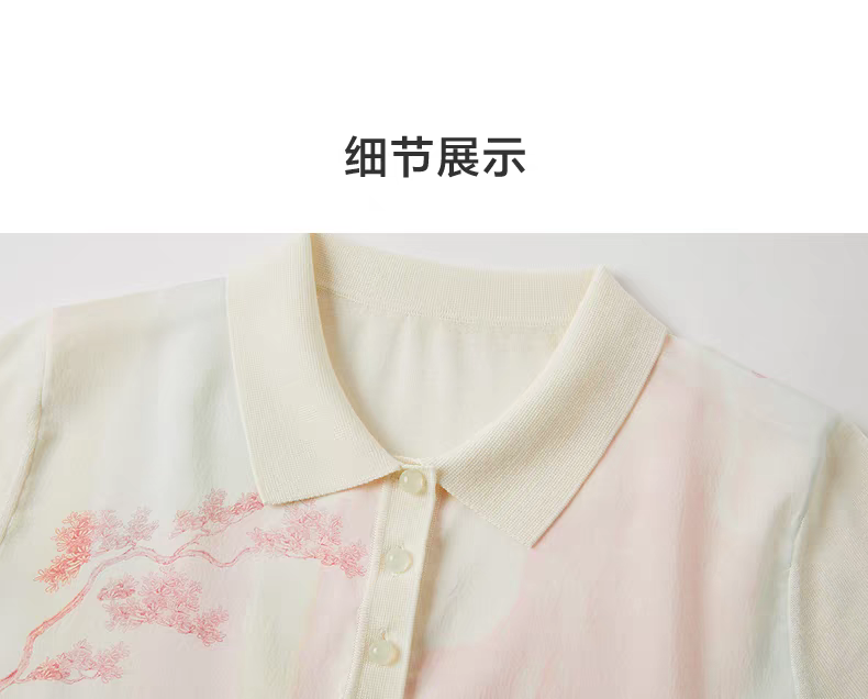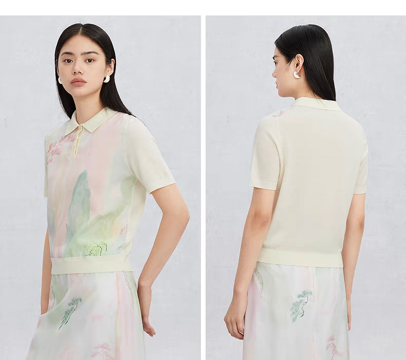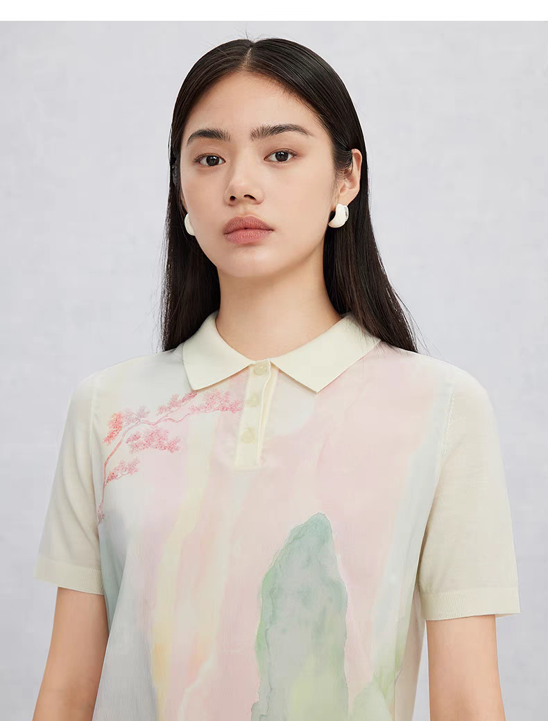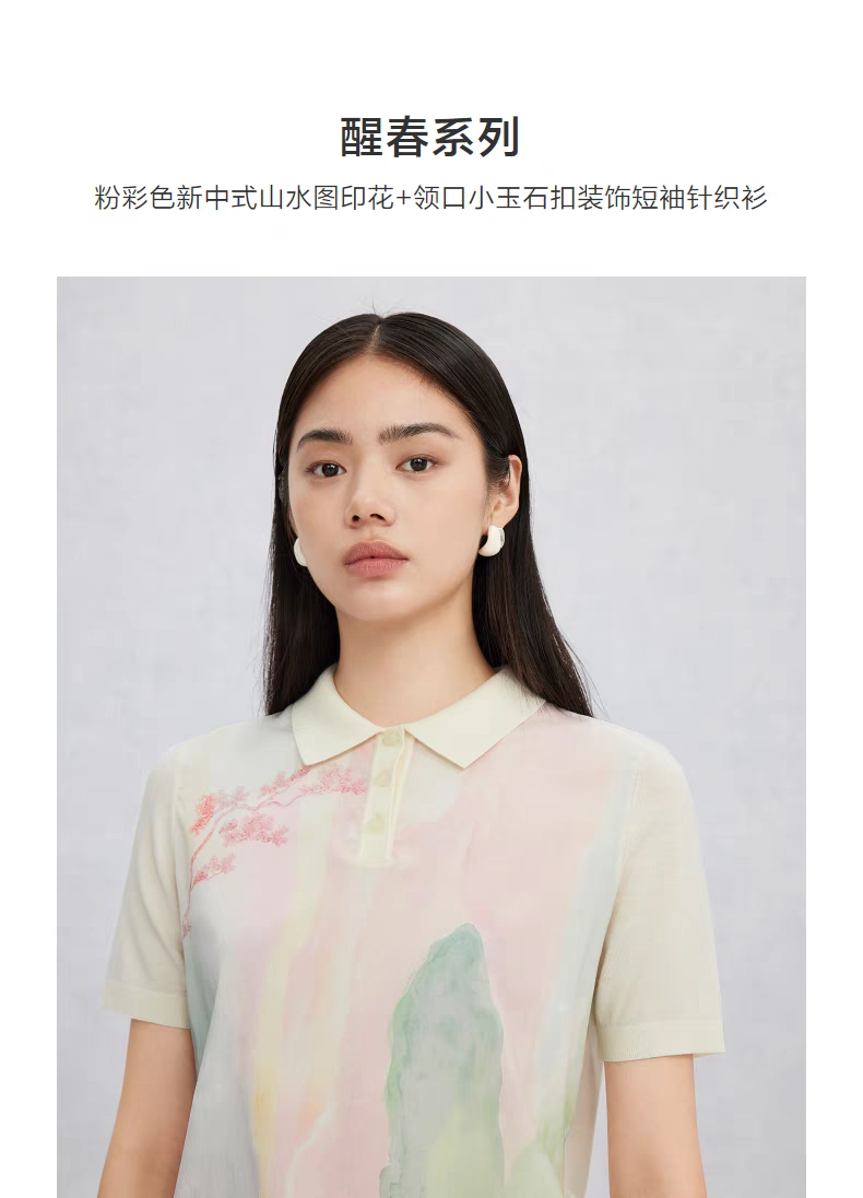 鄂尔多斯1980新品精纺羊毛蚕丝翻领玉石扣印花短袖女针织衫25春夏