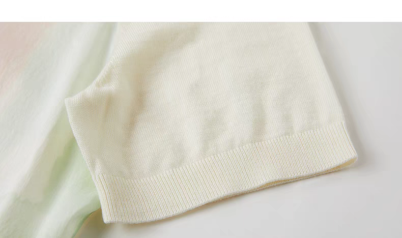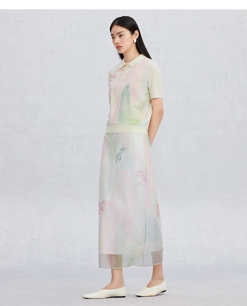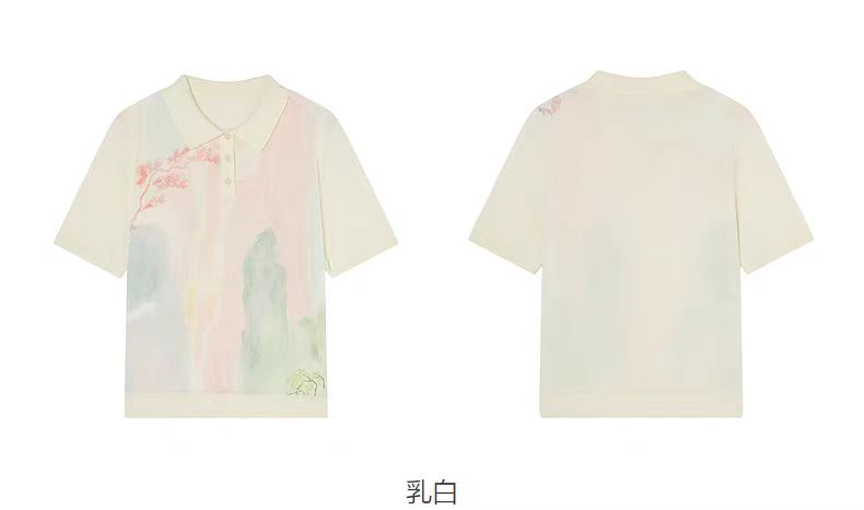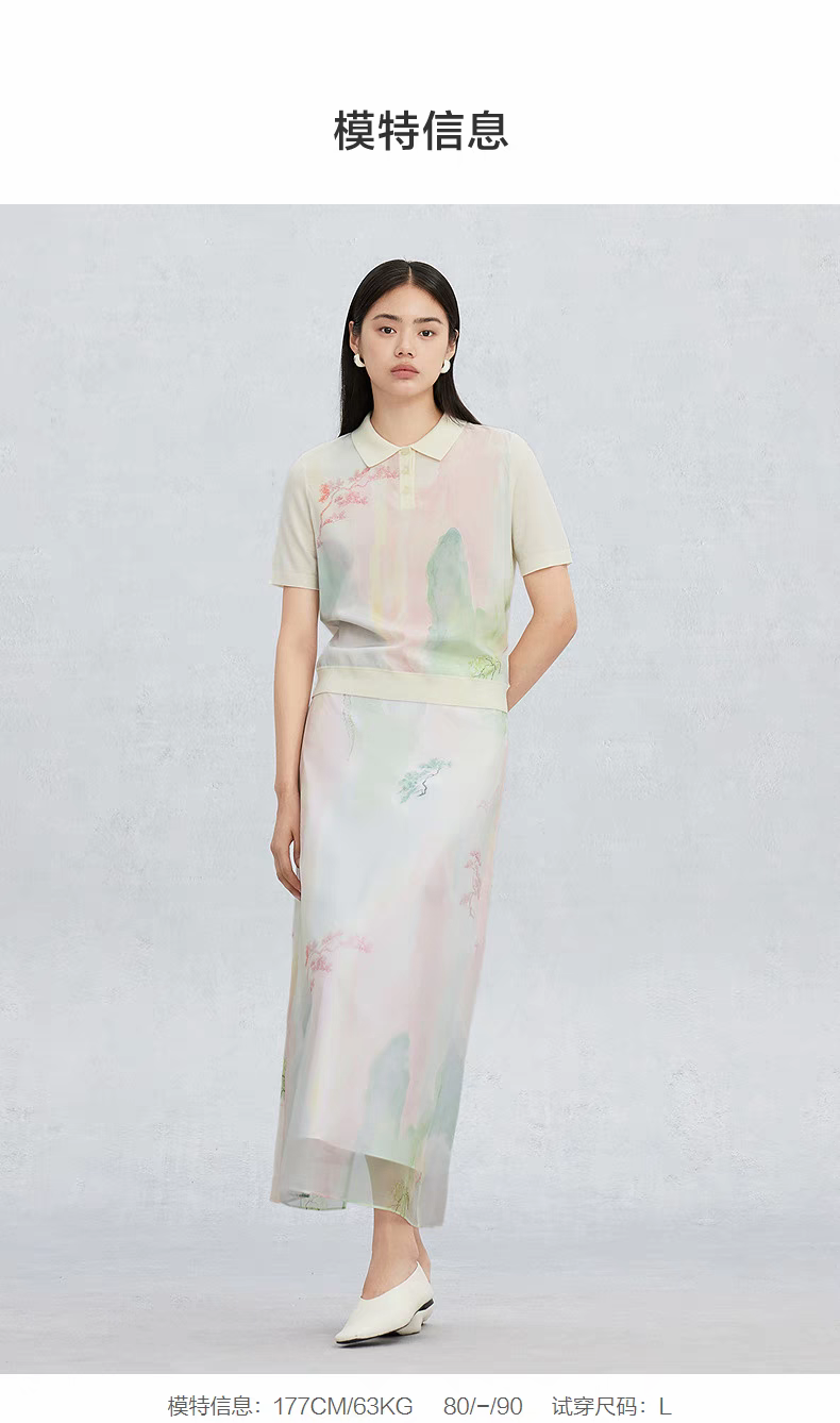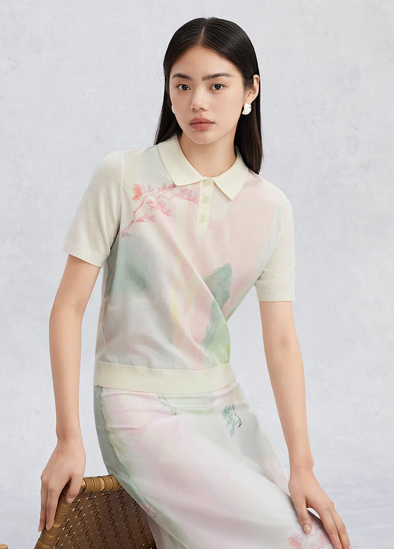 鄂尔多斯1980新品精纺羊毛蚕丝翻领玉石扣印花短袖女针织衫25春夏