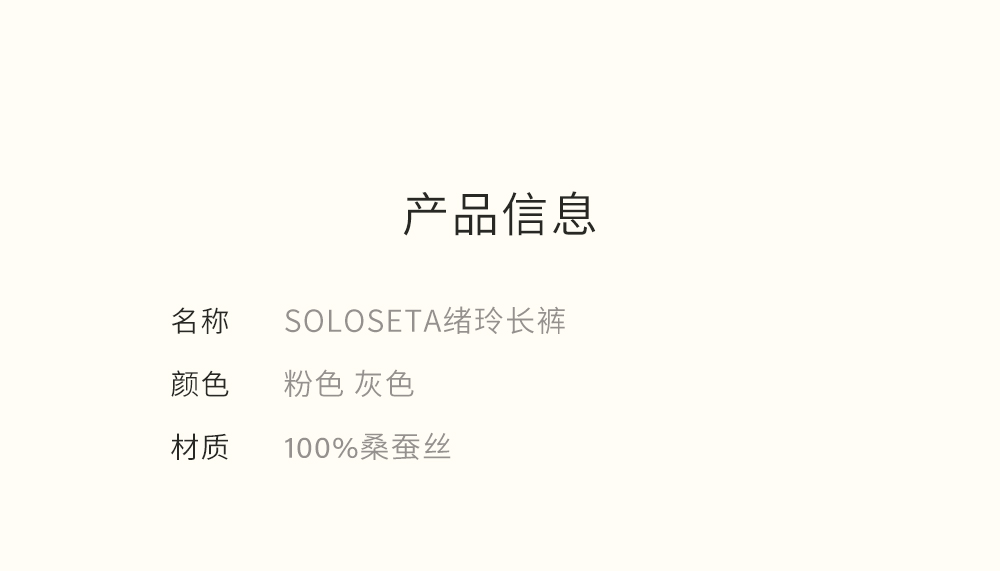 - soloseta专注于真丝织物,灵感源自意大利语,中文含义为“只做真丝”的意思。让睡衣变时尚,居家和外出瞬间切换,使其更具有出街,度假,参加宴会等功能。