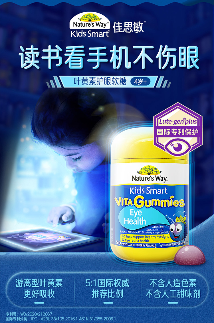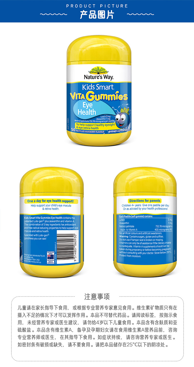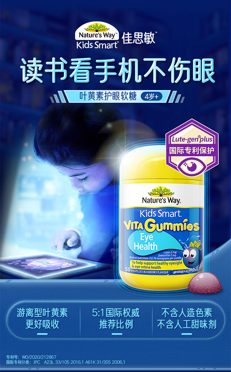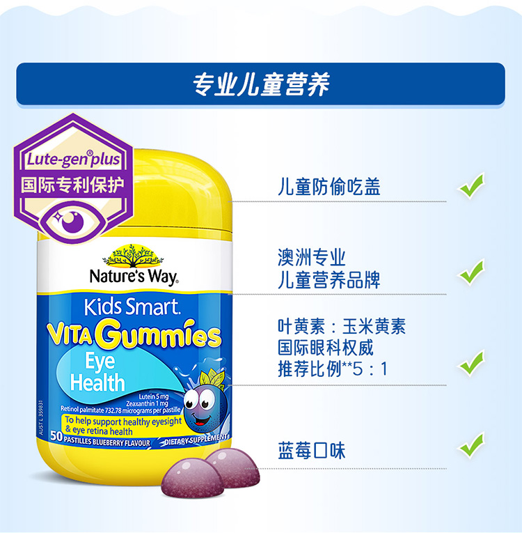 【跨境】Nature's way 澳洲佳思敏儿童专业叶黄素软糖蓝莓维生素A50粒(26年6月)