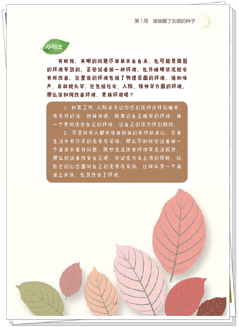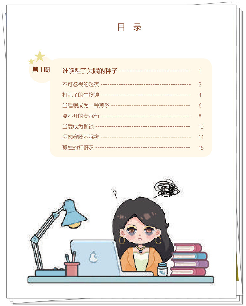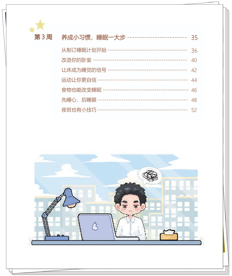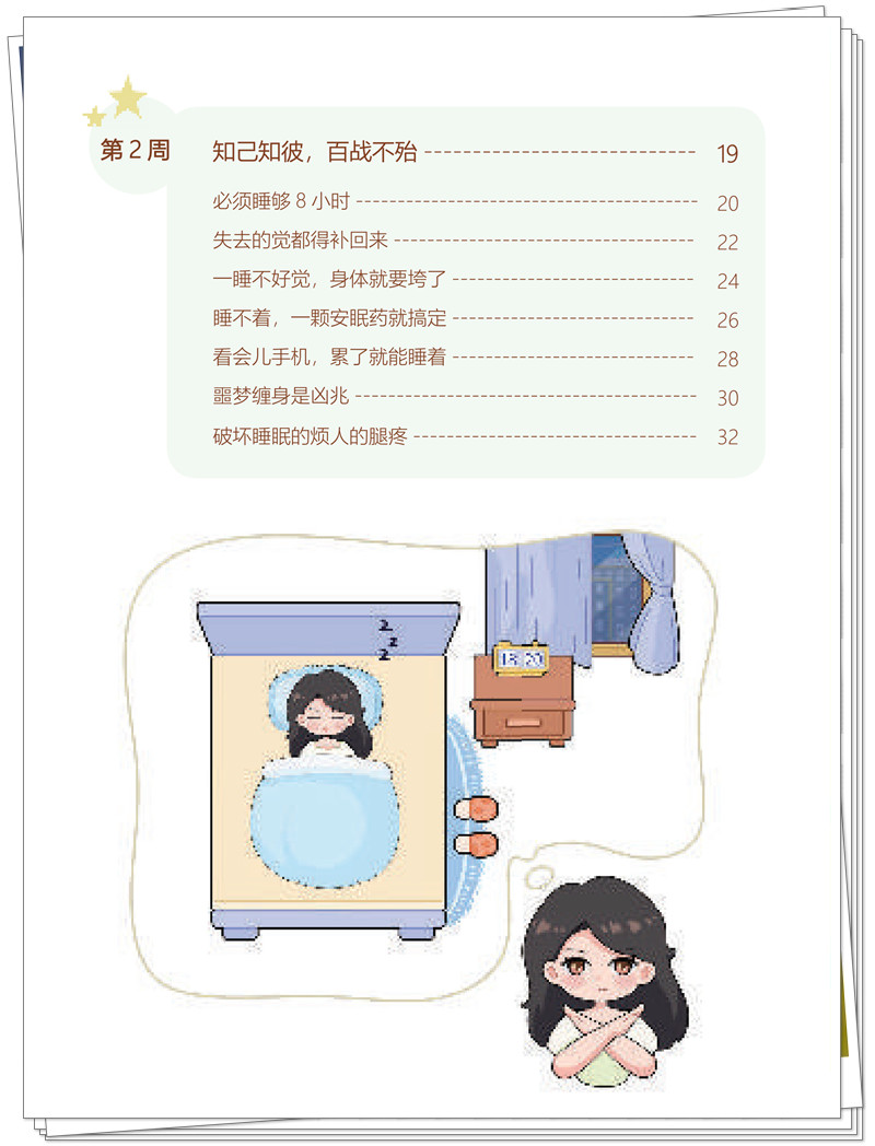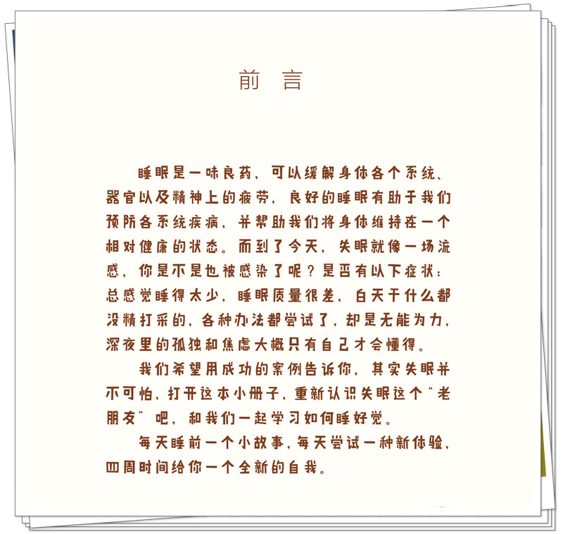 这本书旨在通过每天一个故事的形式,帮助读者养成良好的睡眠习惯。第一周帮助读者找寻失眠的病因,第二周纠正读者对失眠的错误认知,第三周提供一些切实有效的方法帮助读者走出失眠困境,第四周学习一些来自于传统中医的生活小常识,文字力求简洁、生动,内容严格依据科学证据及相关指南,并附漫画形式的配图,增加趣味性。这是一本科普书,也是一本辅助临床治疗及自我疗愈的书,我们相信睡眠不仅是人的本能,也是一味良药,可以同时治愈身体与心灵的创伤。
