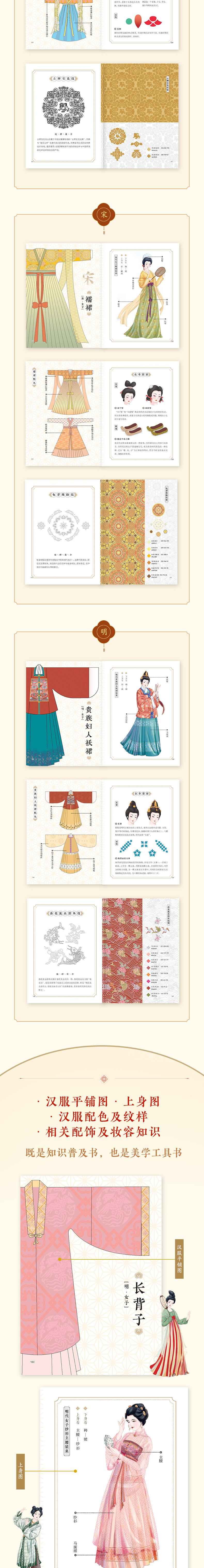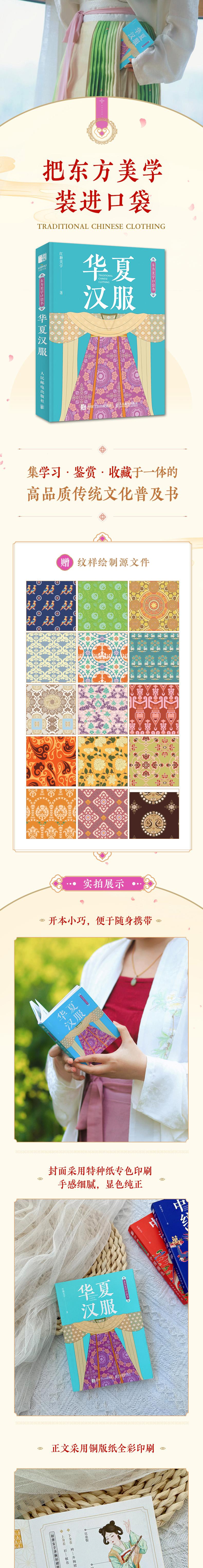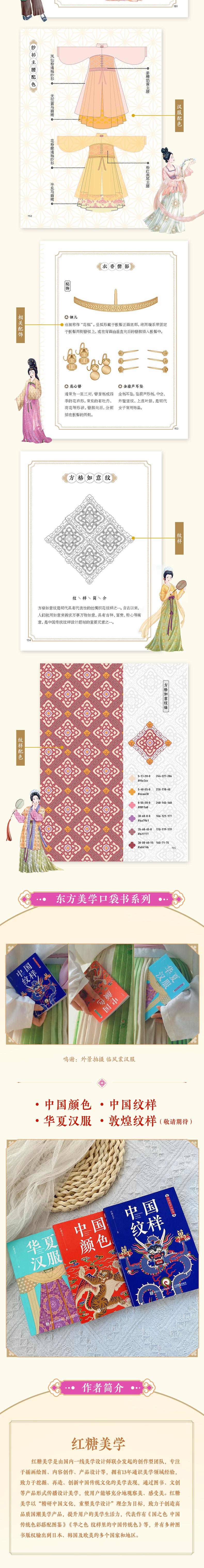 (1)可以装进口袋的传统文化普及书,64开本(约手掌大小),从封面到内文精心设计,随时随地进入东方美学世界 (2)小小一册,内容丰富,5个朝代,31种汉服形制,31种纹样普及,124种汉服配色,124种配饰及古代妆容介绍 (3)装帧精美,封面采用特种纸专色印刷,内文采用无光铜全彩印刷,体现国潮风雅,诠释东方之美