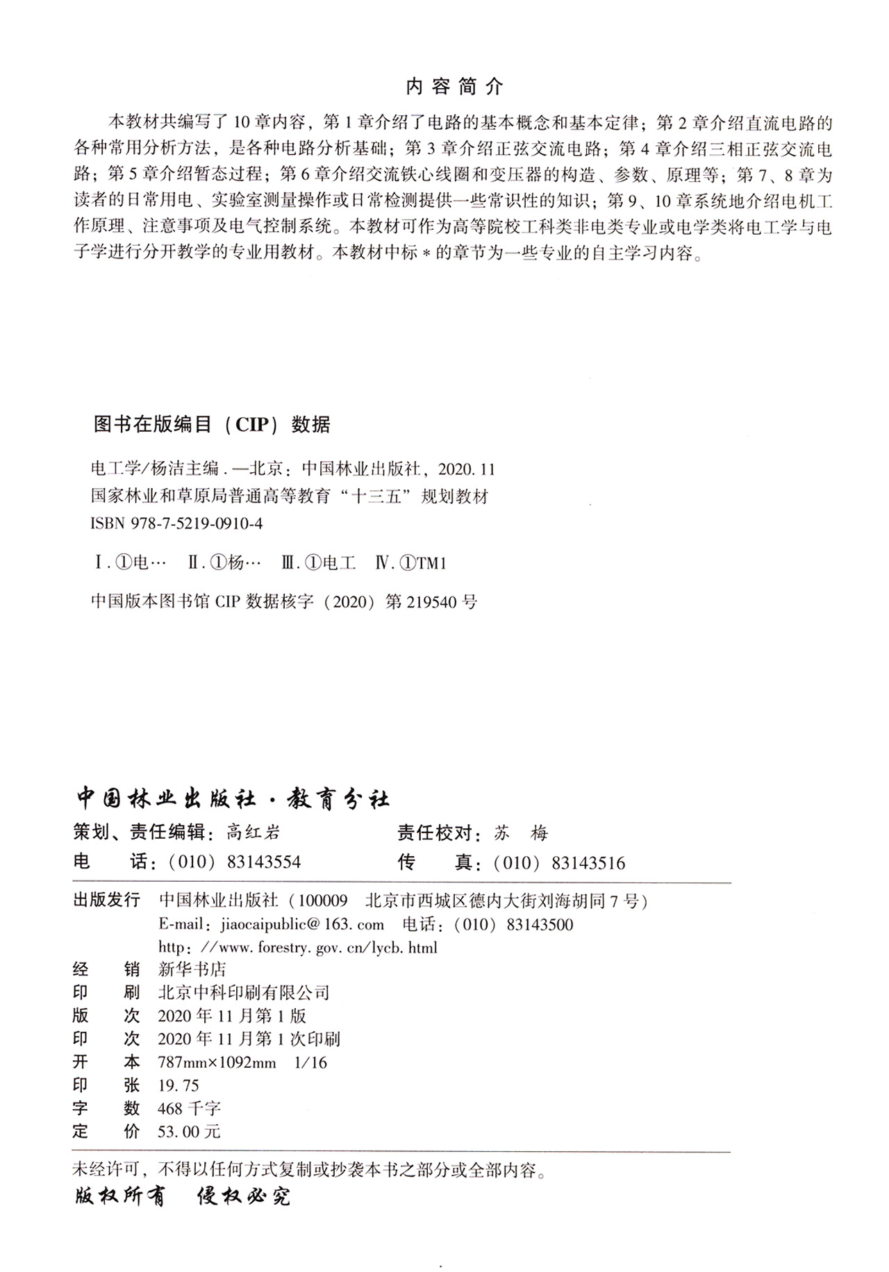 电工学(国家林业和草原局普通高等教育十三五规划教材) 杨洁 0910 中国林业出版社