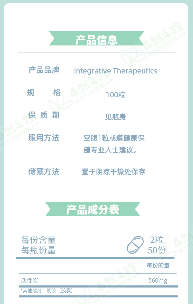 美国Integrative Therapeutics 活性炭activated charcoal100粒