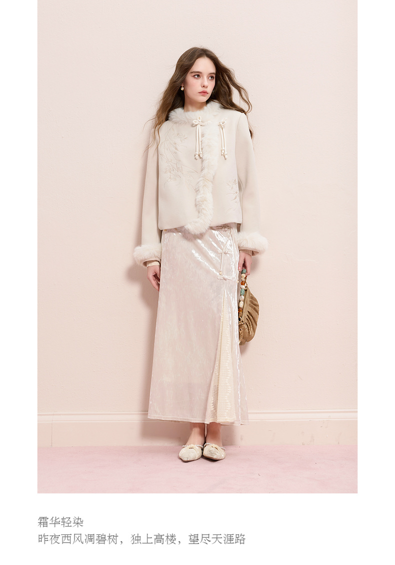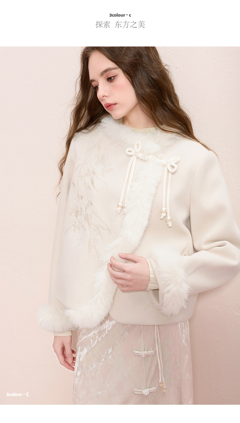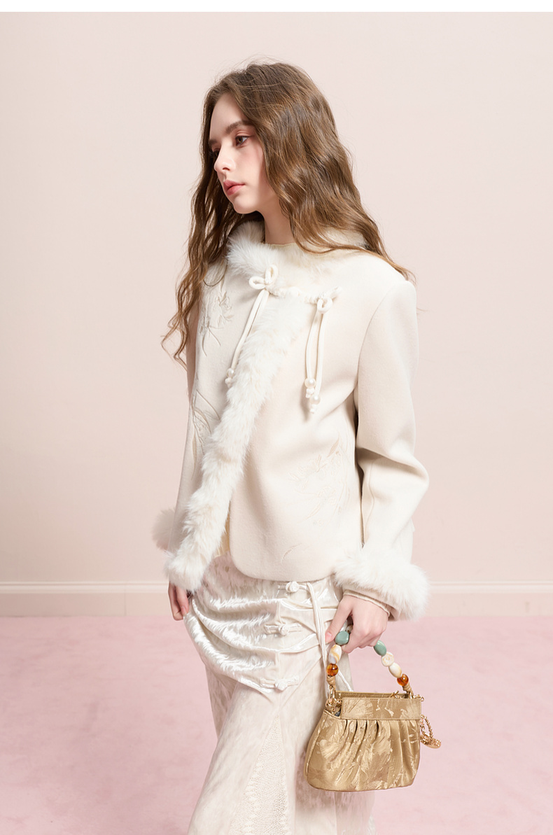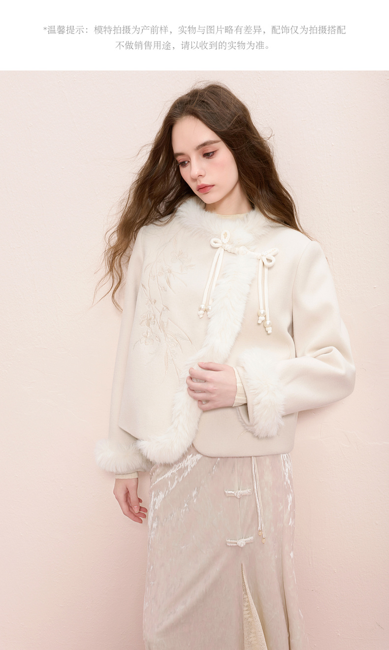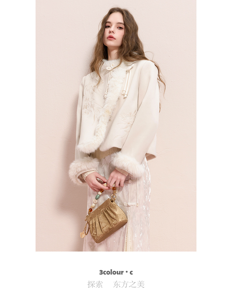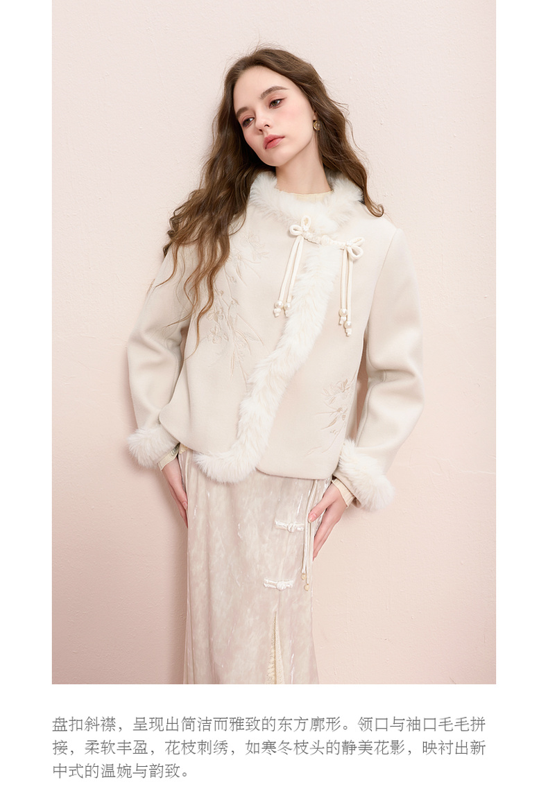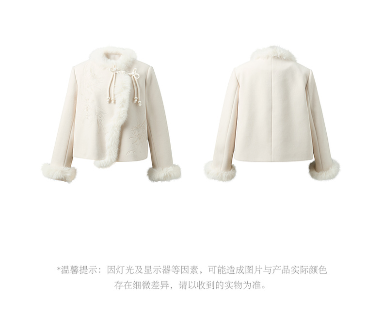 三彩【霜华轻染】2025冬季新款呢大衣绣花盘扣毛呢外套宽松短款C