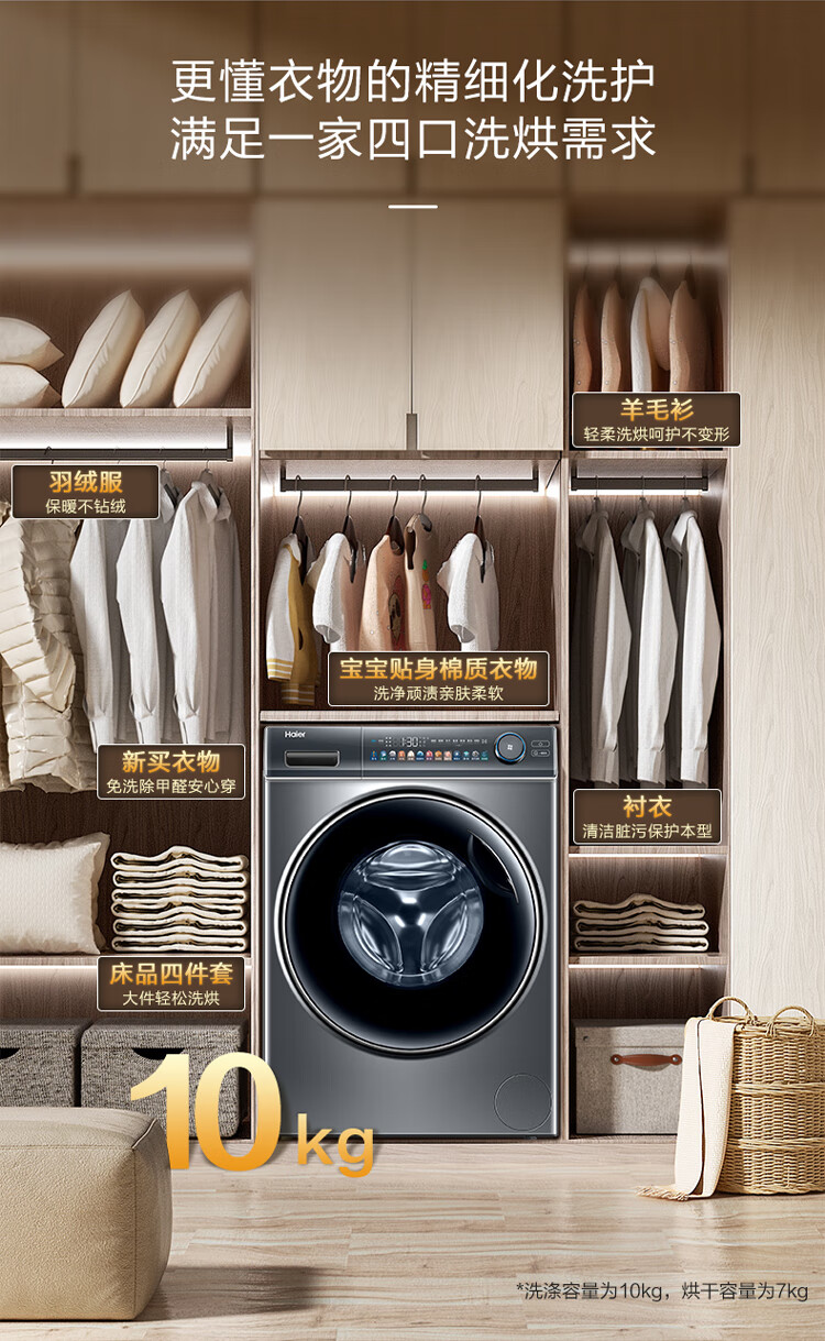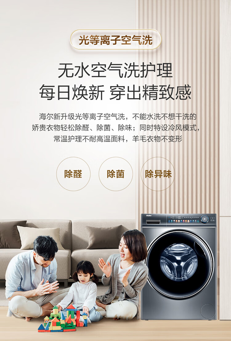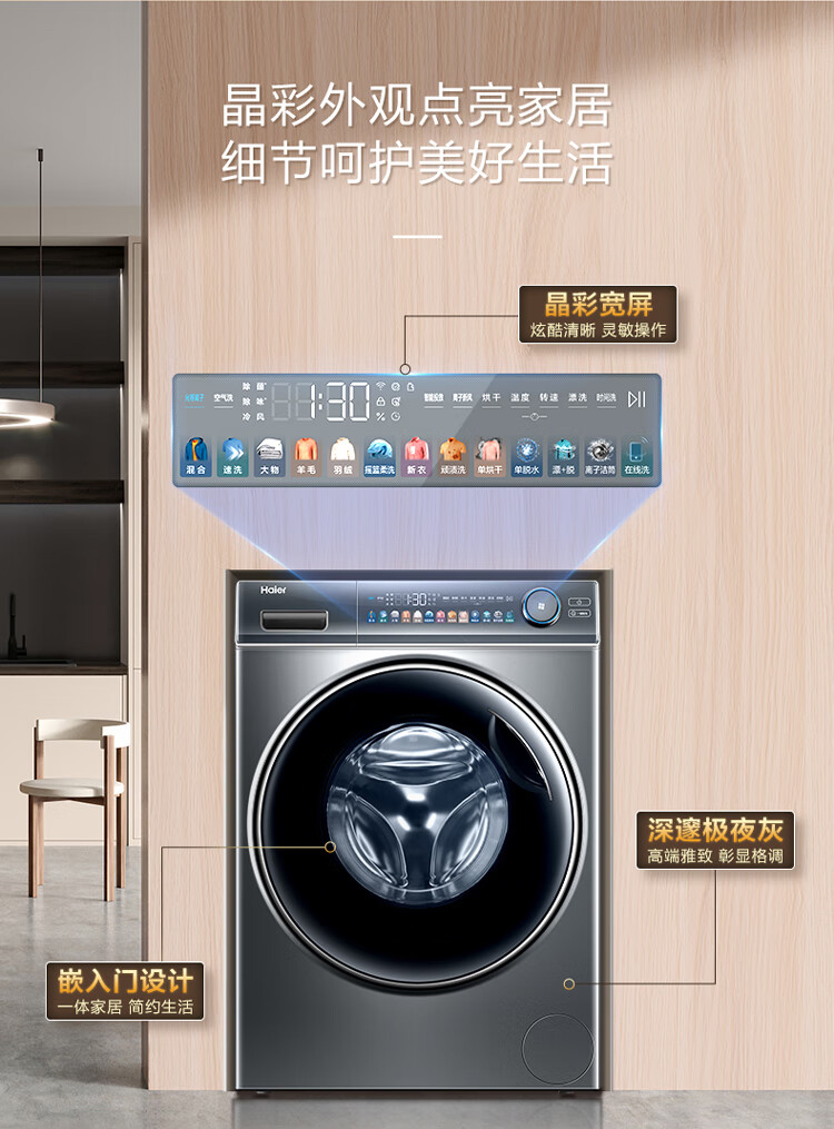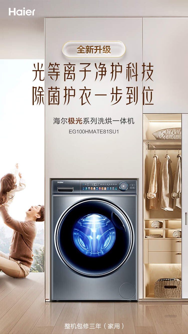 海尔(Haier)光等离子洗衣 10公斤平嵌洗烘一体 彩屏直驱变频 滚筒洗衣全自动 智能投放EG100HMATE81SU1