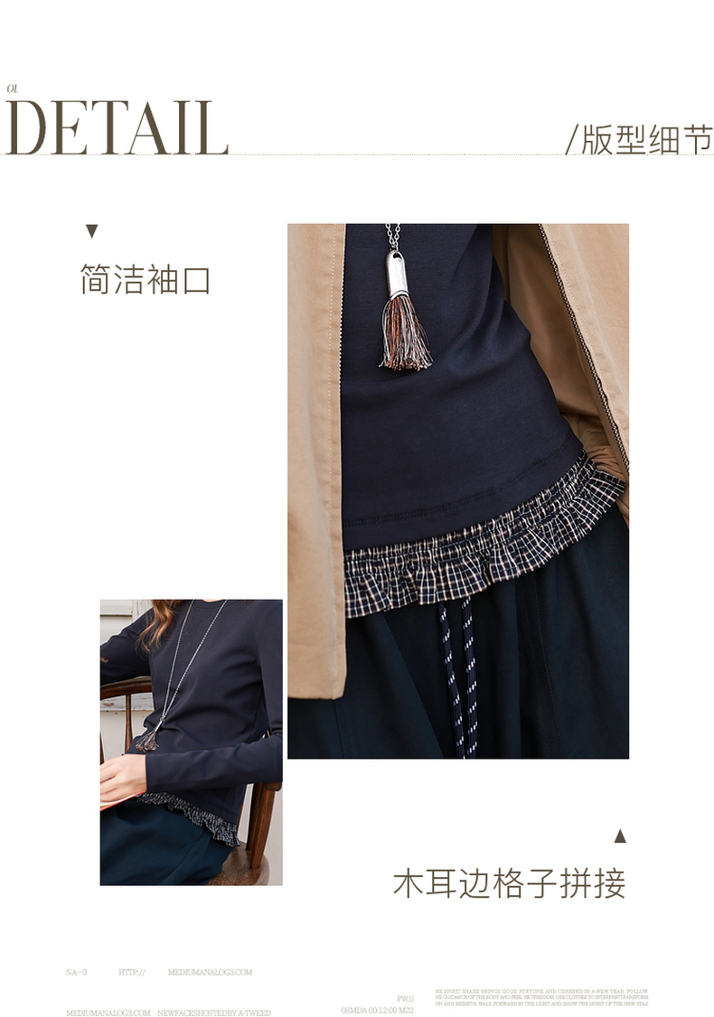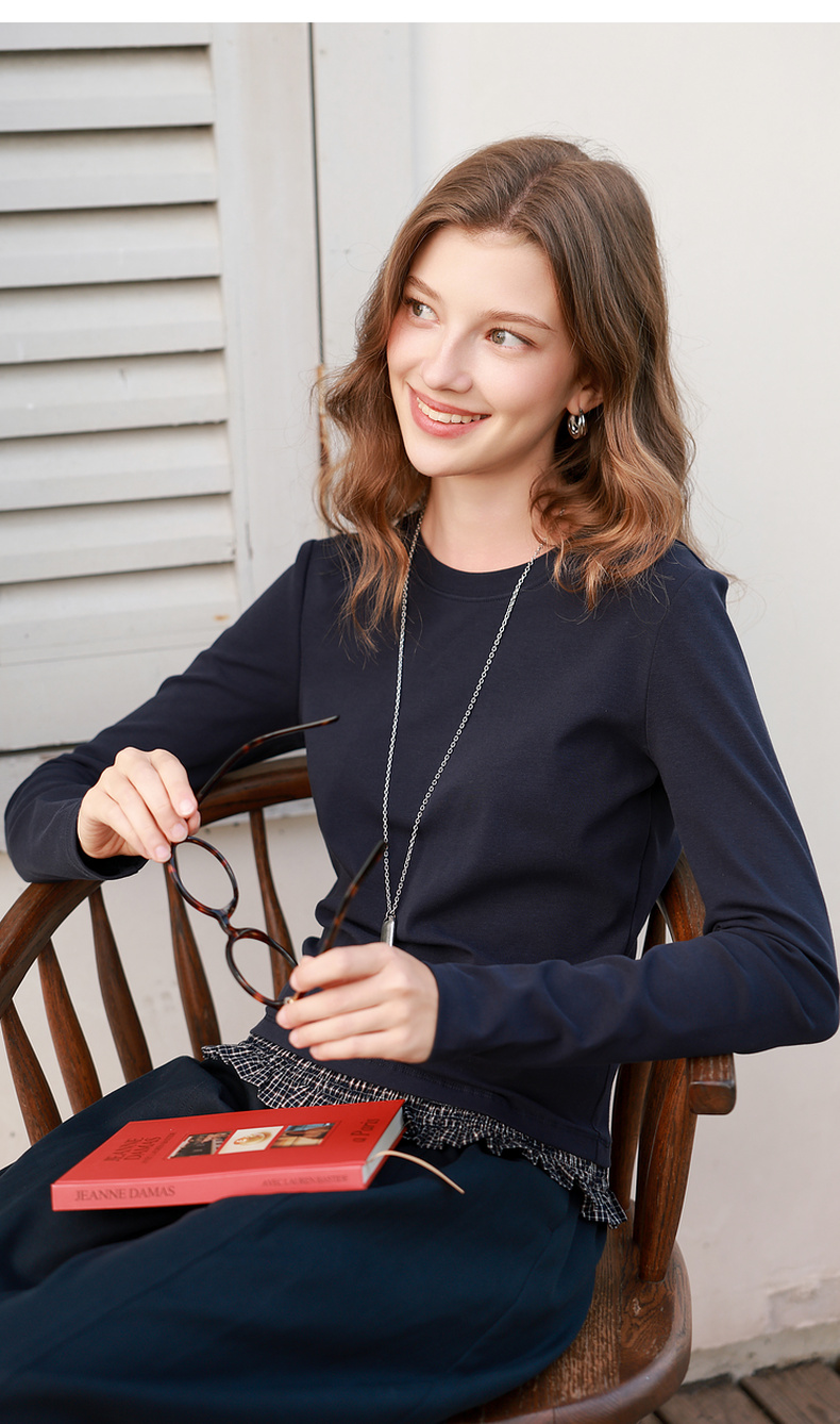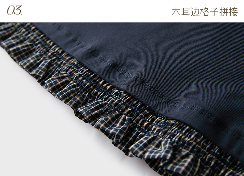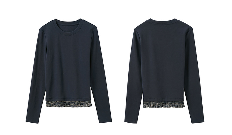 三彩2026春季新款木耳边格子拼接长袖打底衫T恤套头上衣修身M