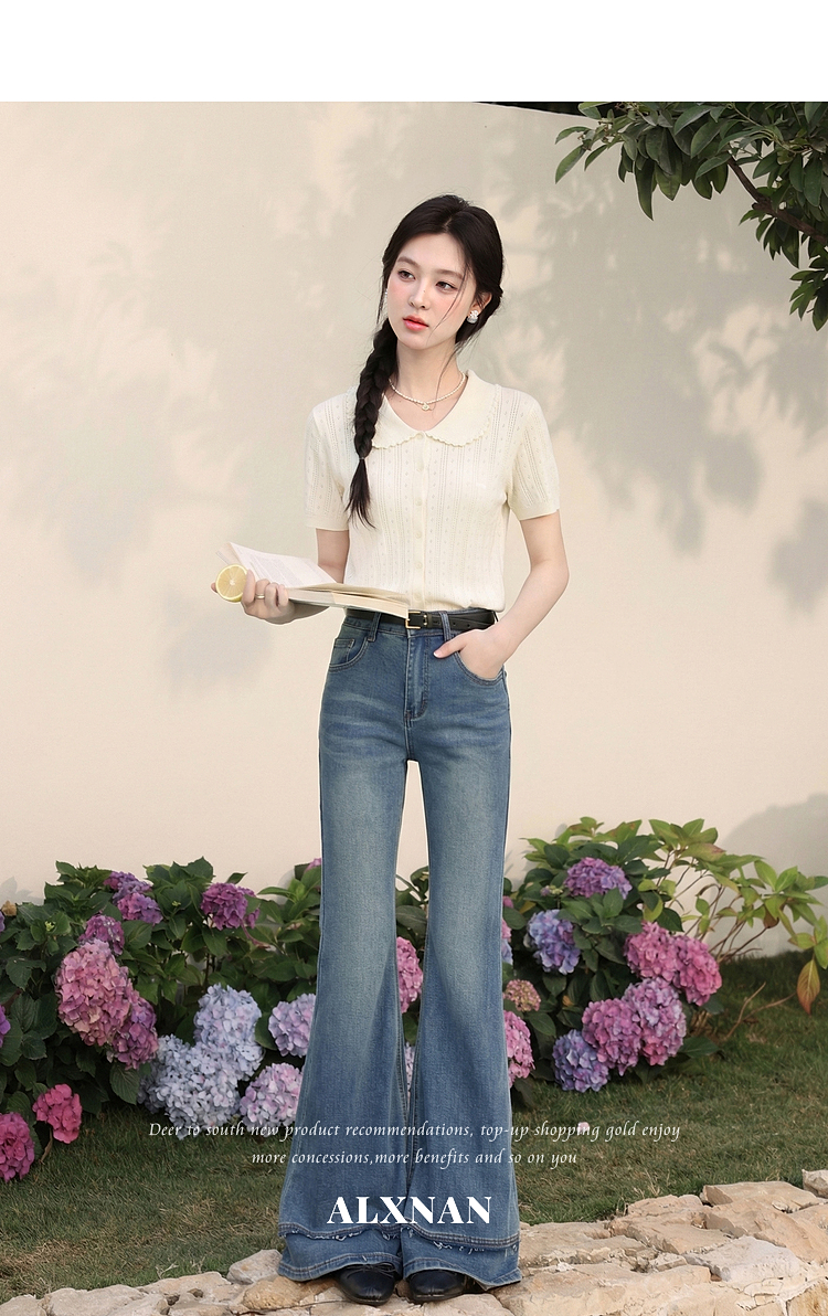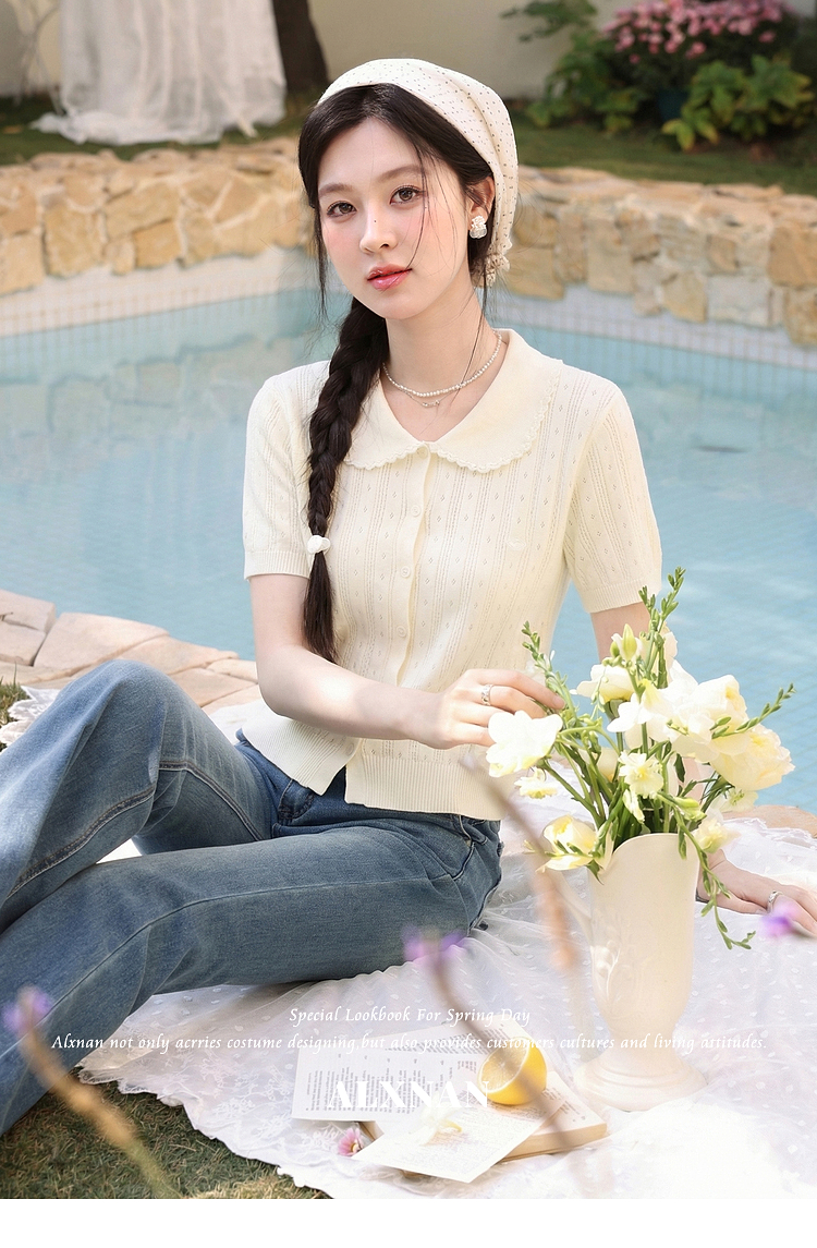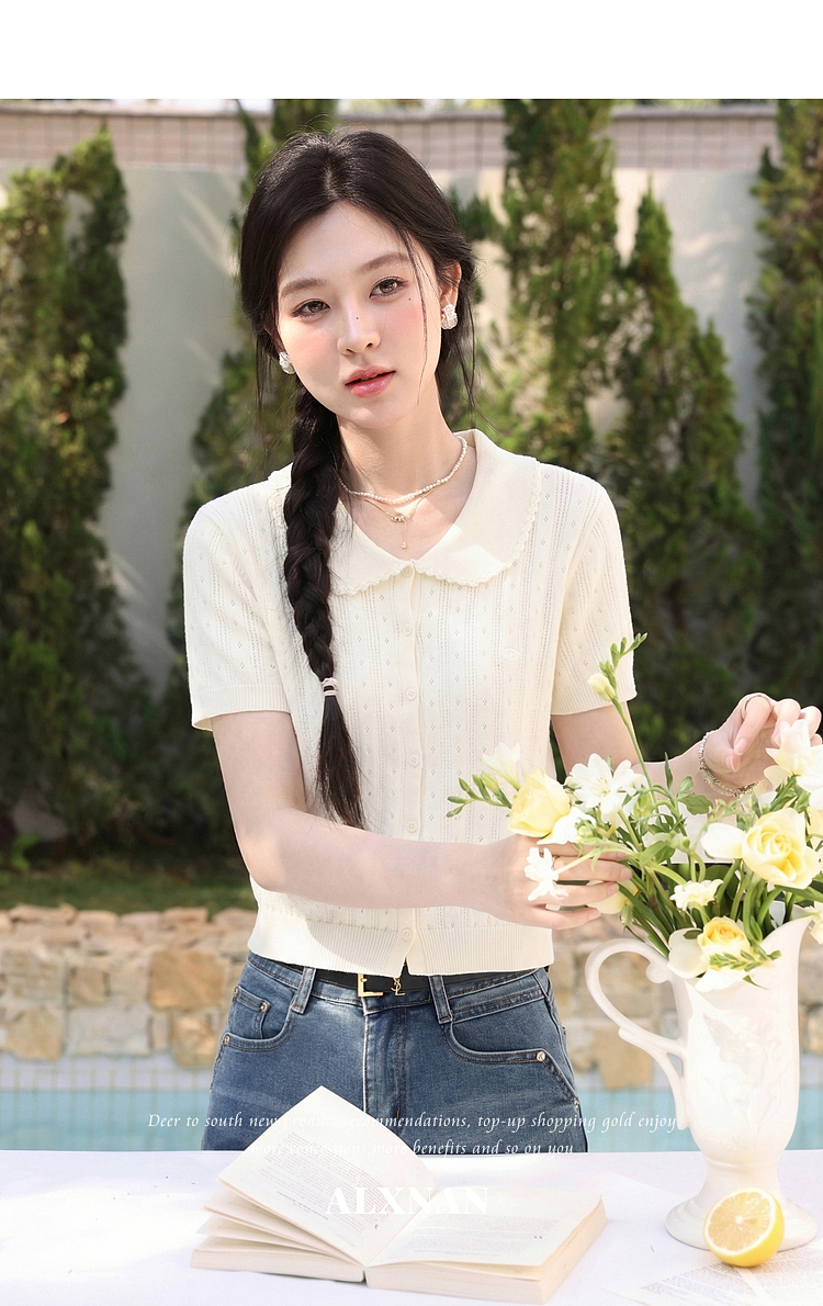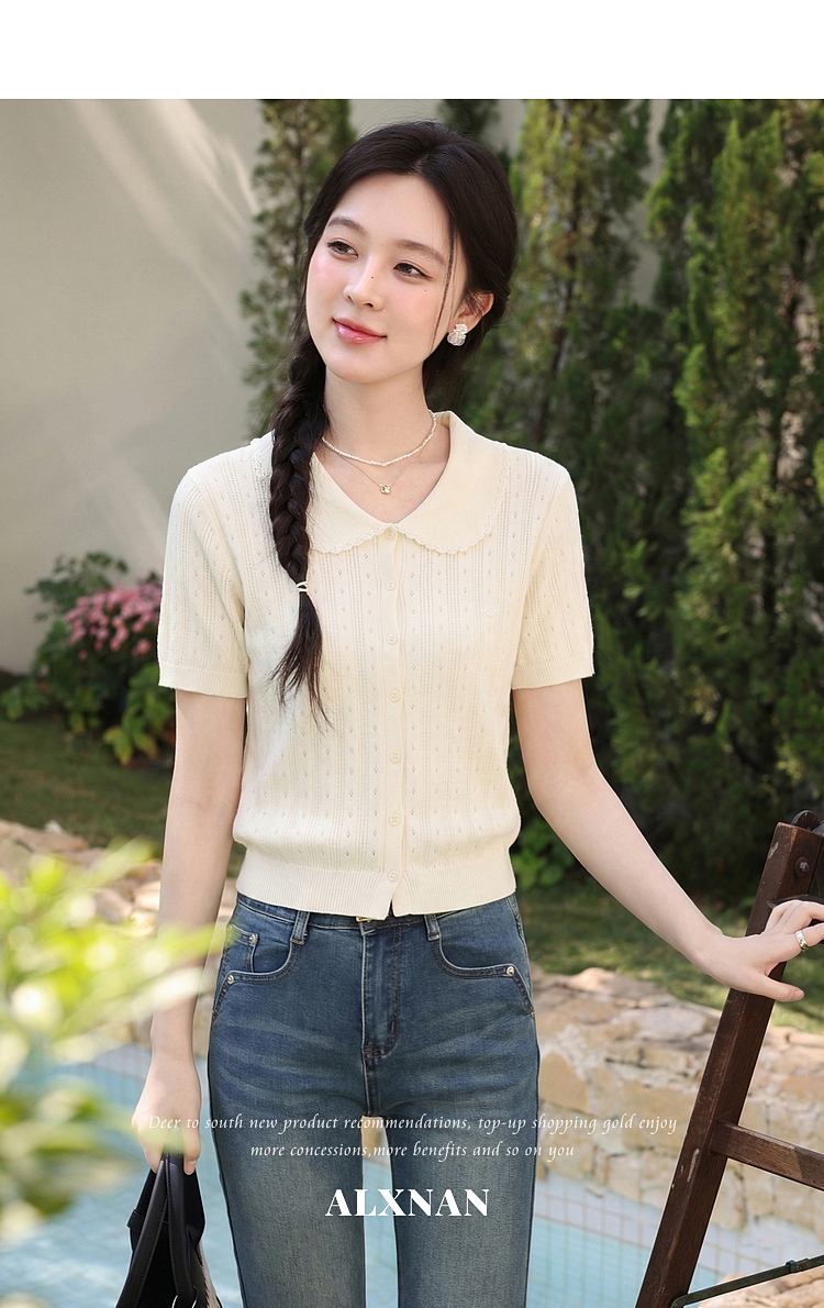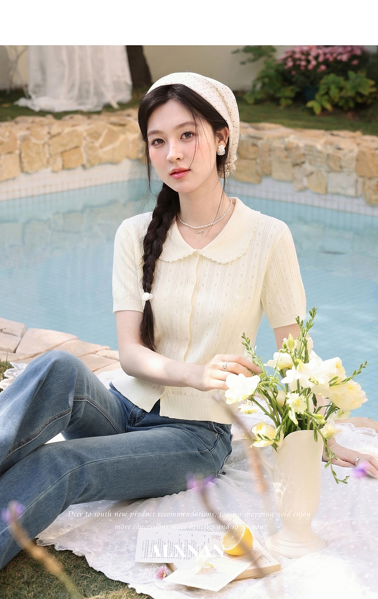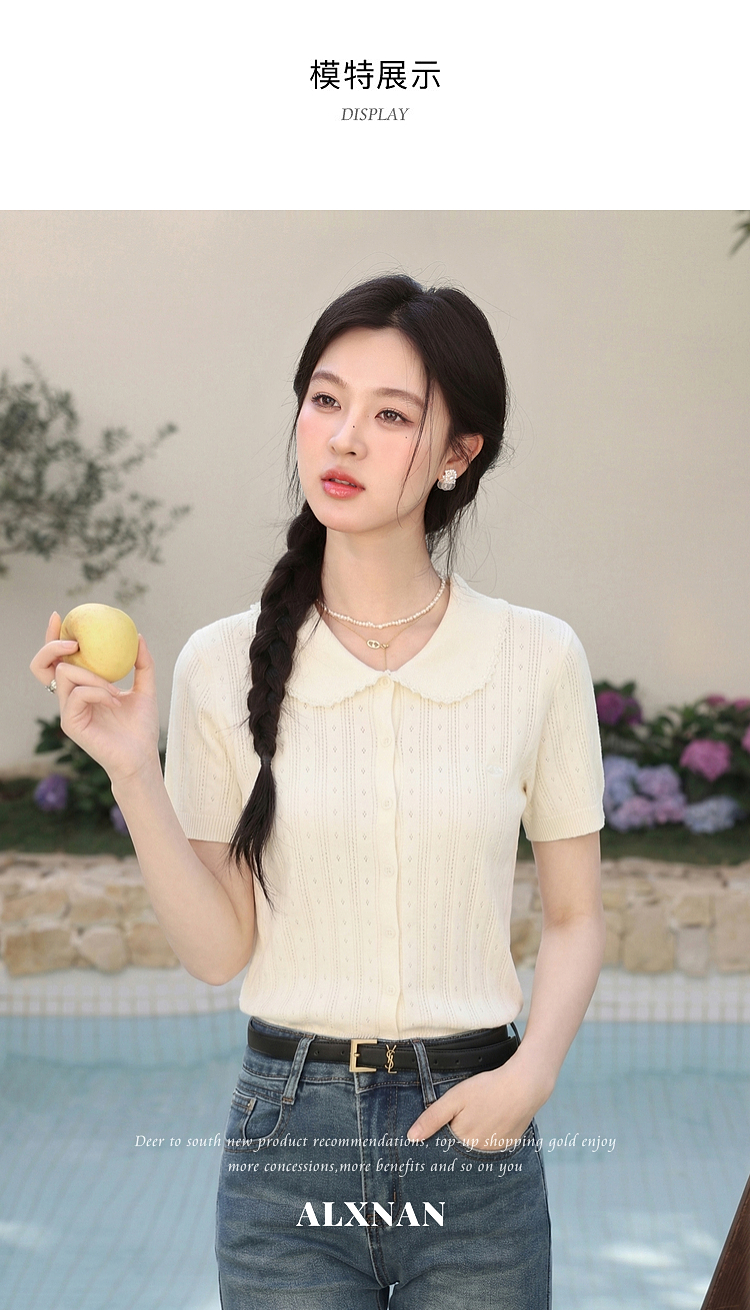 鹿向南「晴屿花眠」翻领白杏色针织衫上衣女夏季独特别致短袖T恤