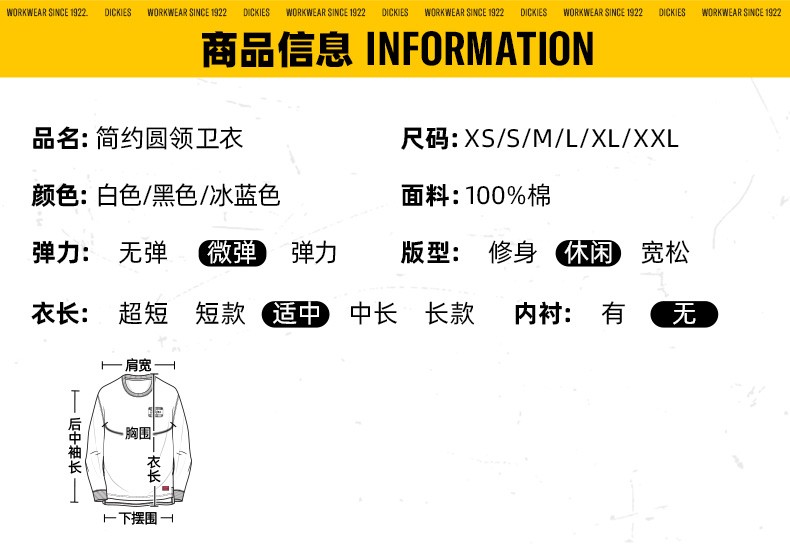 Dickies圆领休闲卫衣秋季小logo贴布绣美式宽松纯棉男女情侣装长袖