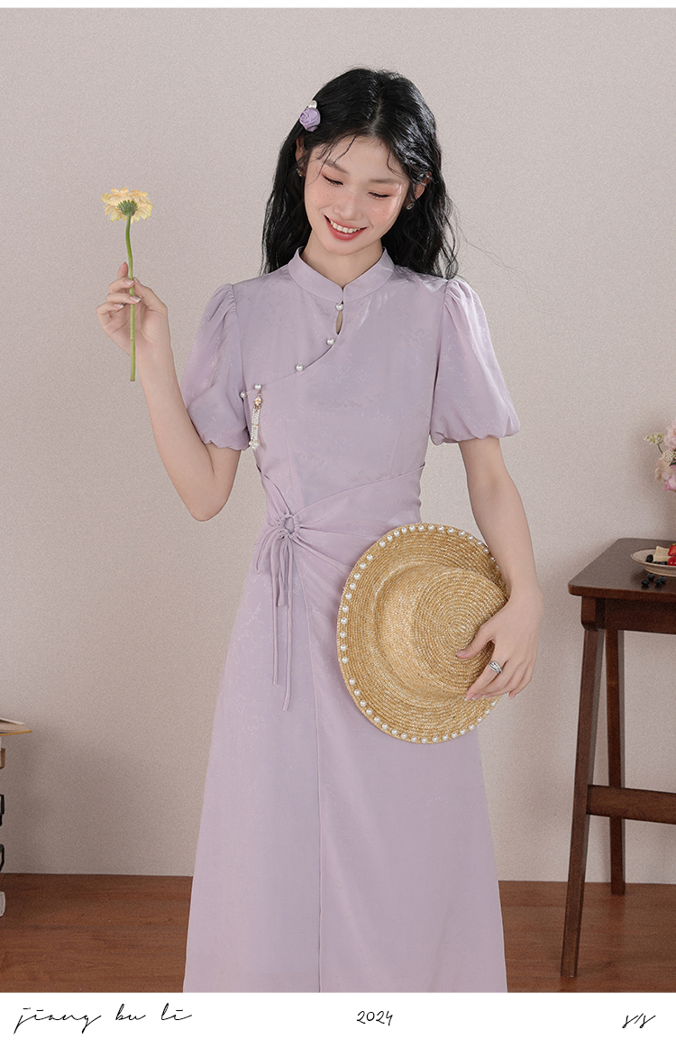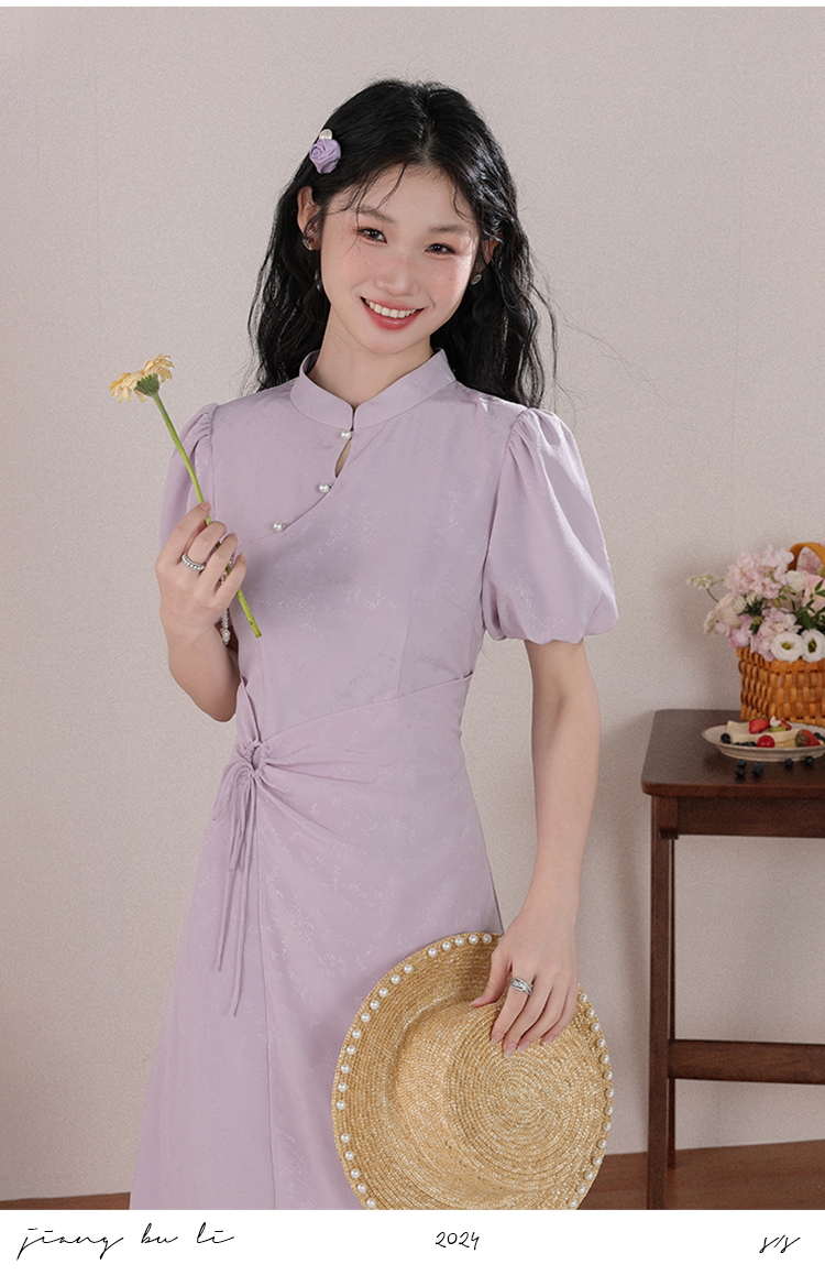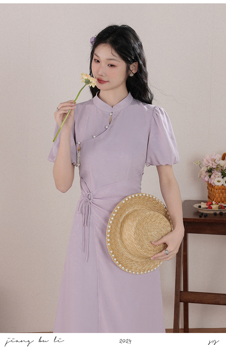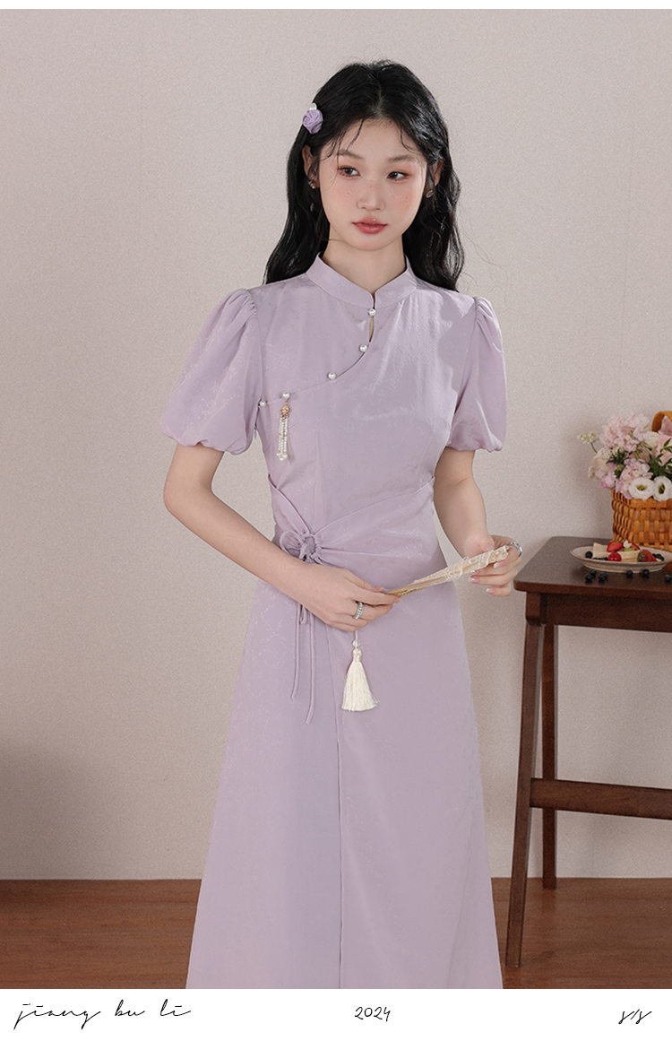 鹿向南【月光流萤】夏季紫色新中式连衣裙女改良旗袍收腰国风长裙