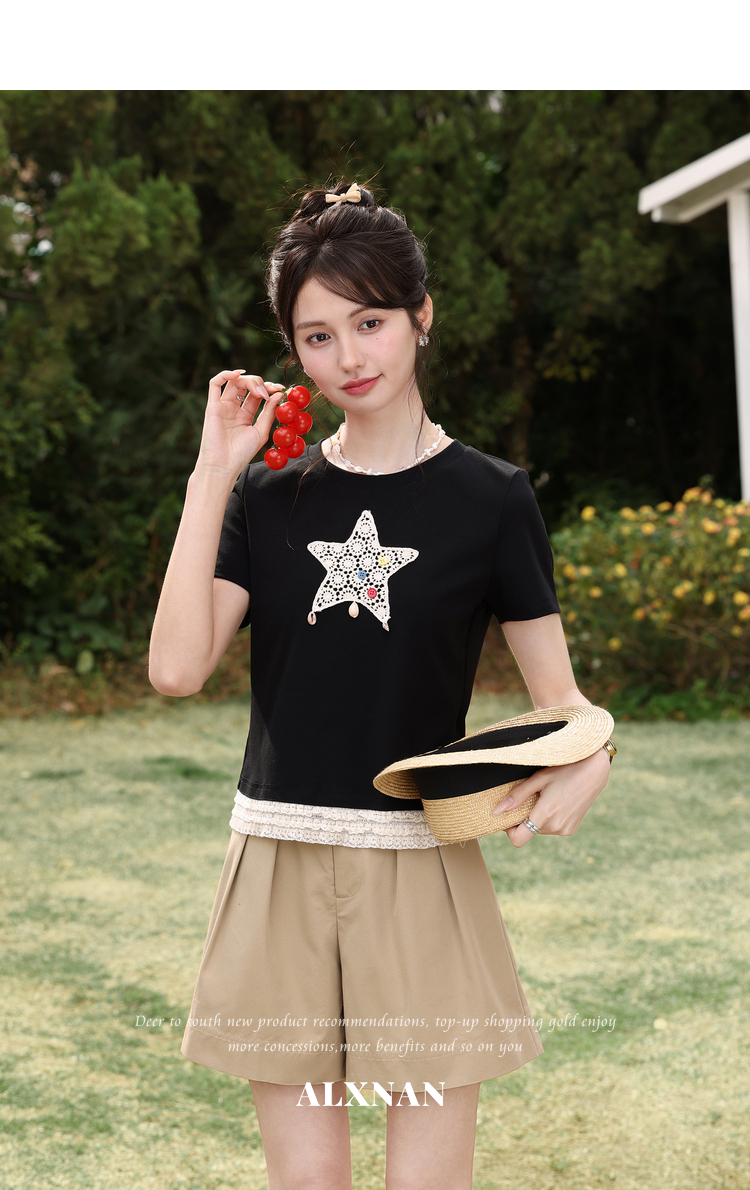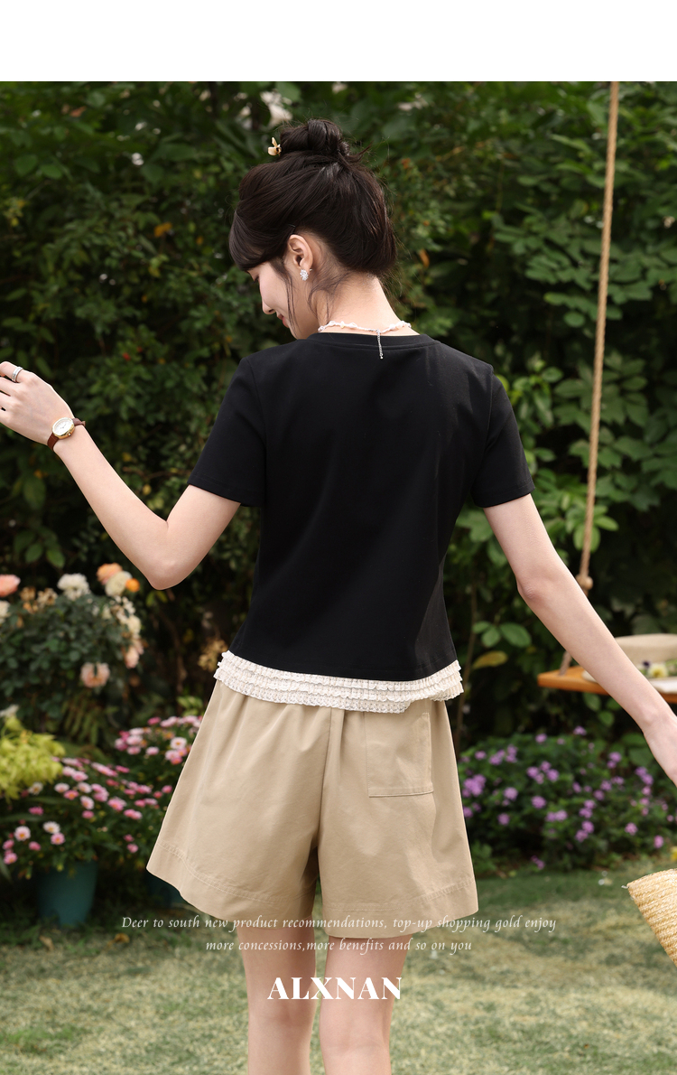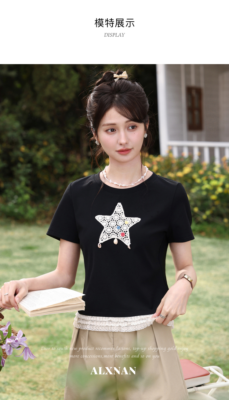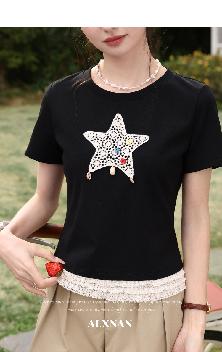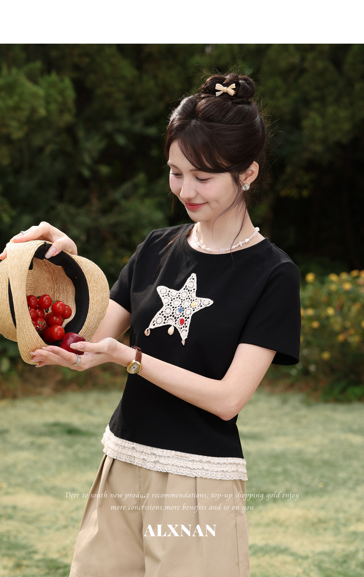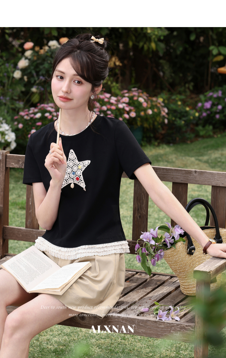 鹿向南「月光情诗」黑色短袖T恤女夏蕾丝拼接设计感时尚短款上衣