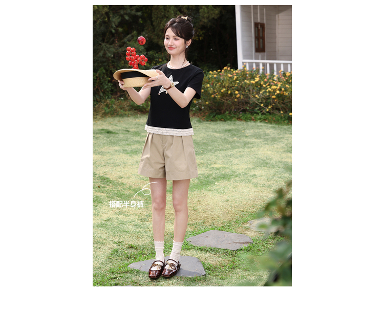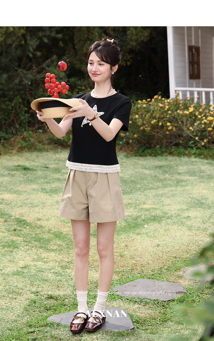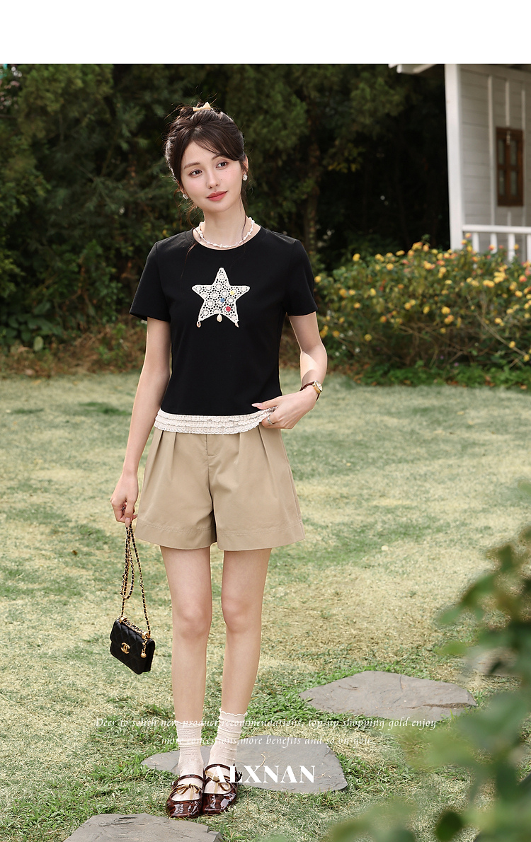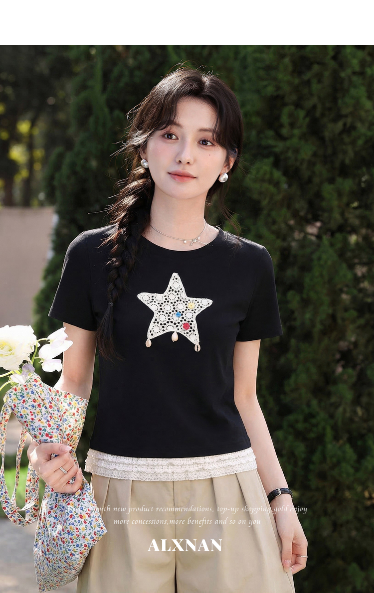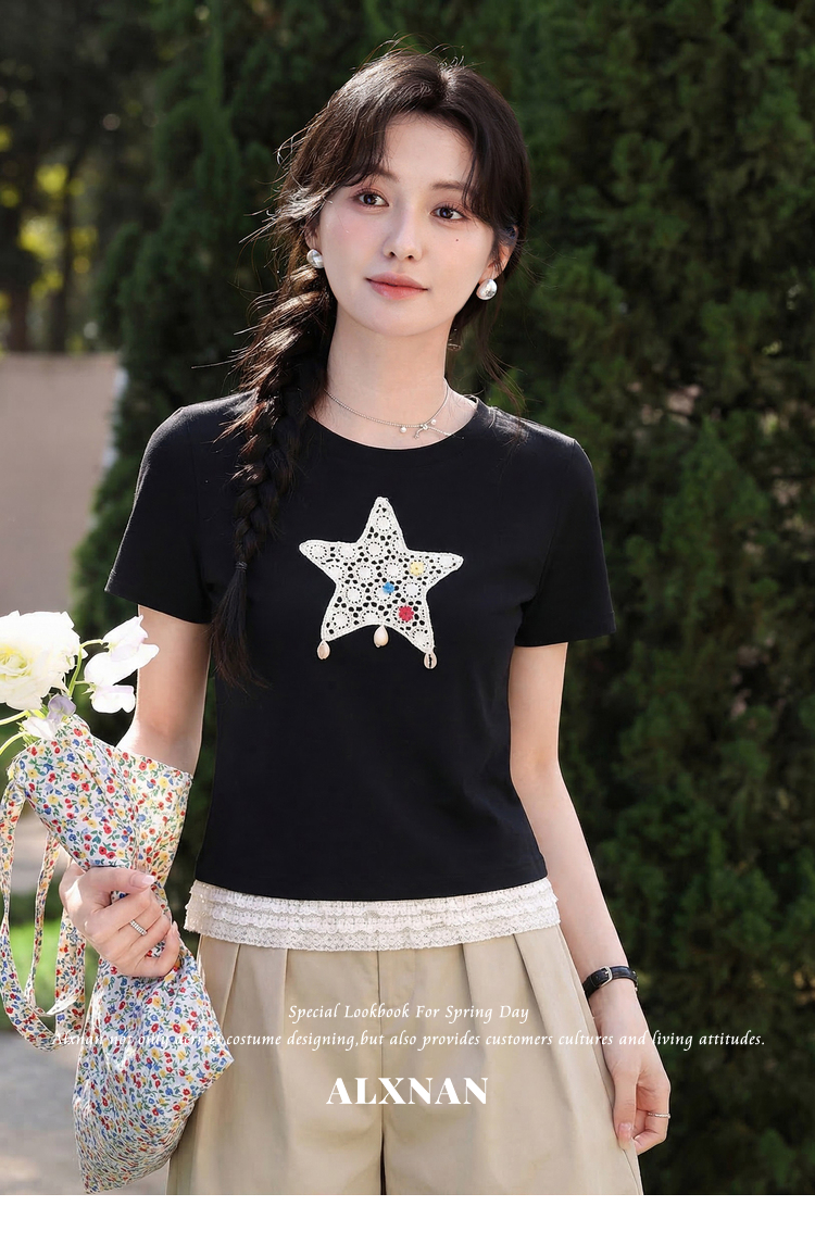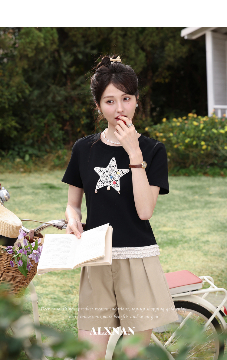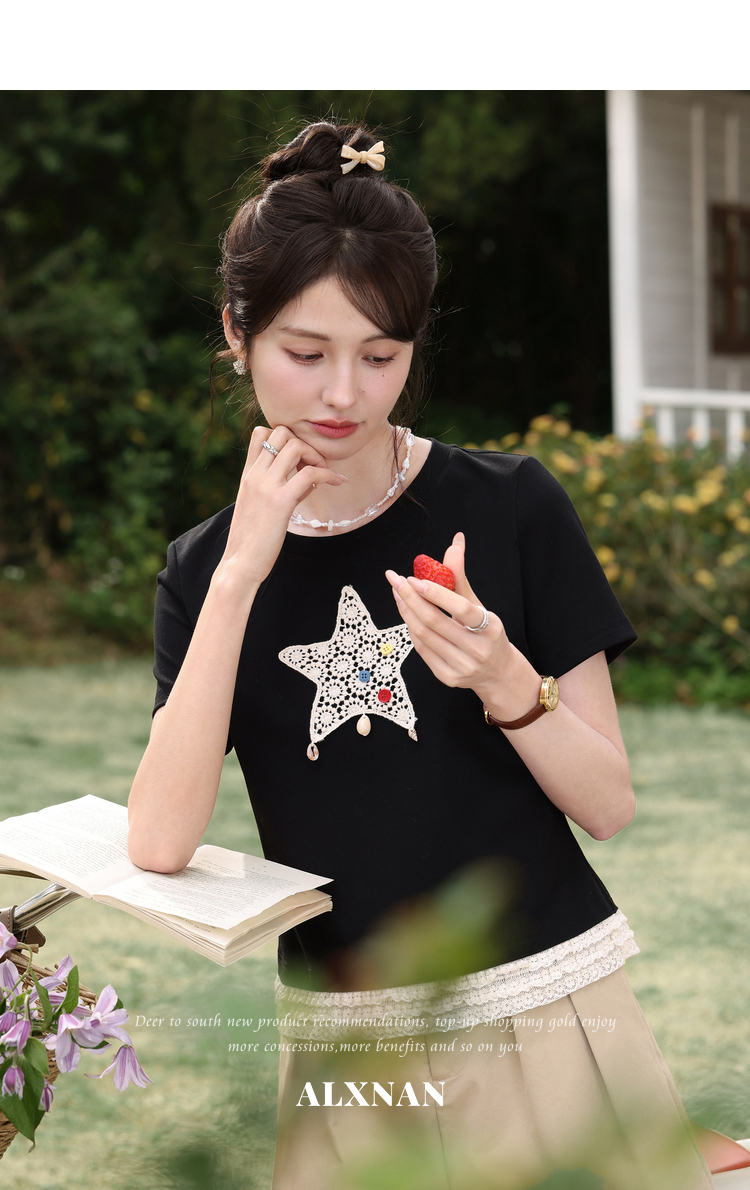 鹿向南「月光情诗」黑色短袖T恤女夏蕾丝拼接设计感时尚短款上衣