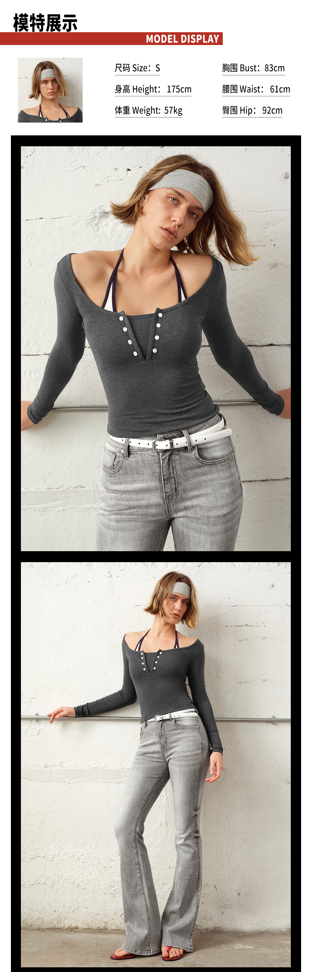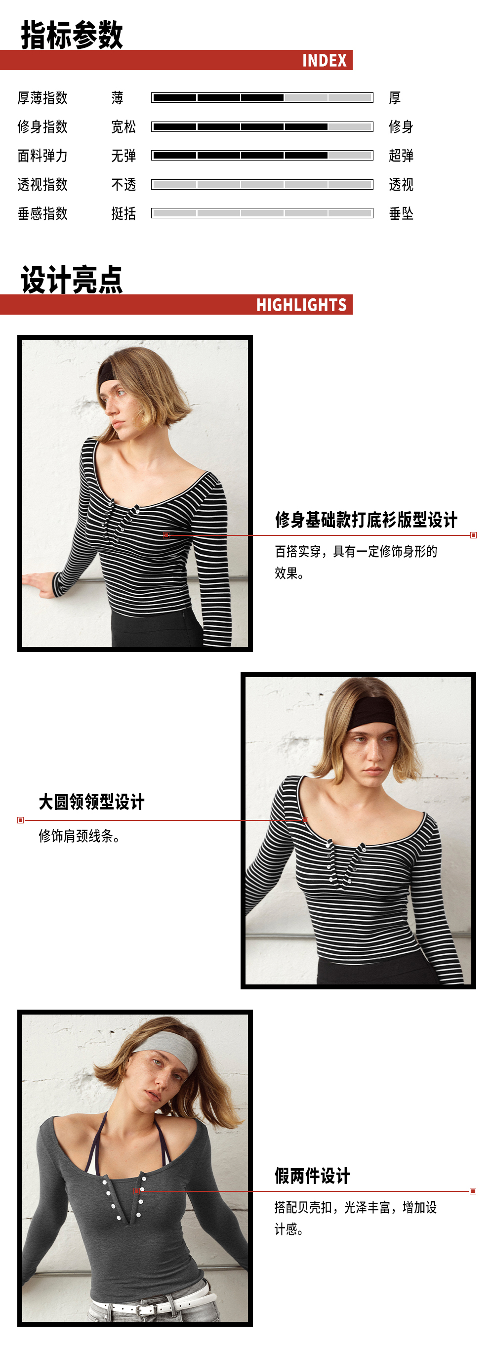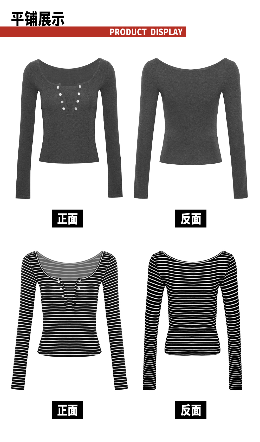 TR她热 松弛刻度 灰色条纹软糯假两件基础款百搭弹力打底衫上衣