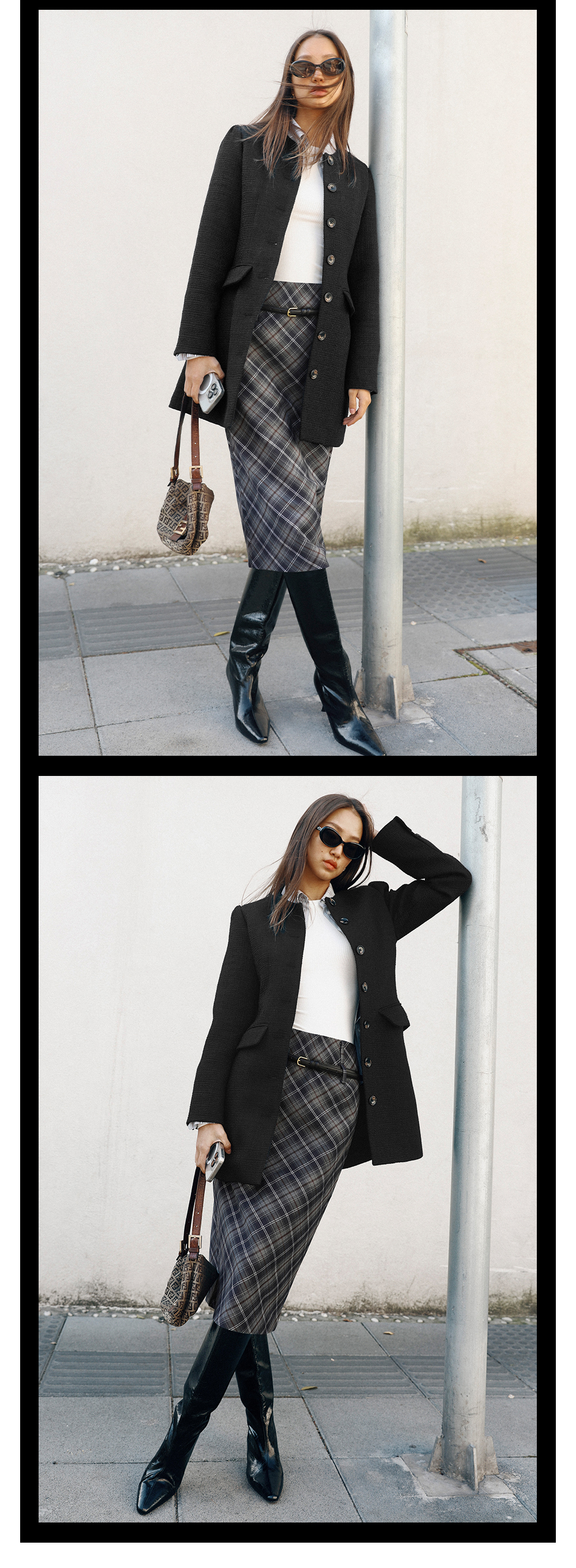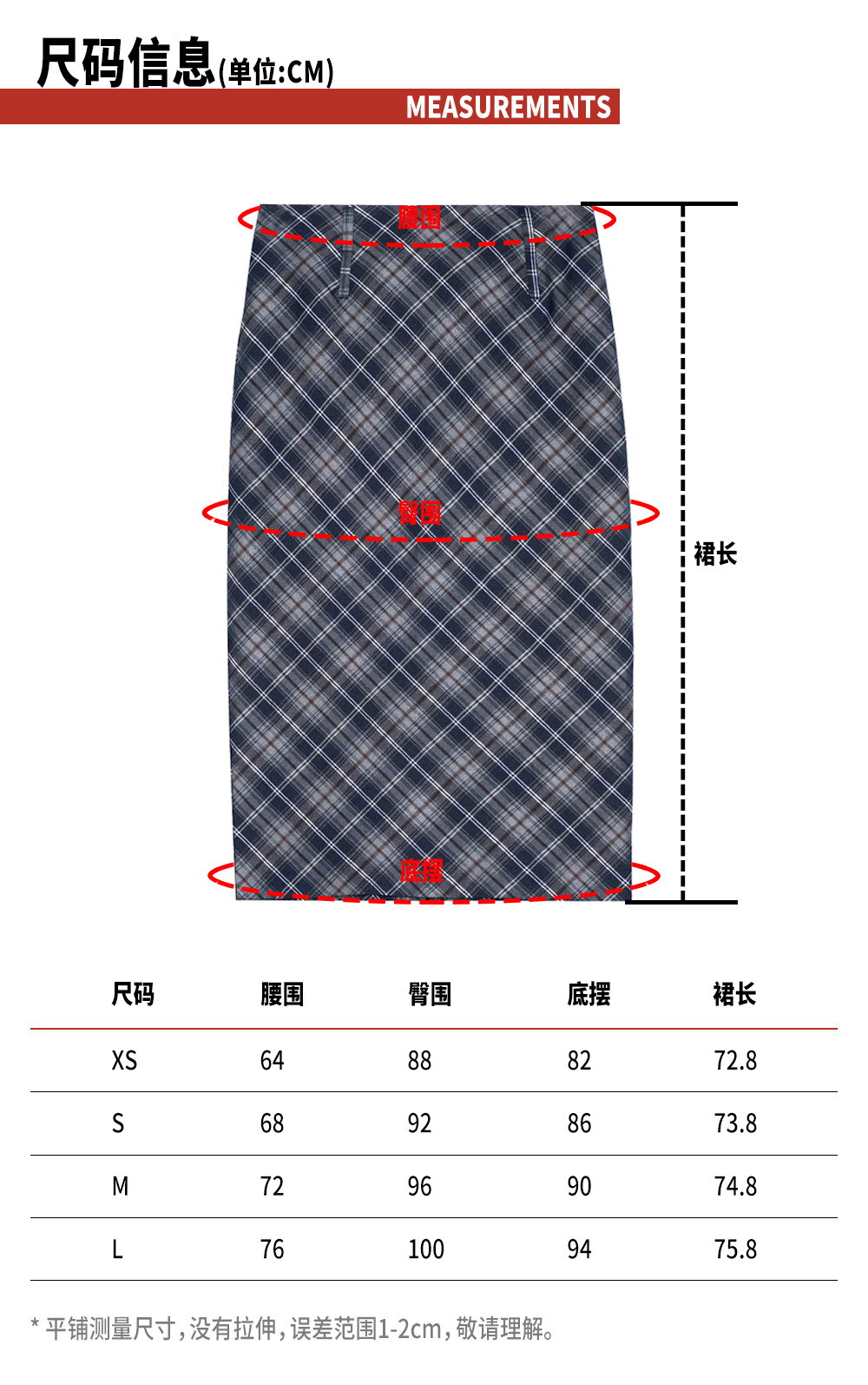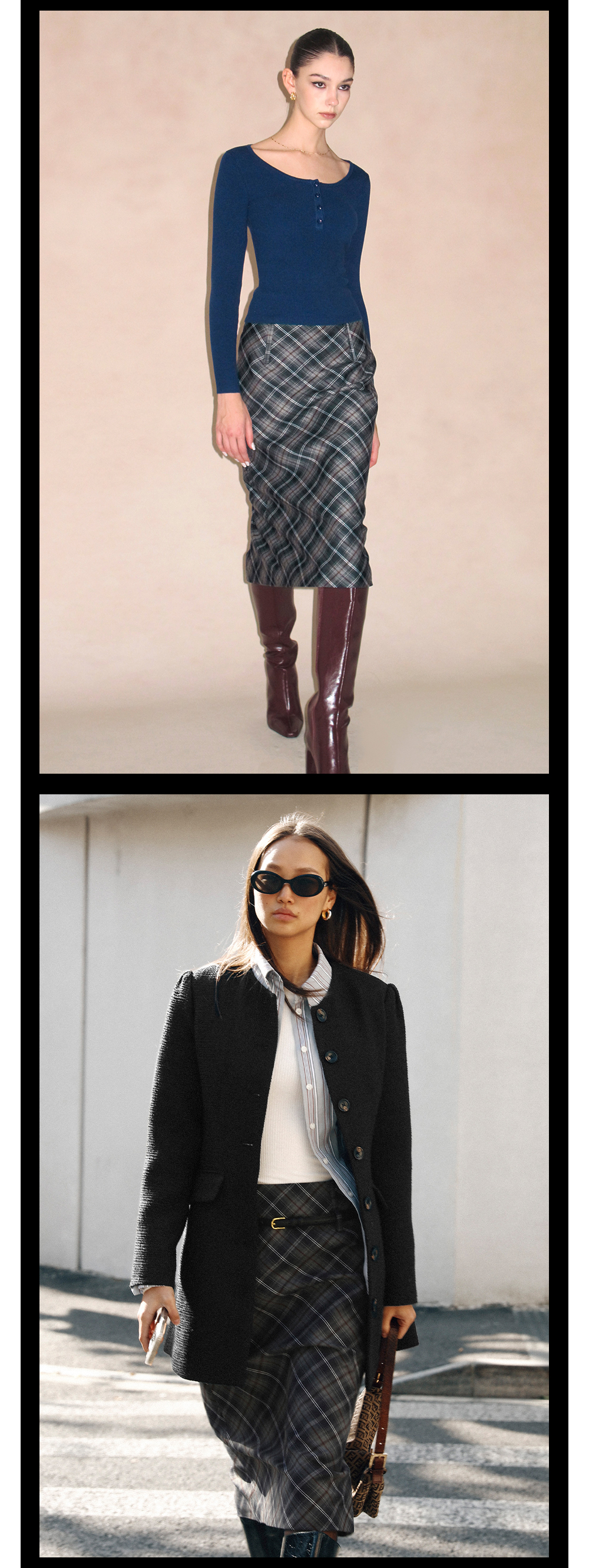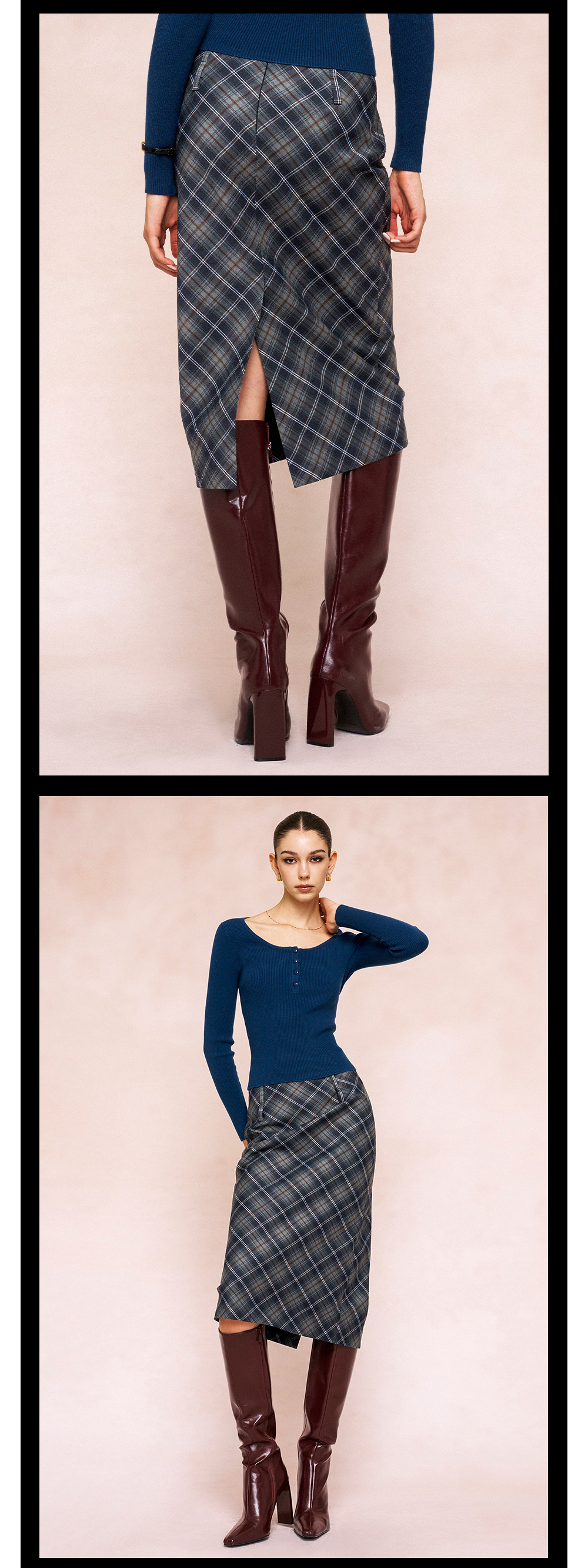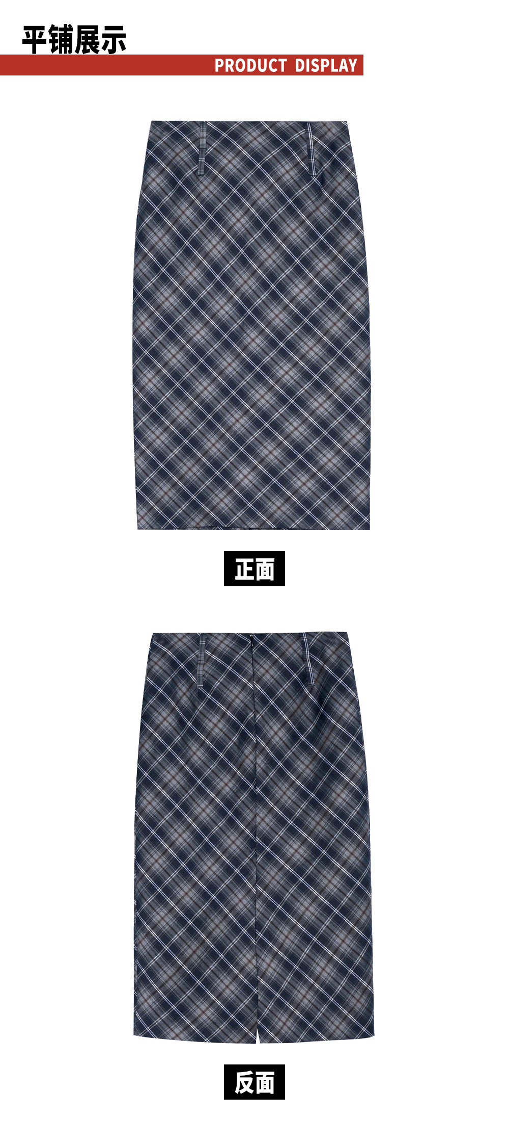 TR她热 贝拉格纹 藏蓝色格纹复古印花拉链开叉西装显瘦直筒半裙