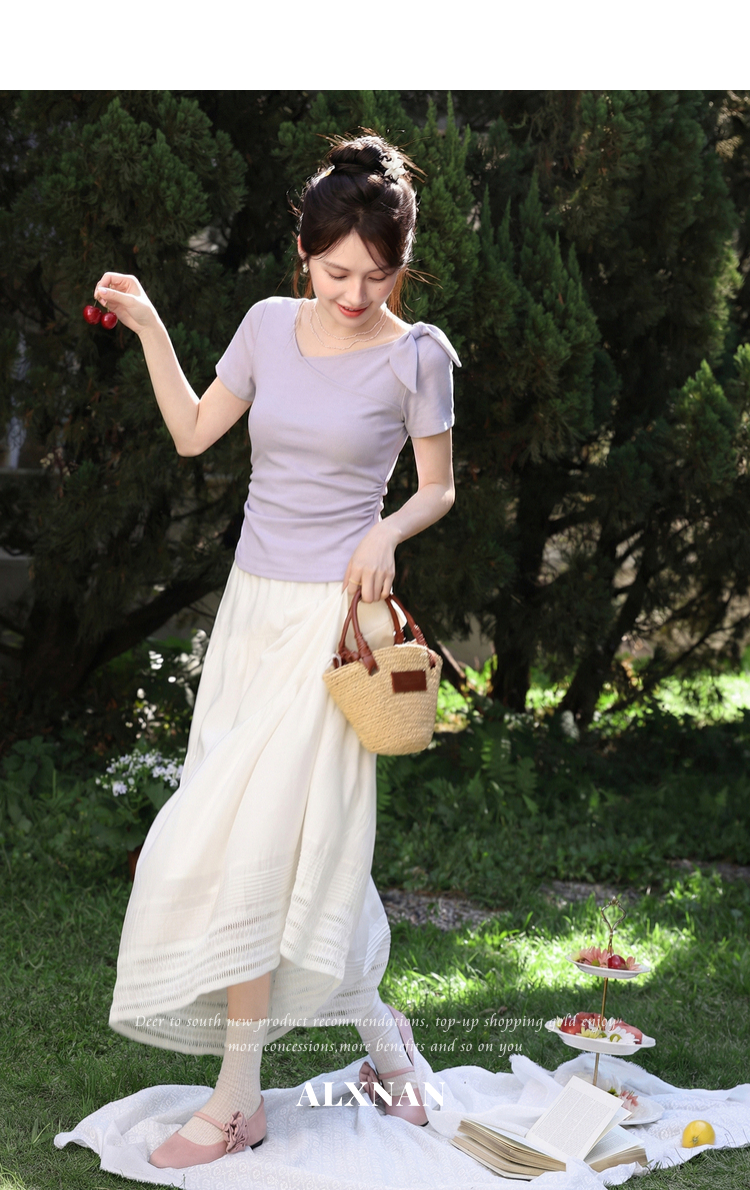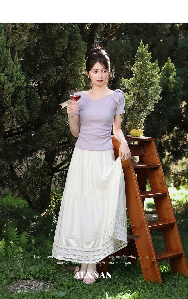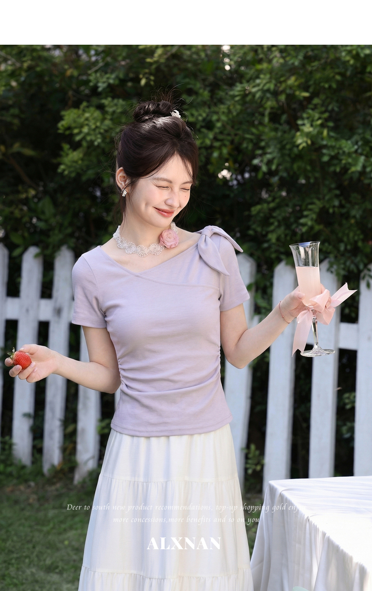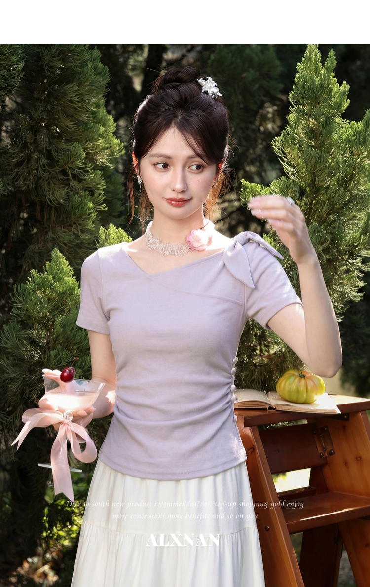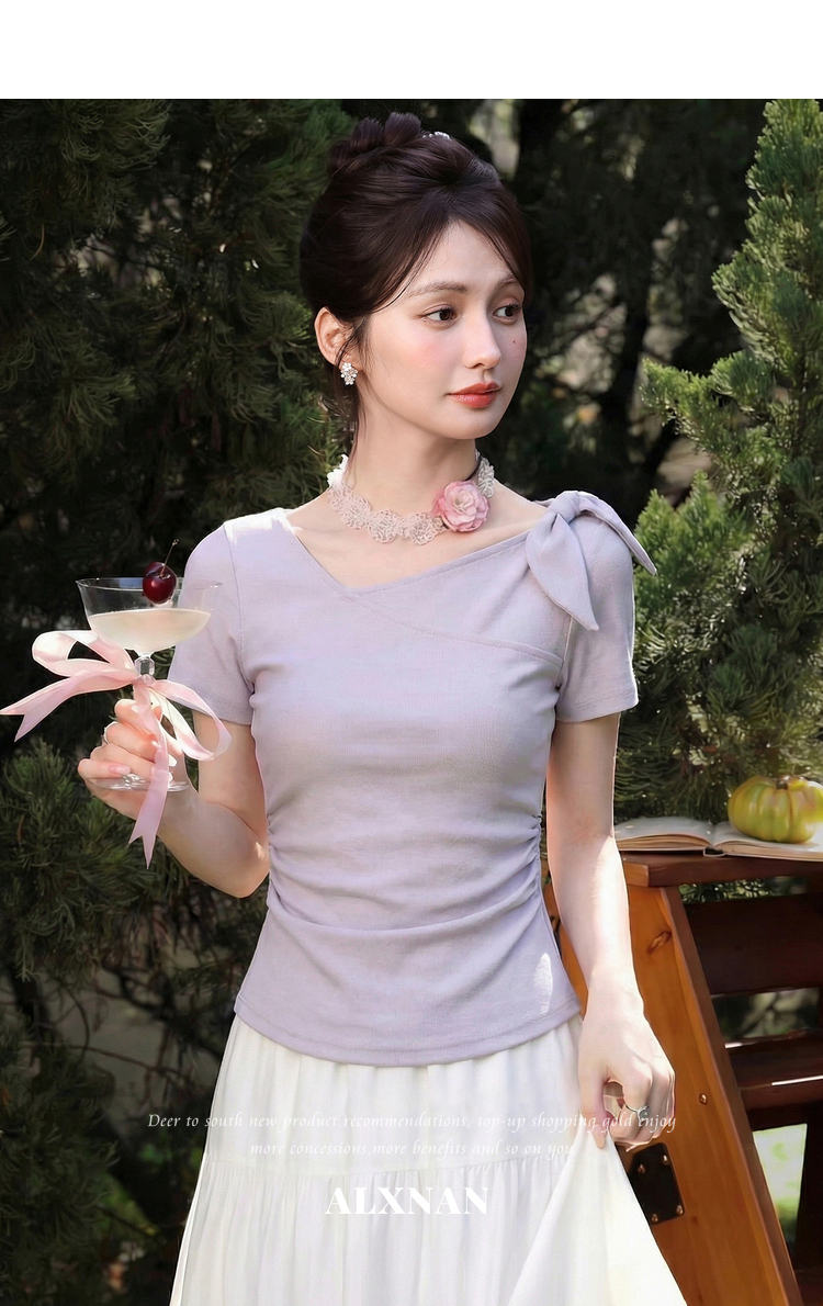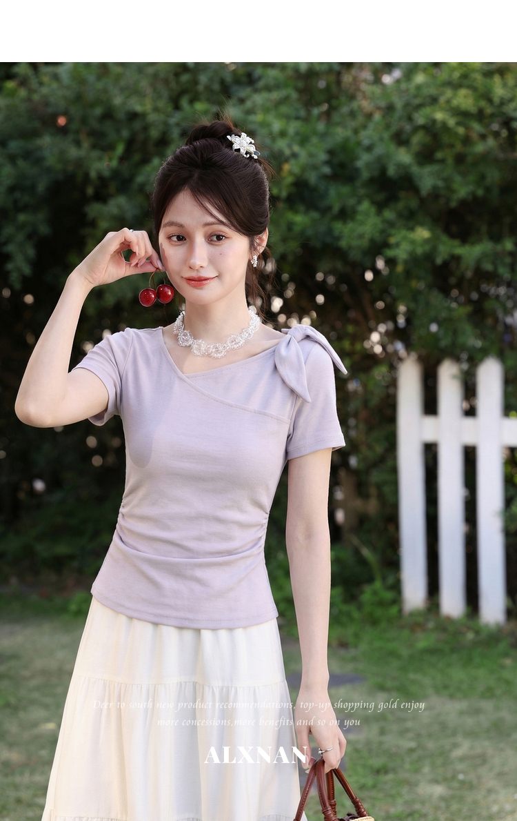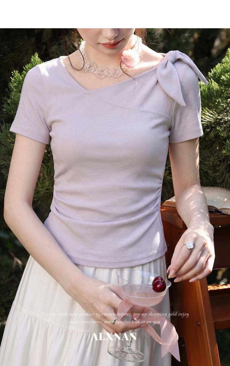 鹿向南「香香芋紫」斜肩紫色T恤女夏季新款法式修身显瘦短袖上衣