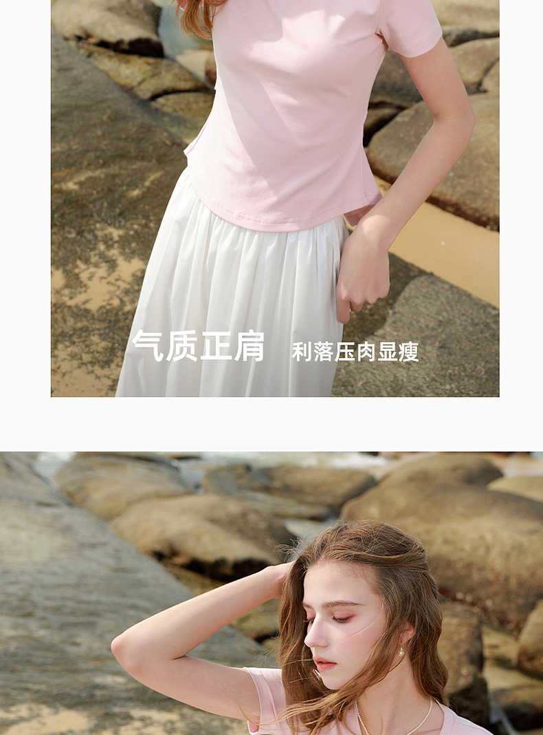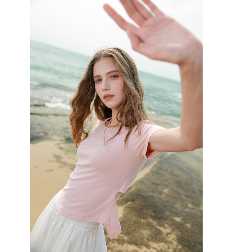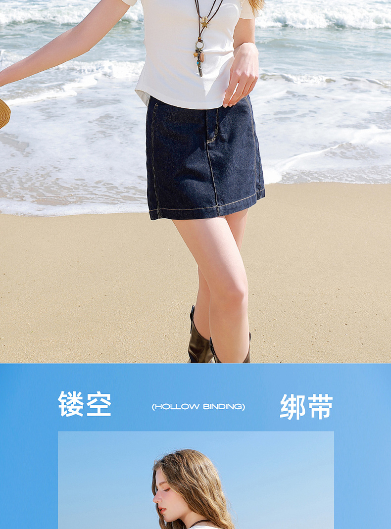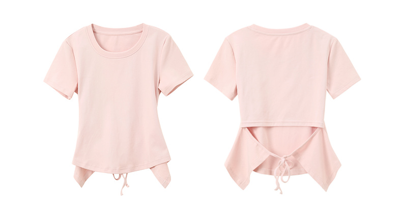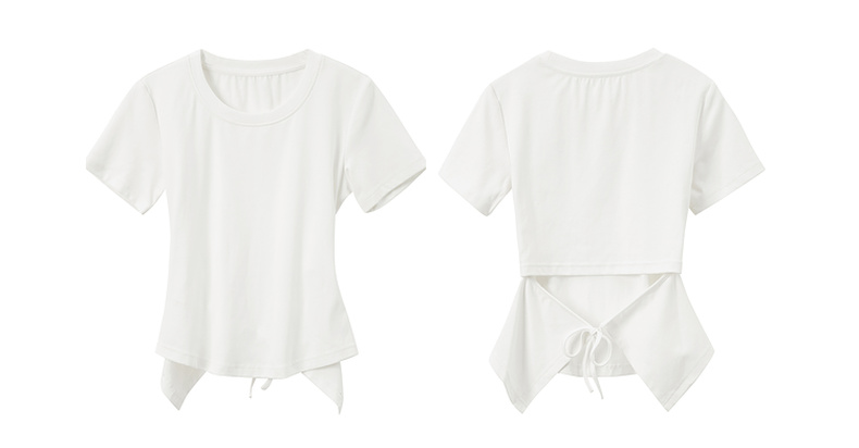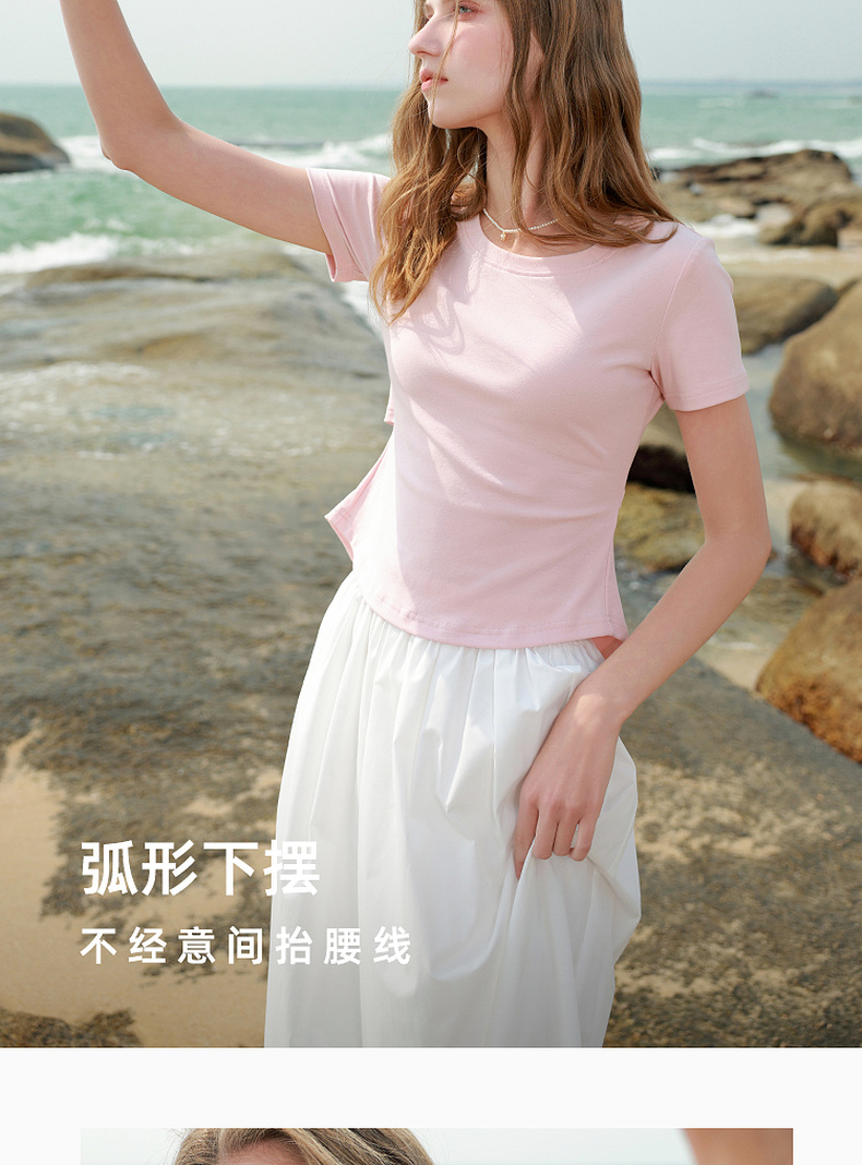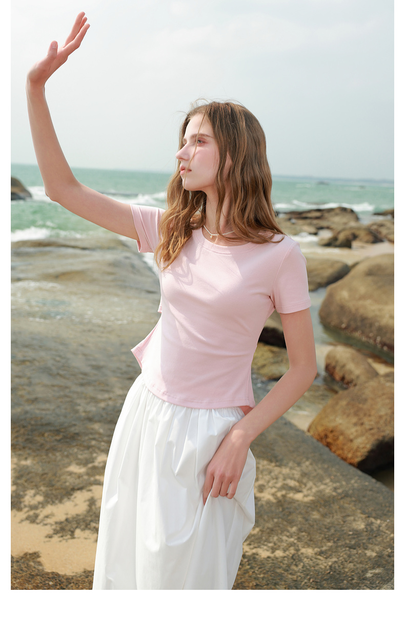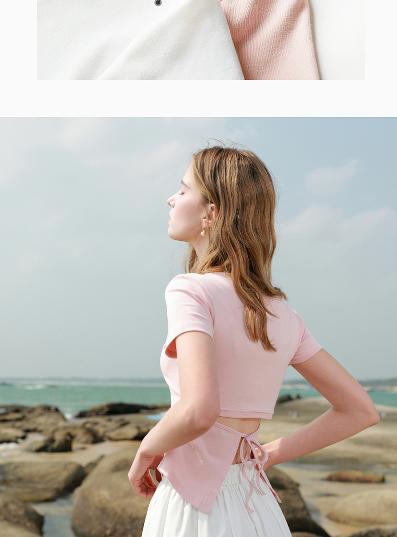 三彩2025春季新款纯色T恤修身正肩短袖镂空绑带短款上衣M