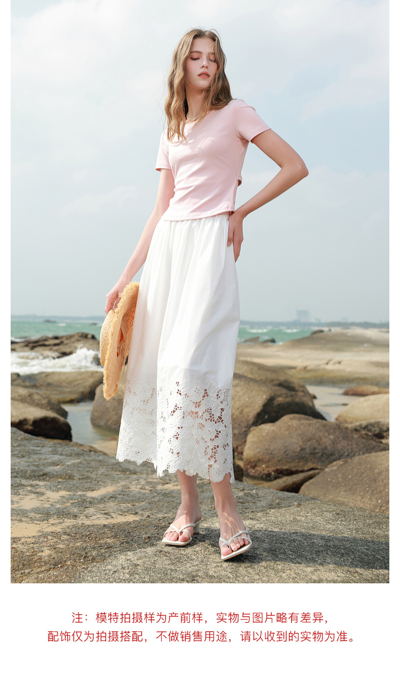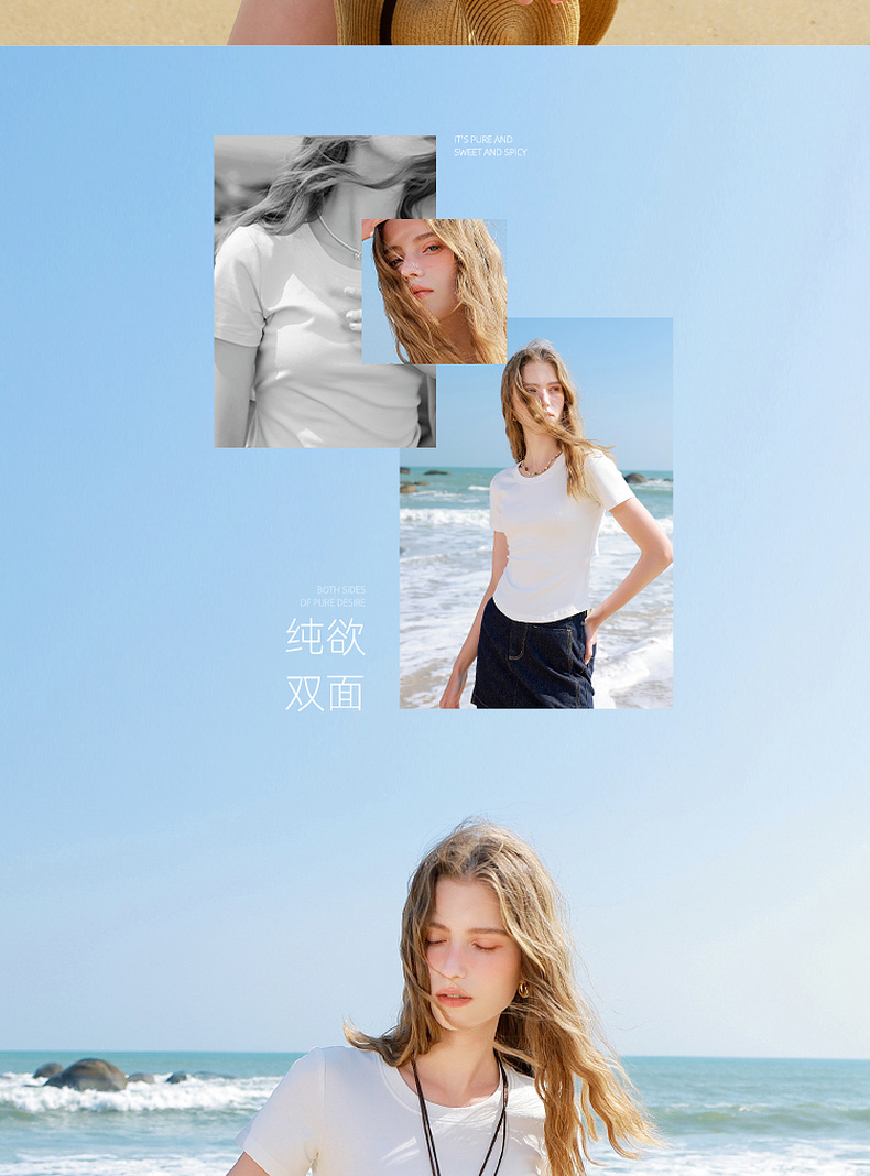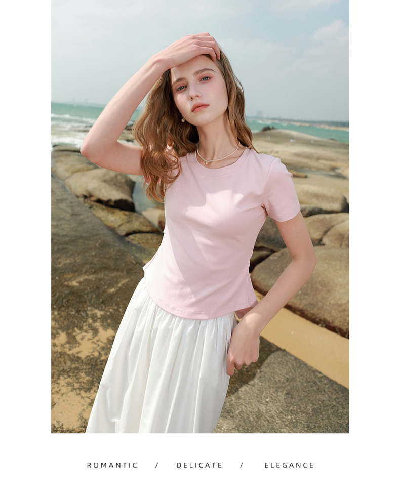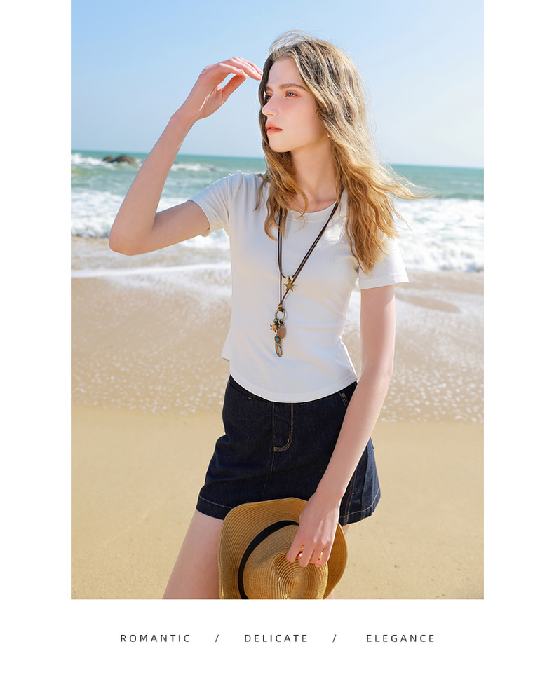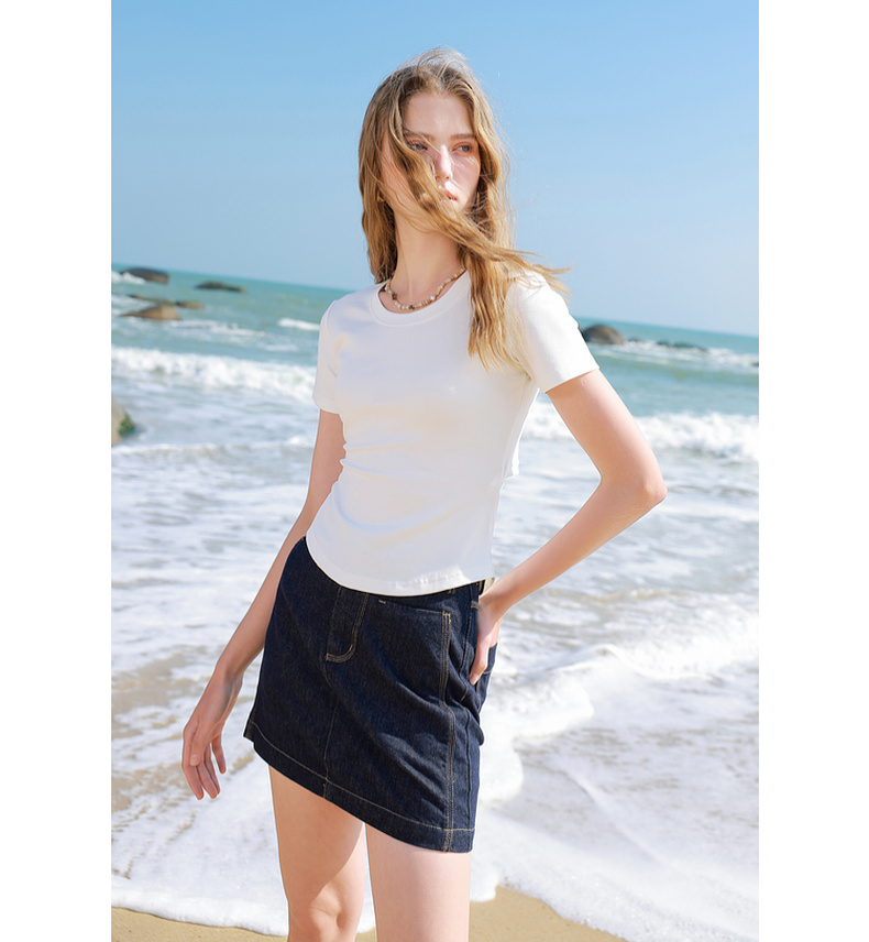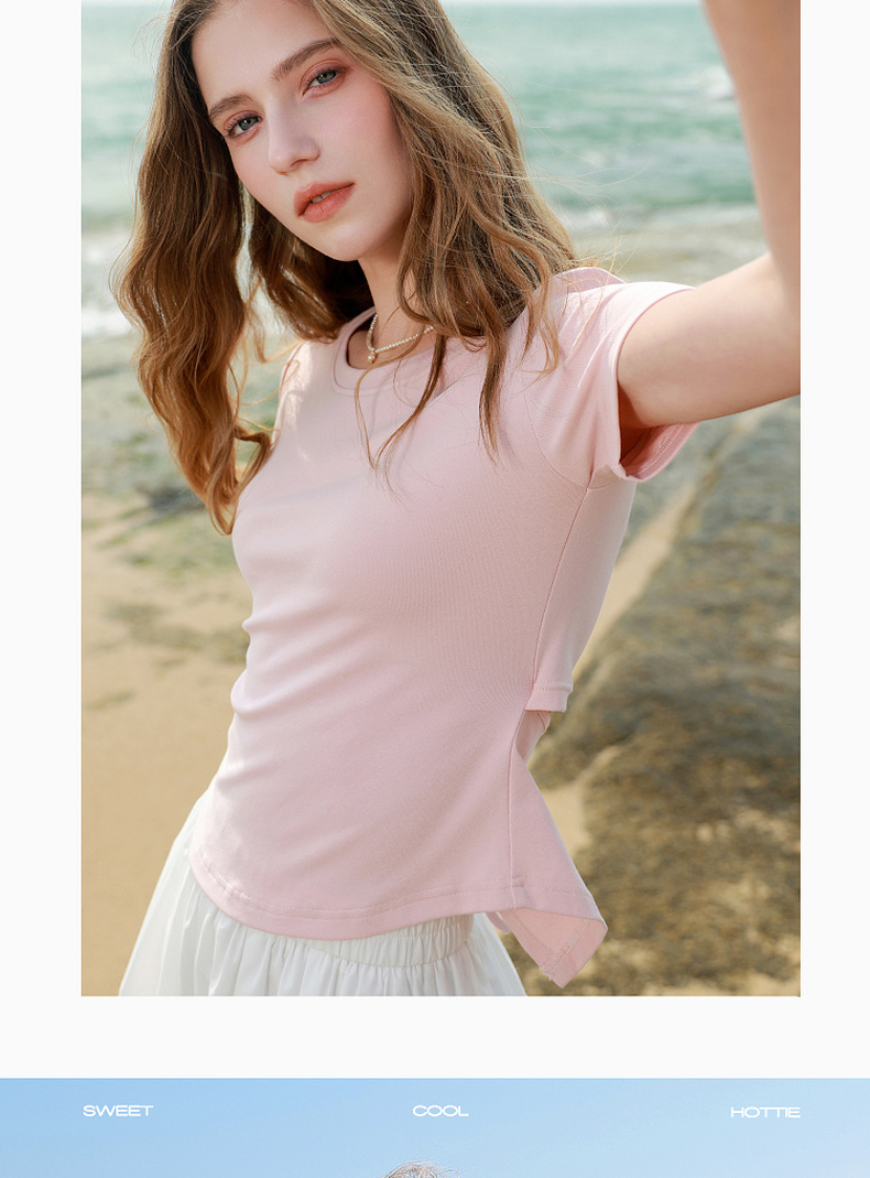 三彩2025春季新款纯色T恤修身正肩短袖镂空绑带短款上衣M