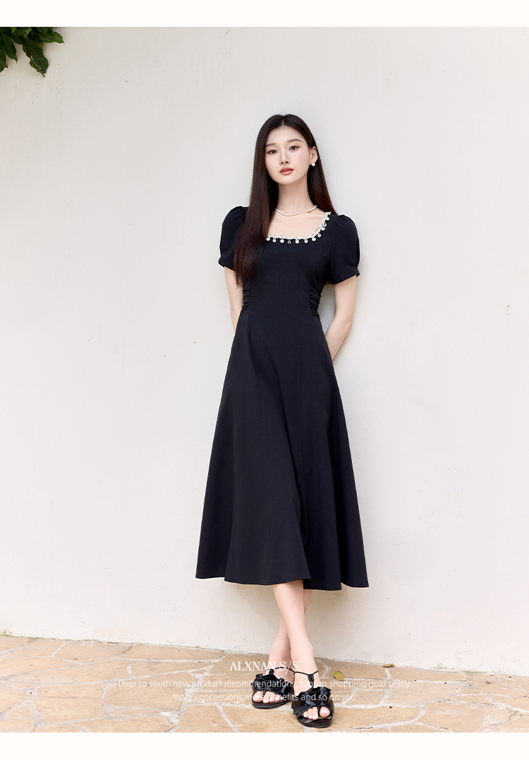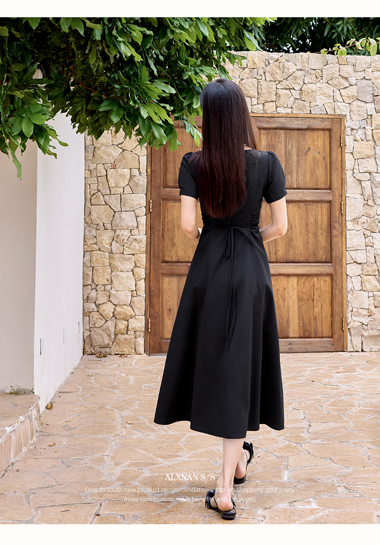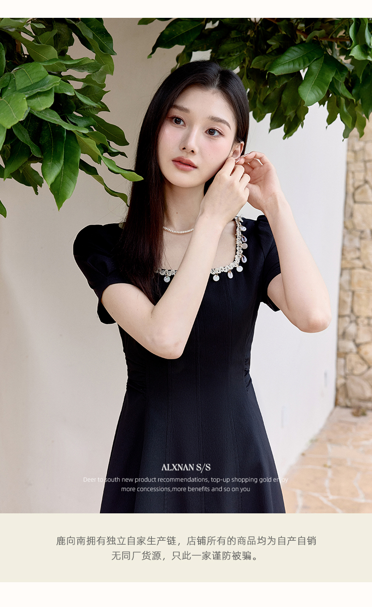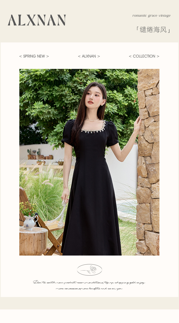 鹿向南「缱绻海风」黑色短袖连衣裙2025夏装新款时尚收腰长裙女