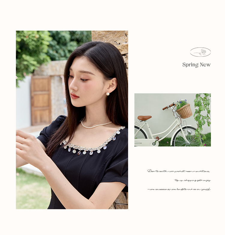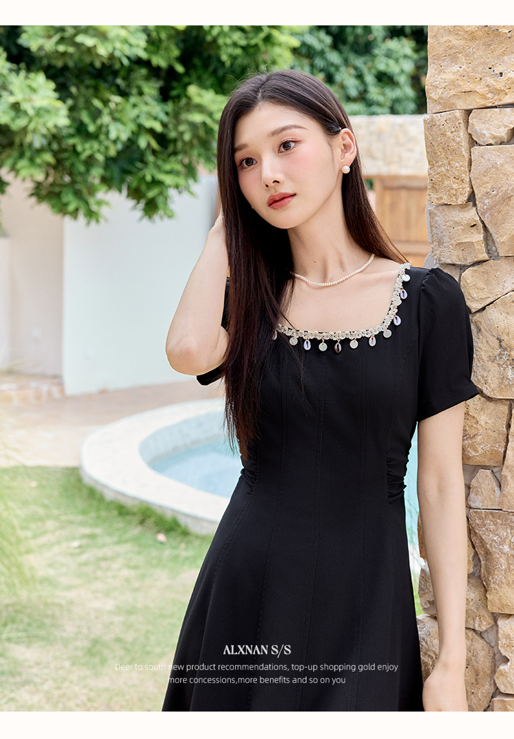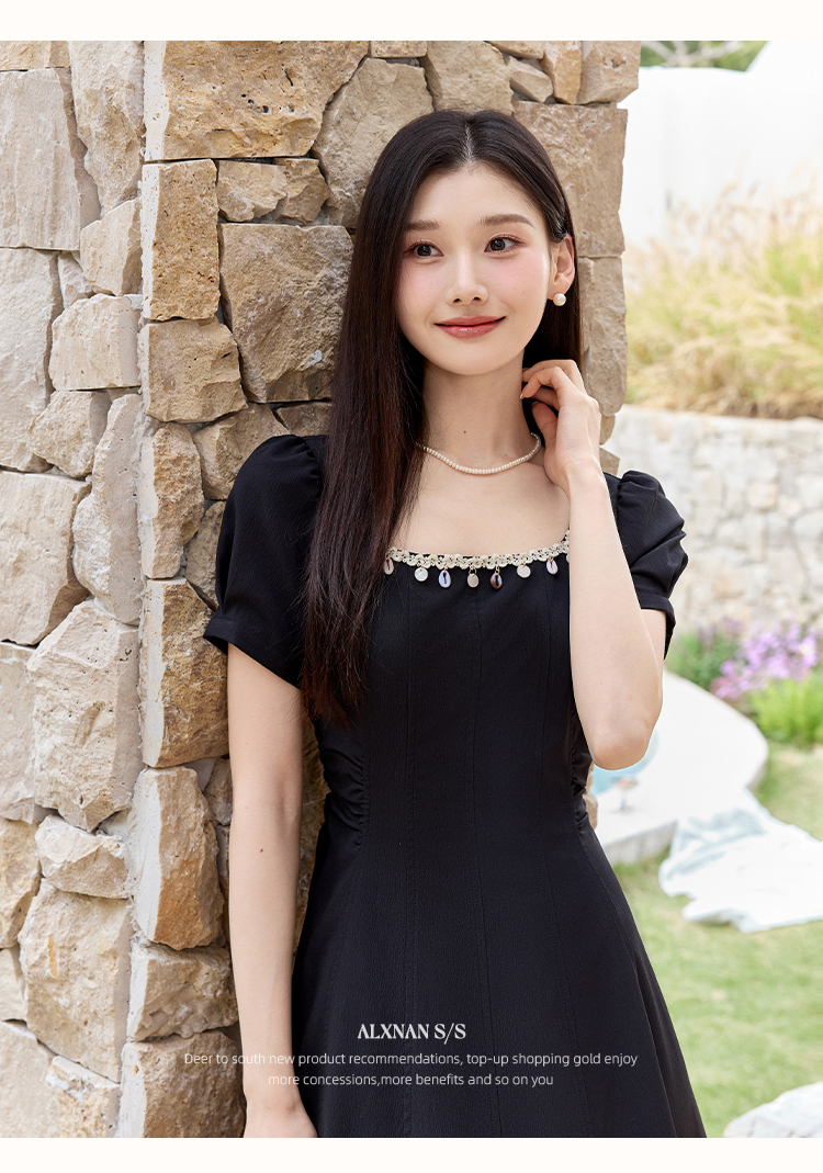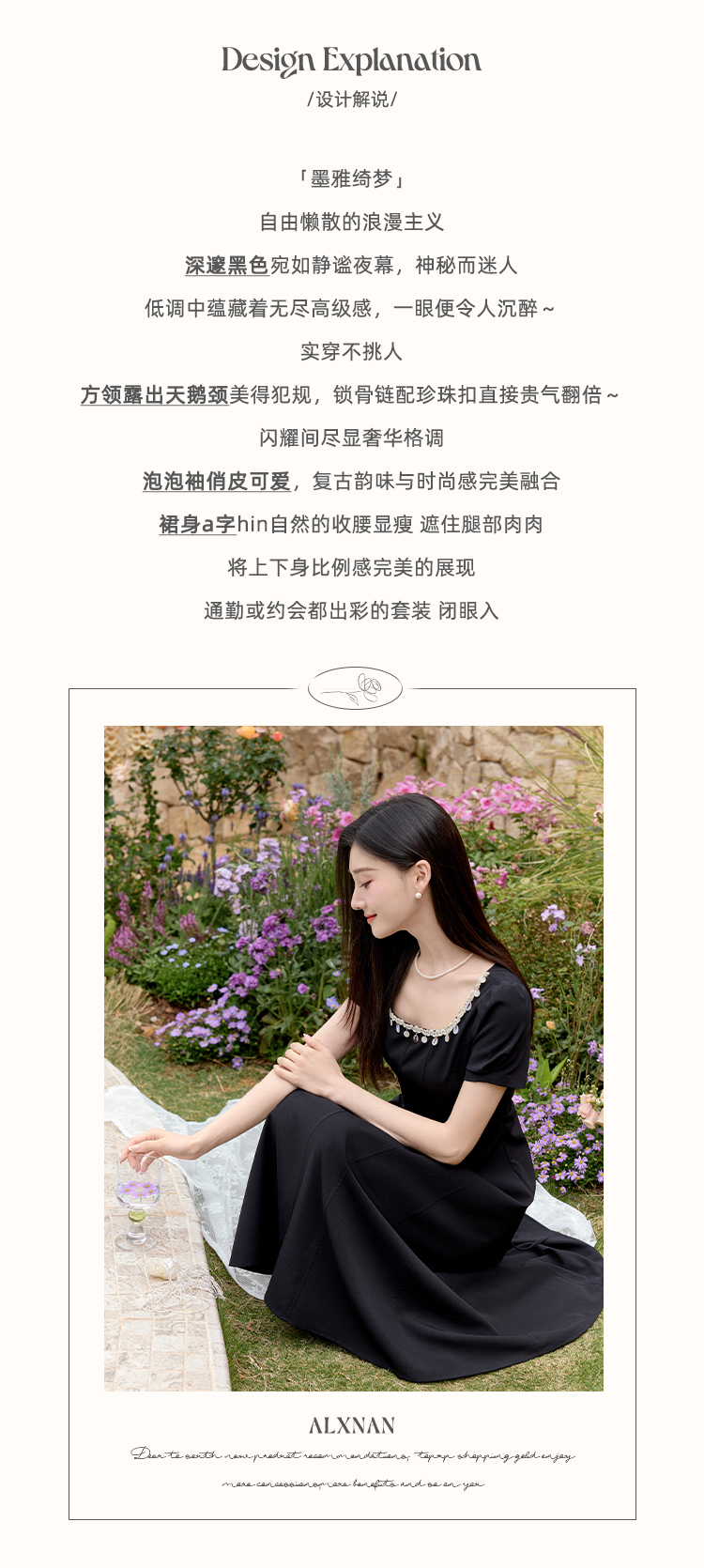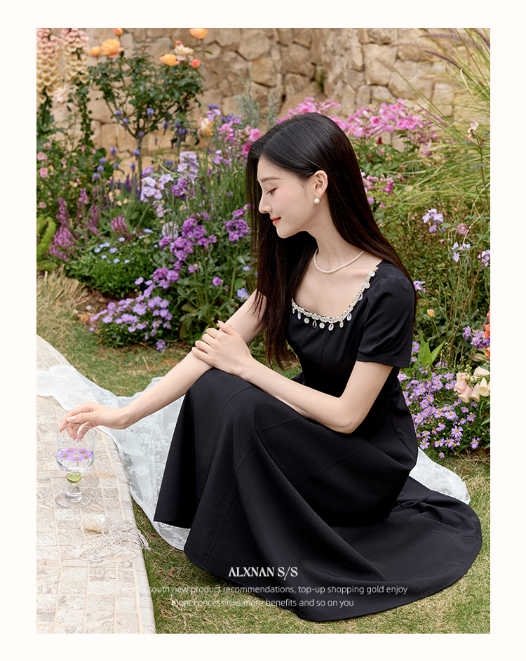 鹿向南「缱绻海风」黑色短袖连衣裙2025夏装新款时尚收腰长裙女