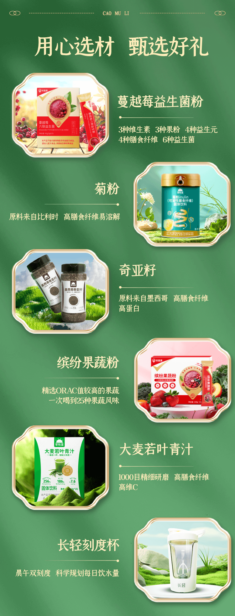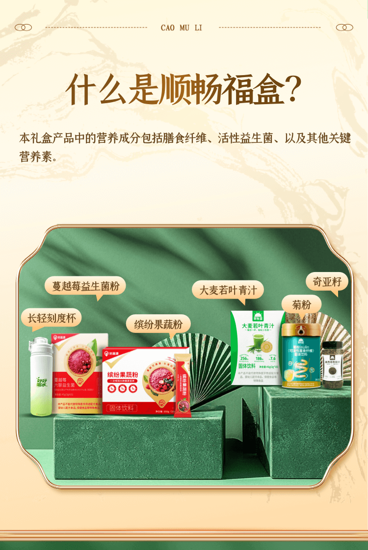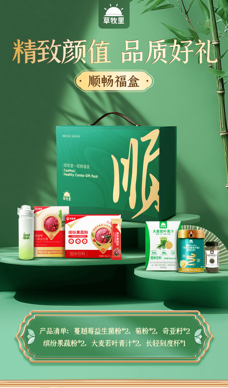 【500积分+299】草牧里 顺畅福盒 (蔓越莓益生菌粉*2盒+菊粉*2罐+奇亚籽*2罐+果蔬粉*2盒+大麦若叶青汁*2盒+长轻刻度杯*1) 用心选材品质好礼