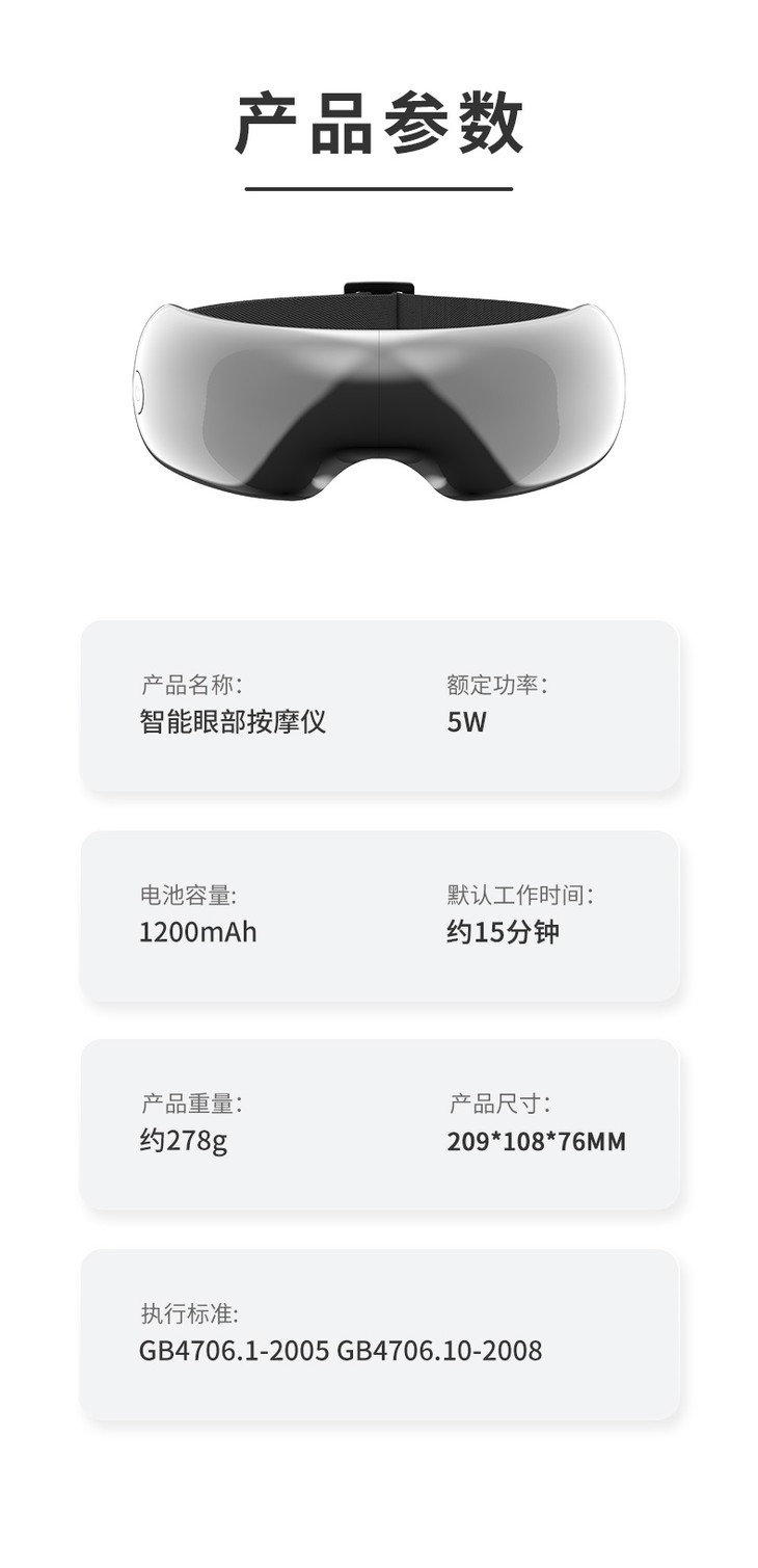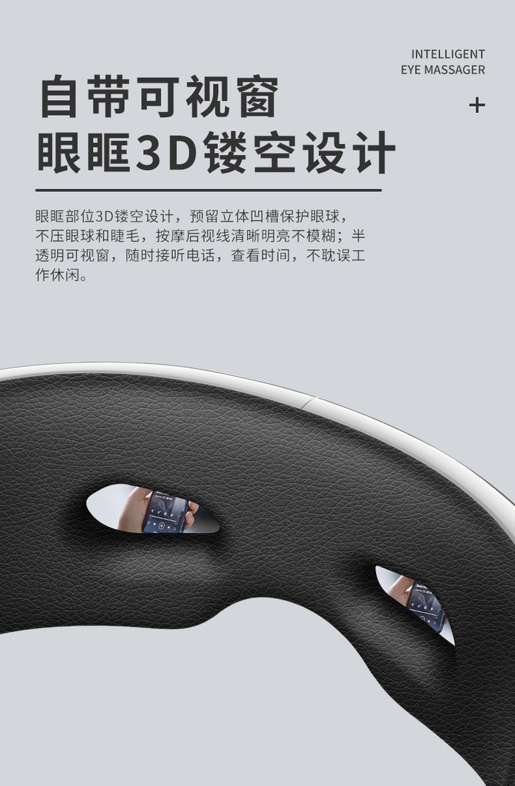 眼眶部位是3D镂空的设计,预留了立体凹槽保护眼球,而且不会压眼球和睫毛,按摩后视线不会模糊,半透明可视窗口随时可以接电话和看时间,还有自带大自然纯音乐或者可以连接蓝牙播放音乐,也可以在开机状态下双击两下关闭纯音众