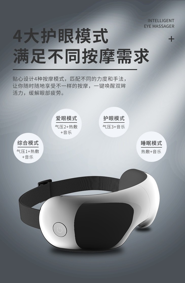 4大护眼模式满足不同按摩需求贴心设计4种按摩模式,匹配不同的力度和手法,让你随时随地享受不一样的按摩,一键唤醒双眸活力,缓解眼部疲劳。