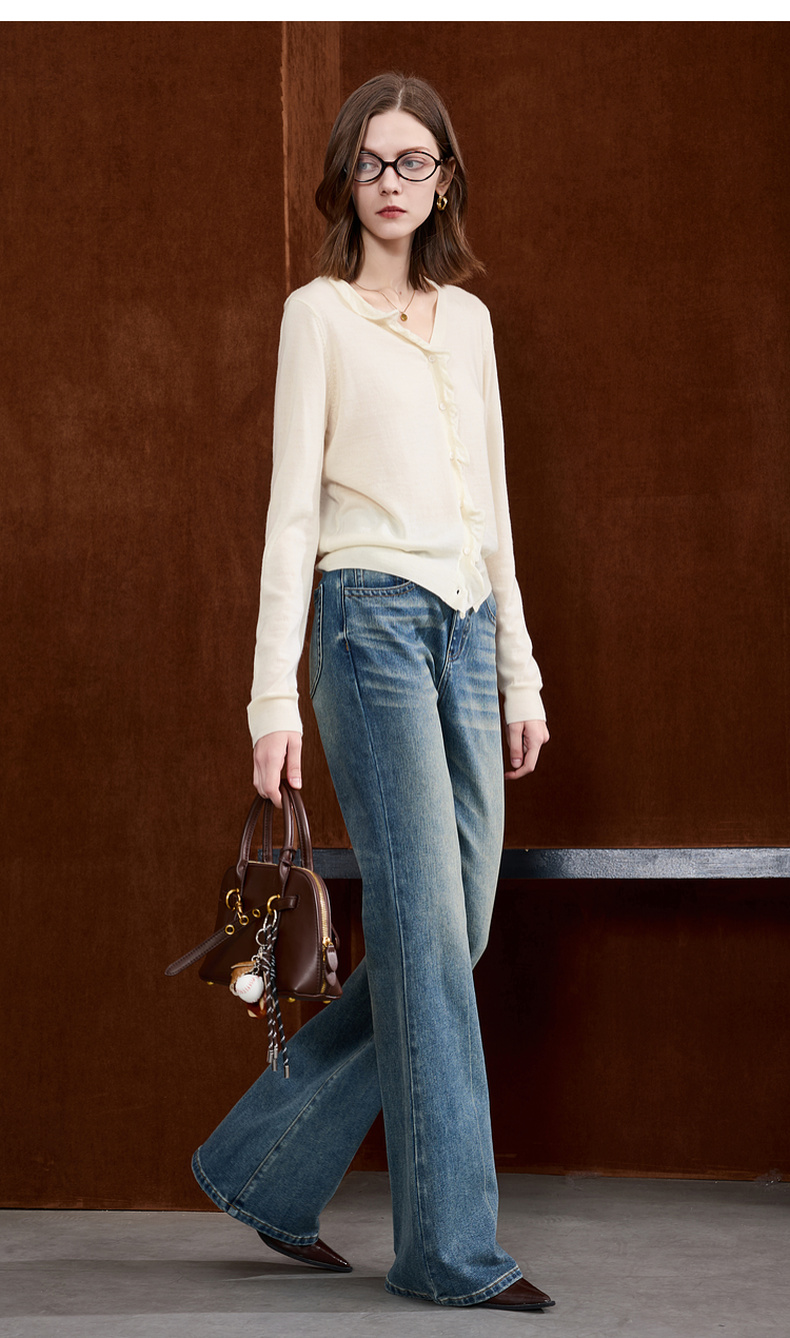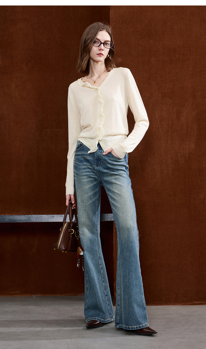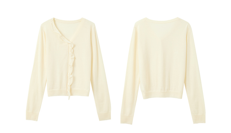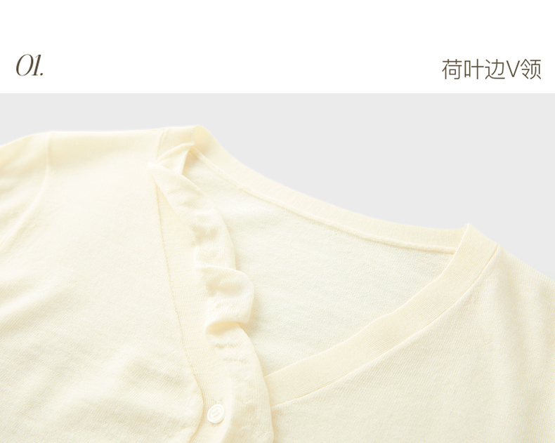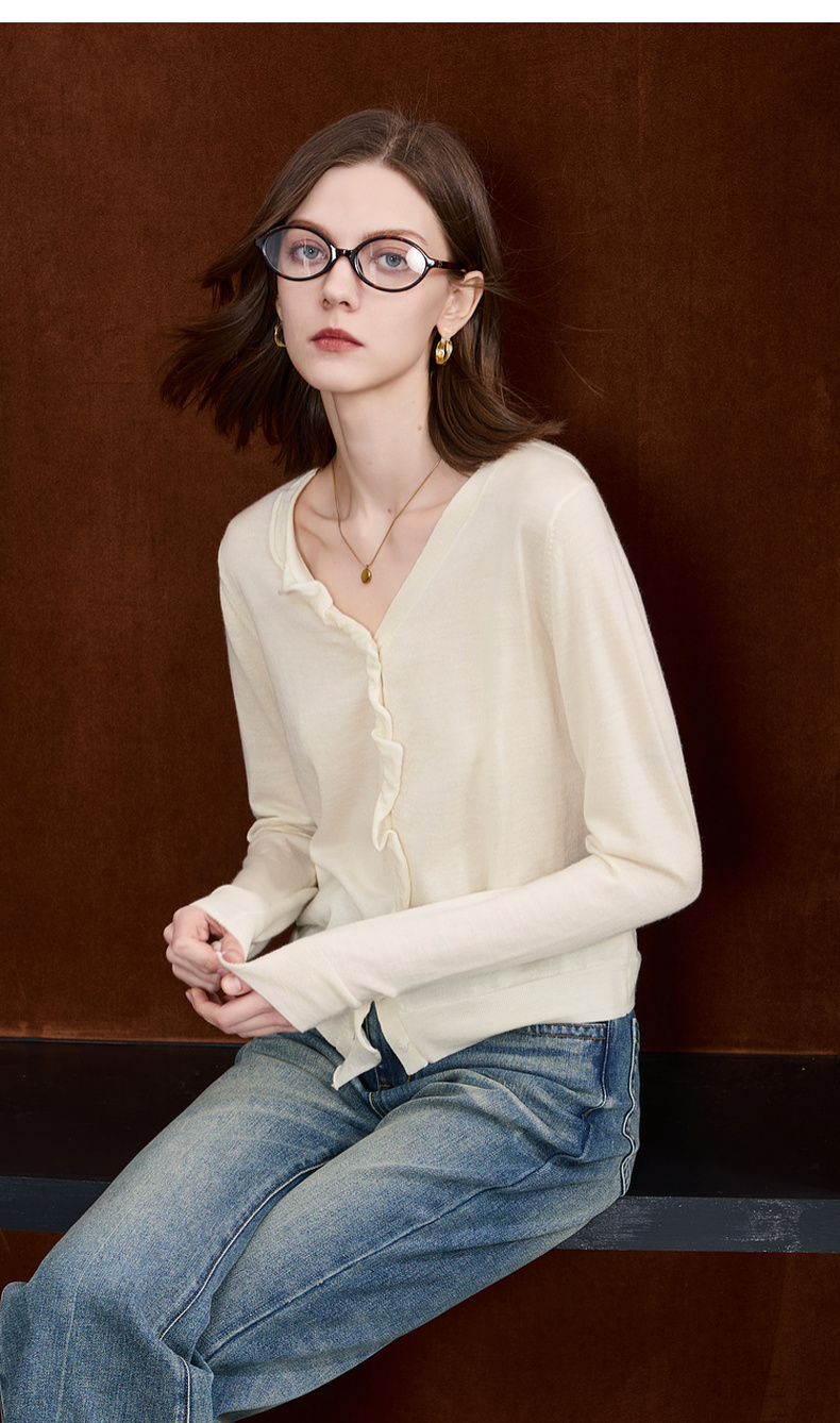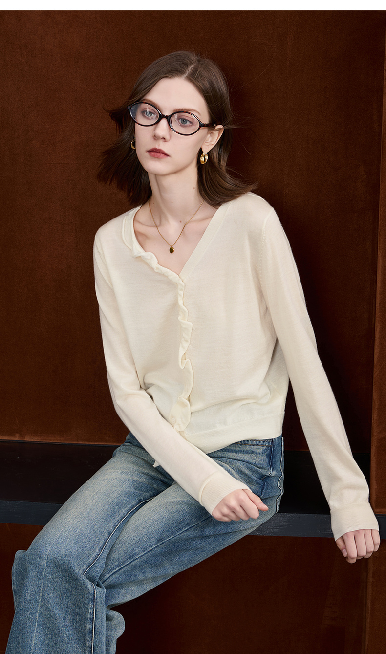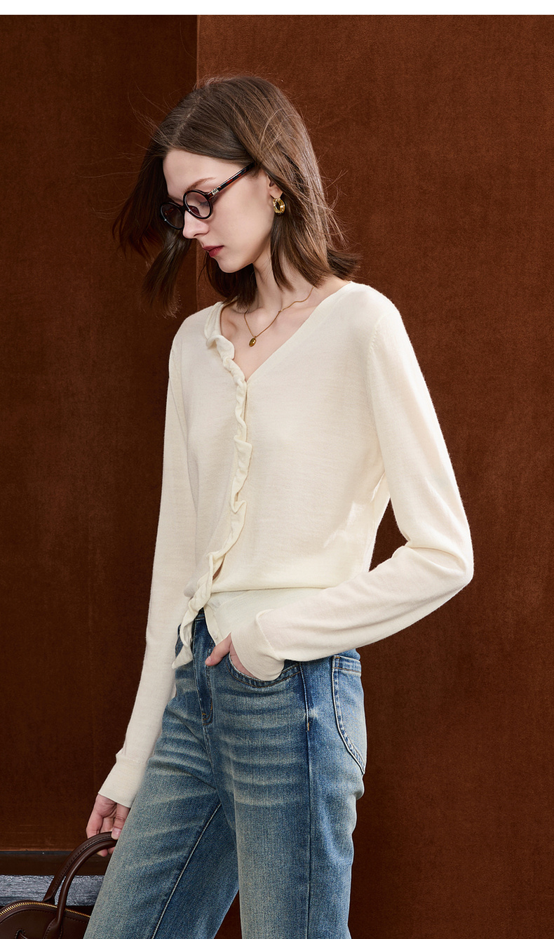 【100绵羊毛】三彩2025秋季新款荷叶边V领针织衫长袖开衫上衣M