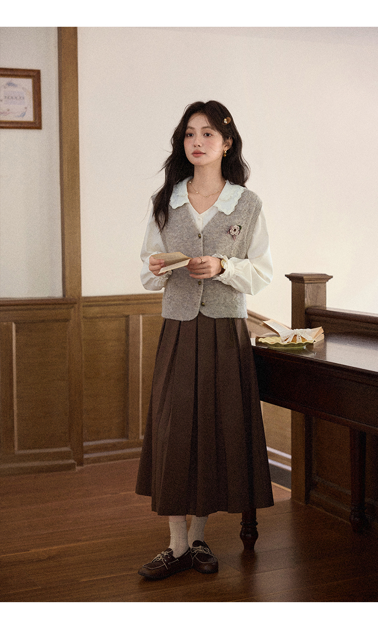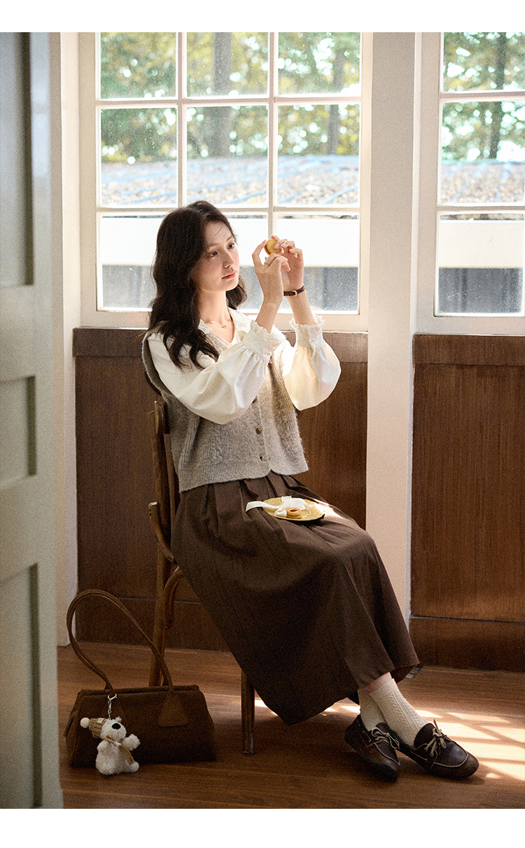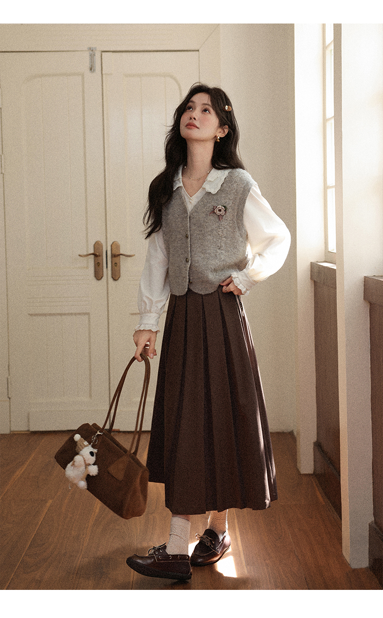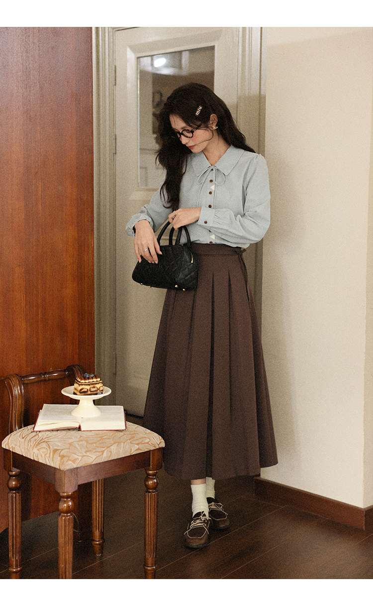 鹿向南「焦糖卷云」小个子高腰半身裙女早秋设计感长款咖色百褶裙
