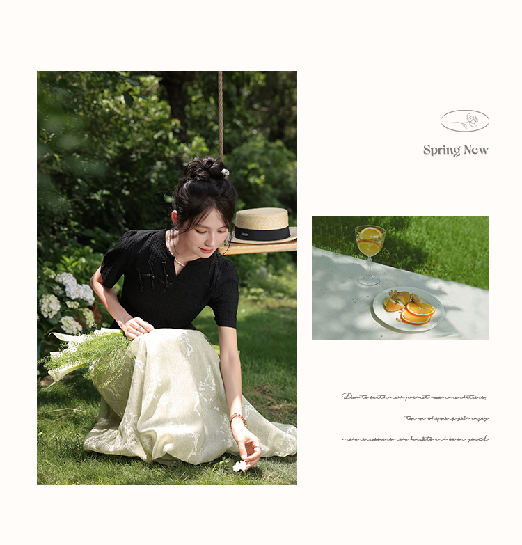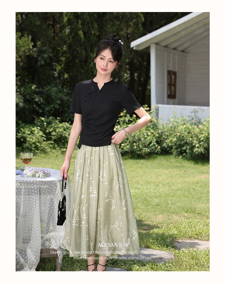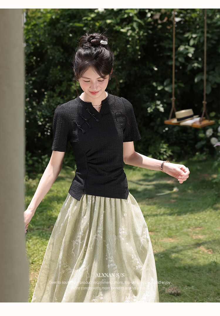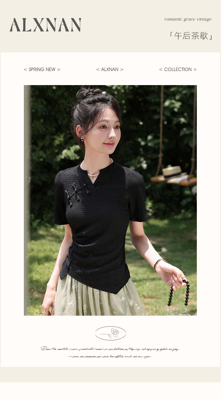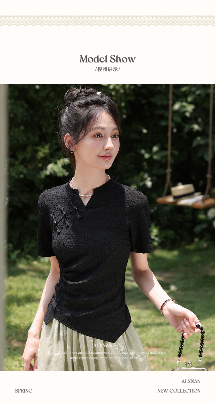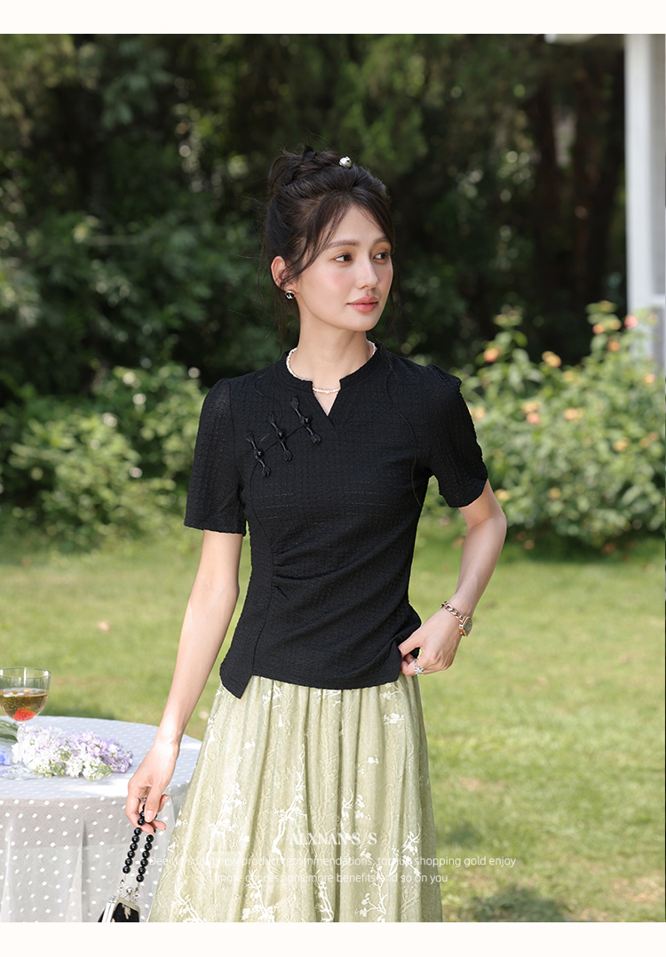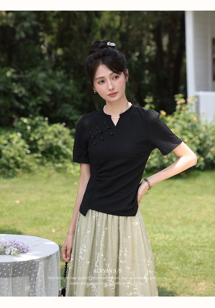 鹿向南「午后茶歇」黑色新中式改良短袖T恤夏新款时尚修身上衣女