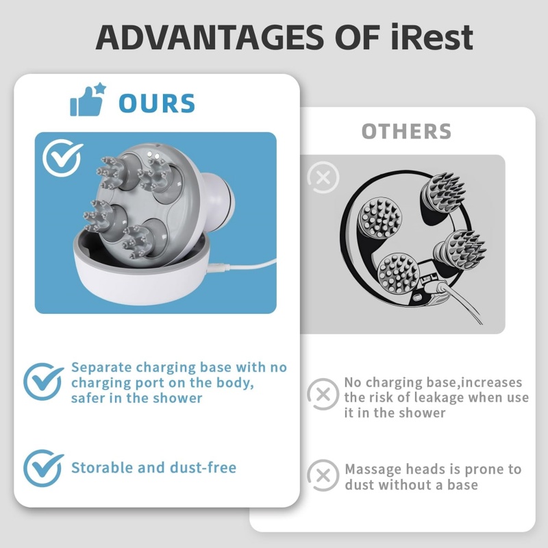 可充电且便携:配备锂电池并配备充电座,这款无线头皮按摩器具有强大的强度和便携性。