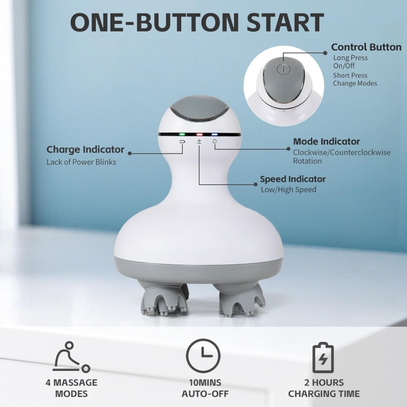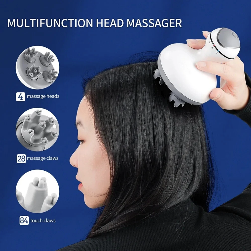 旋转手持便携按摩器,配备4个头皮头,84个头皮缓解节点,全身按摩与放松。