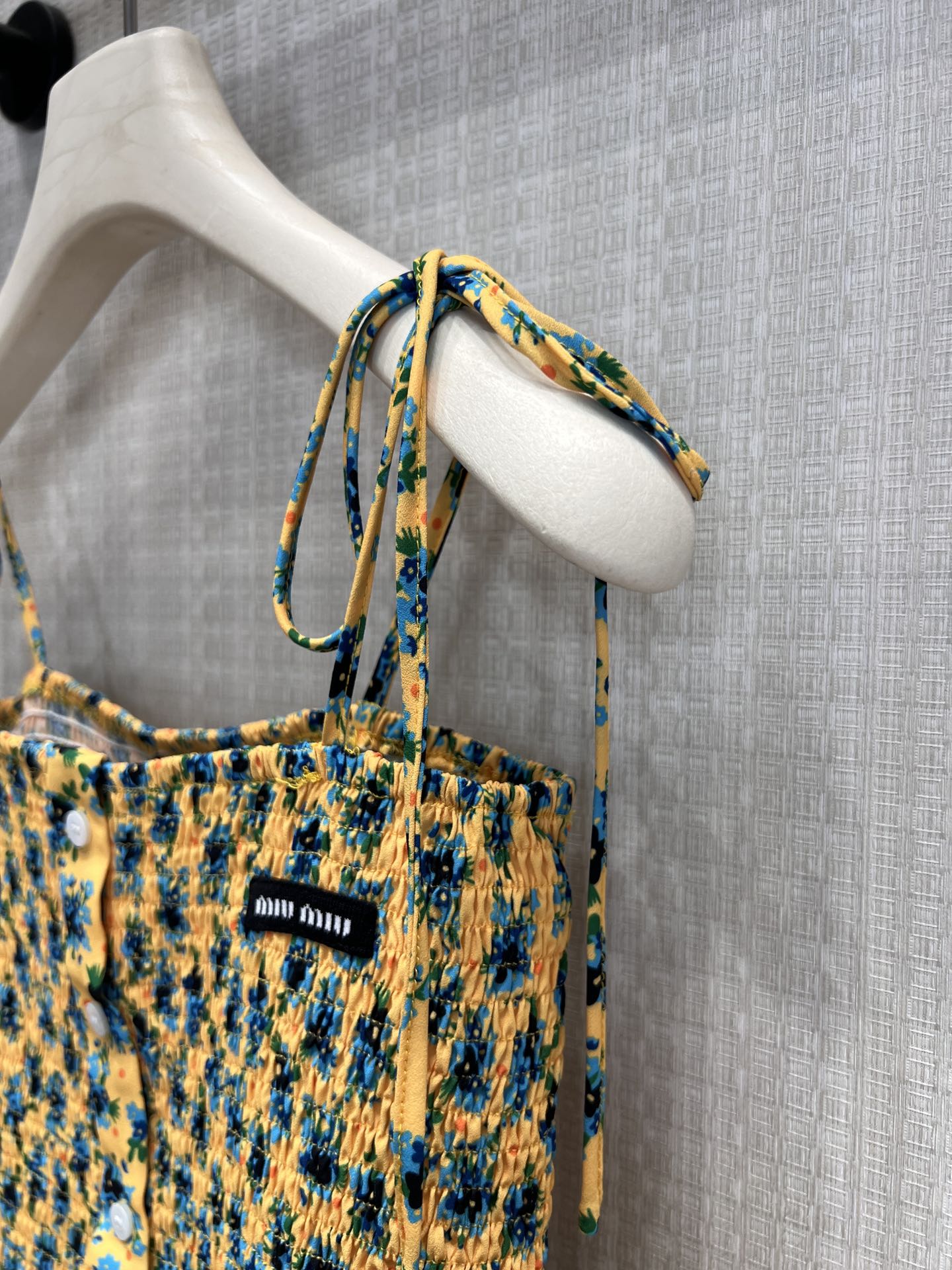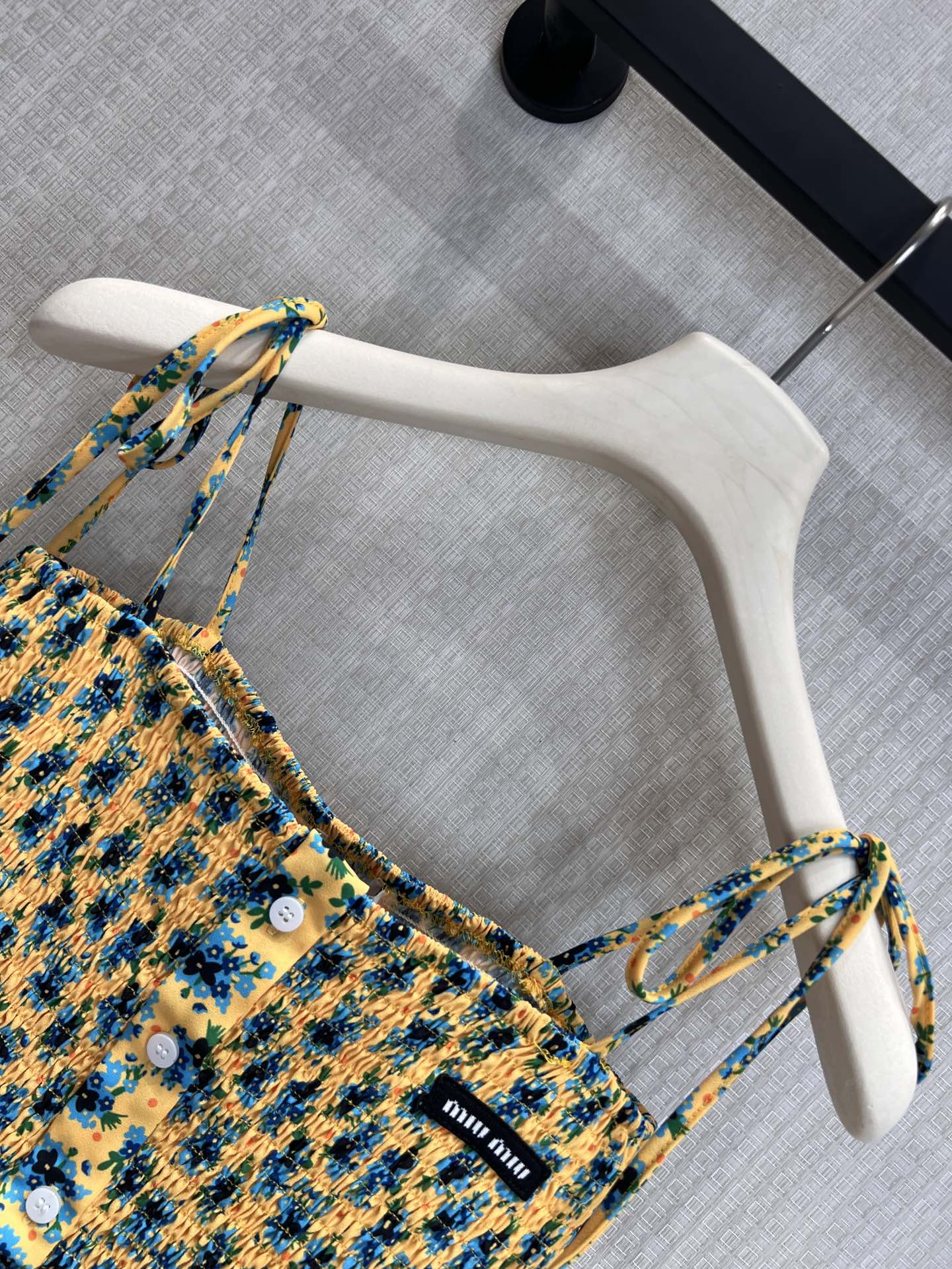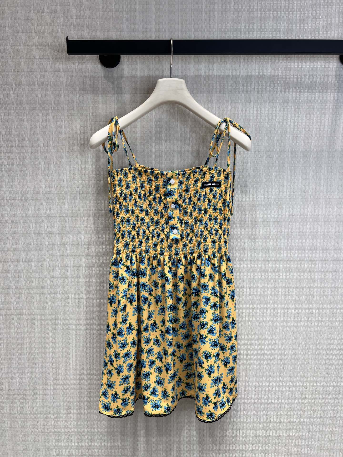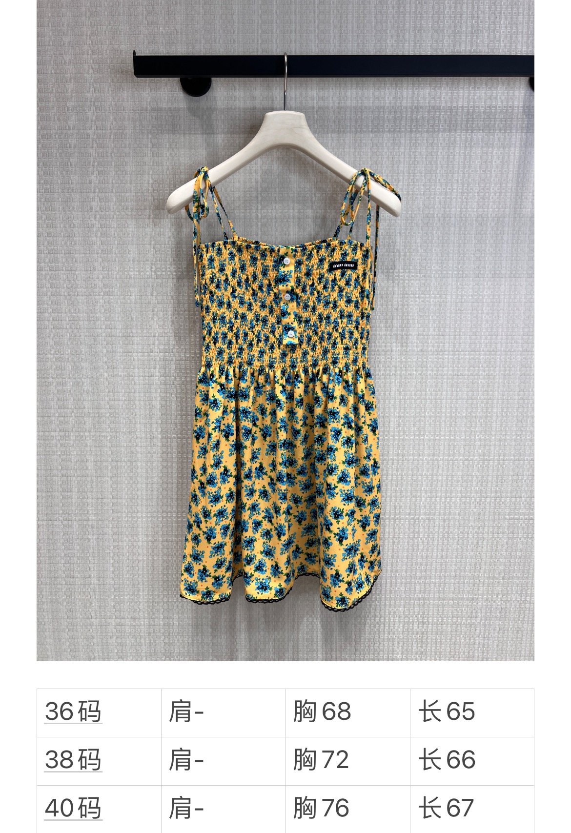 Miu* 26Ss春夏新款 向日葵黄碎花吊带连衣裙丨⚠独家yb开发!顶级高版出品!元气向日葵黄底色,搭配复古蓝调小雏菊碎花,明媚又显白;可调节系带吊带+方领剪裁,露出精致锁骨,甜美又显瘦;胸前弹力打揽收腰,自然凸显腰线,微A裙摆飘逸灵动,走路自带氛围感。现货发售S/M/L