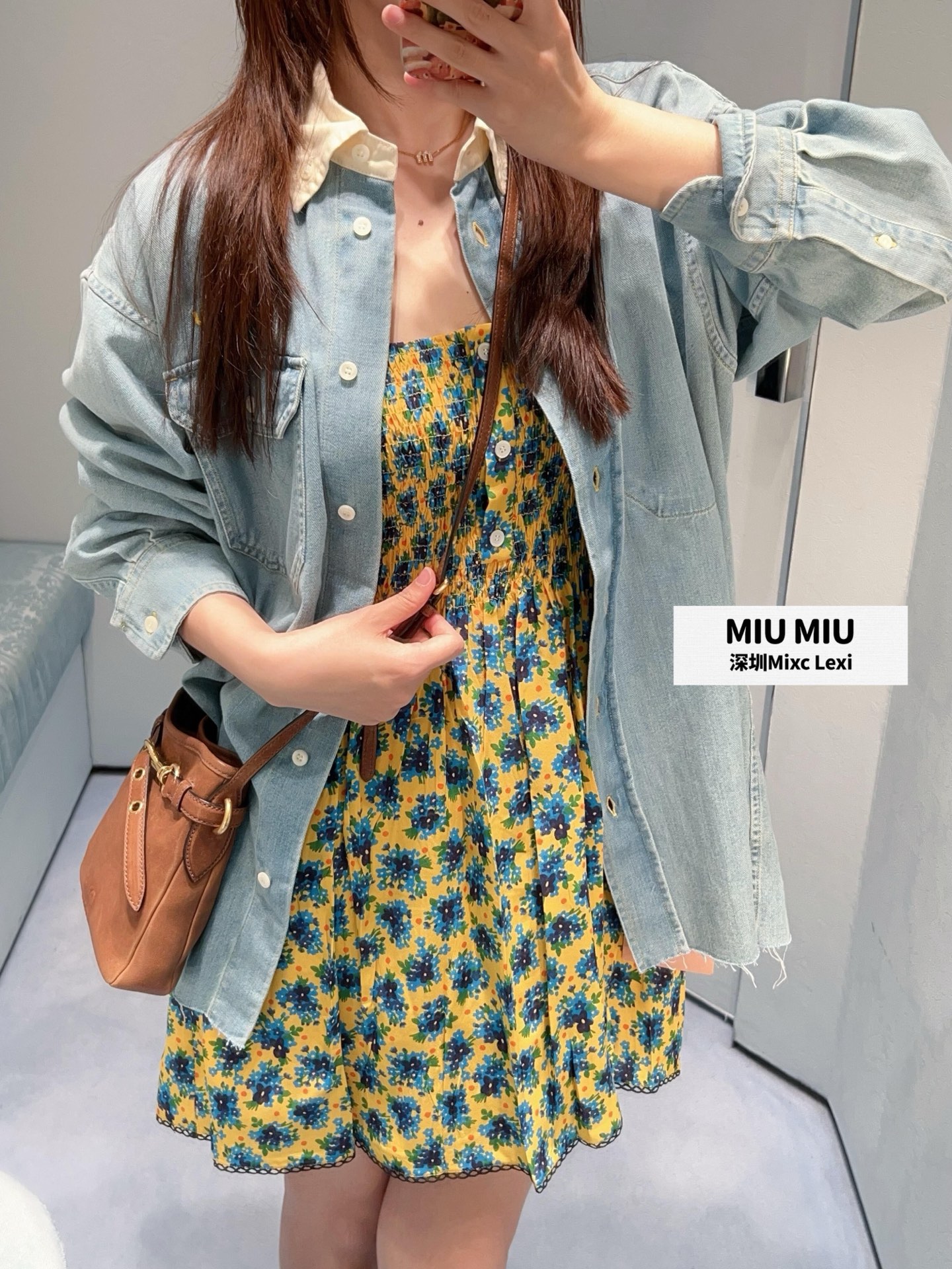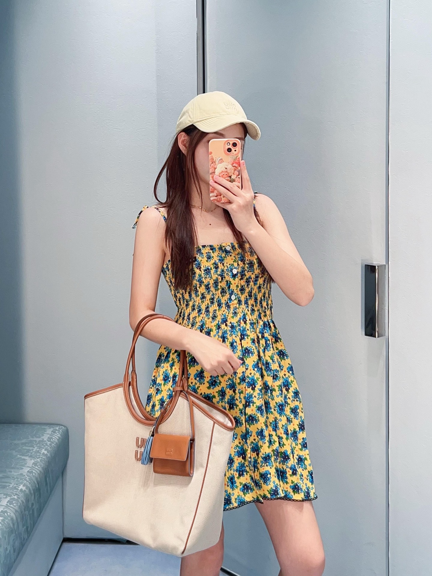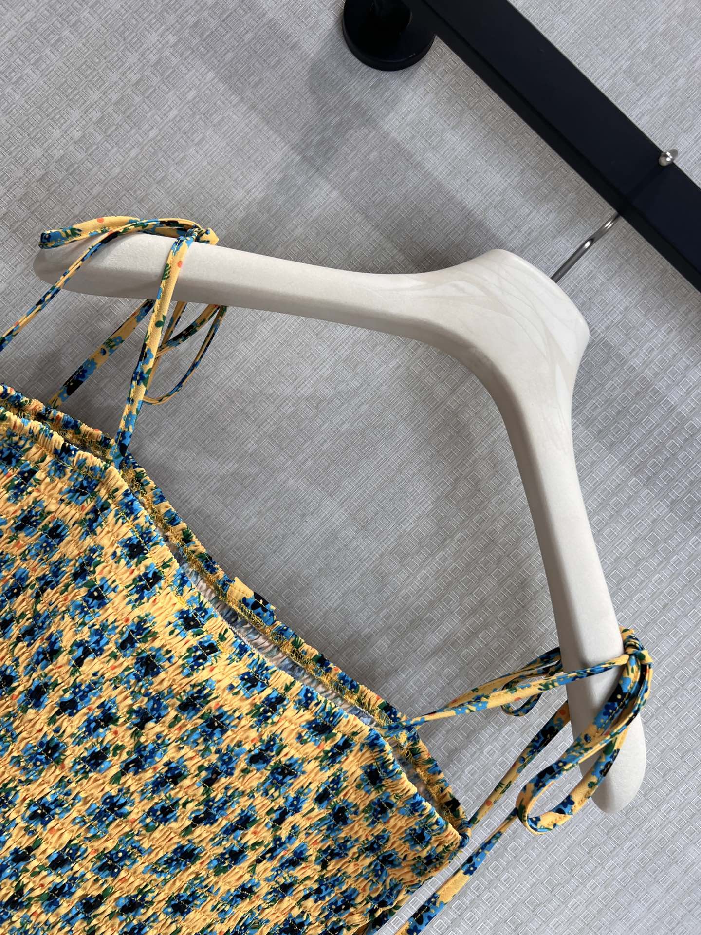 Miu* 26Ss春夏新款 向日葵黄碎花吊带连衣裙丨⚠独家yb开发!顶级高版出品!元气向日葵黄底色,搭配复古蓝调小雏菊碎花,明媚又显白;可调节系带吊带+方领剪裁,露出精致锁骨,甜美又显瘦;胸前弹力打揽收腰,自然凸显腰线,微A裙摆飘逸灵动,走路自带氛围感。现货发售S/M/L