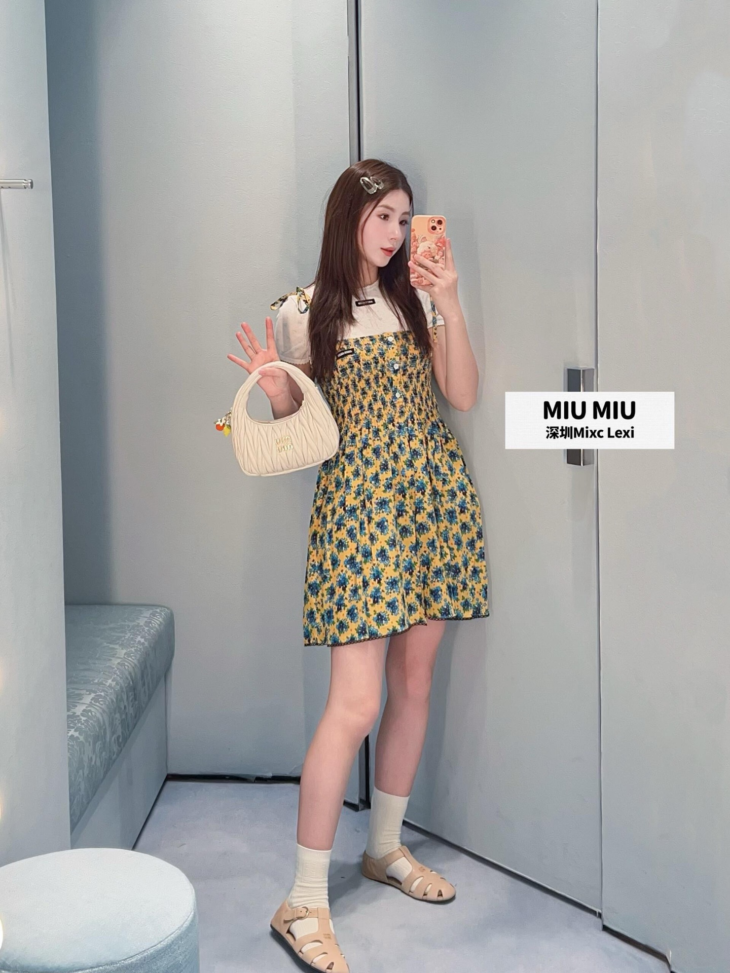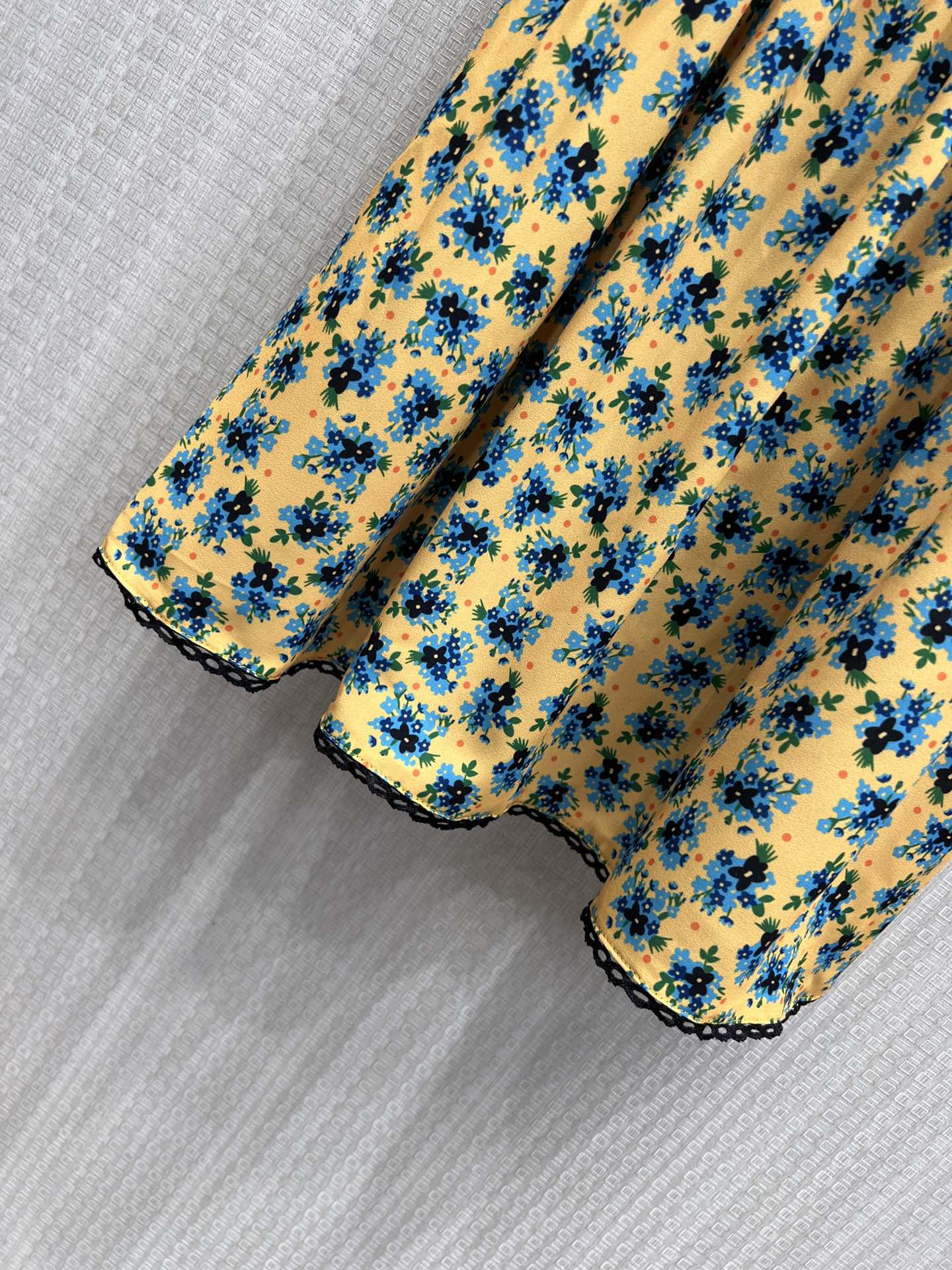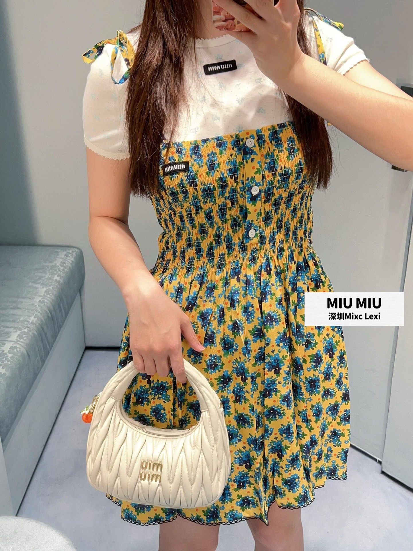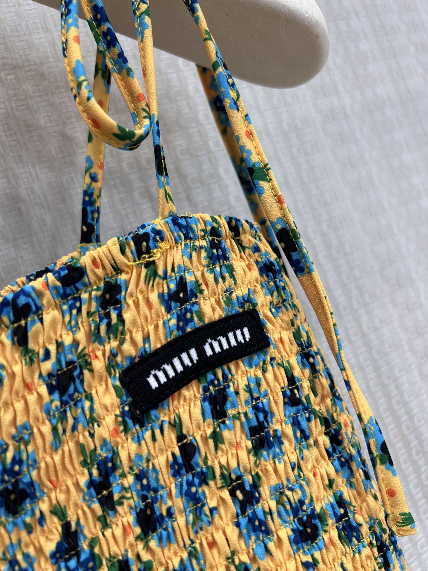 Miu* 26Ss春夏新款 向日葵黄碎花吊带连衣裙丨⚠独家yb开发!顶级高版出品!元气向日葵黄底色,搭配复古蓝调小雏菊碎花,明媚又显白;可调节系带吊带+方领剪裁,露出精致锁骨,甜美又显瘦;胸前弹力打揽收腰,自然凸显腰线,微A裙摆飘逸灵动,走路自带氛围感。现货发售S/M/L