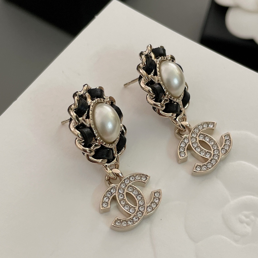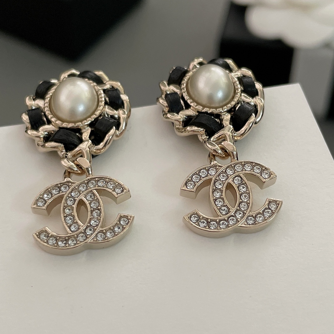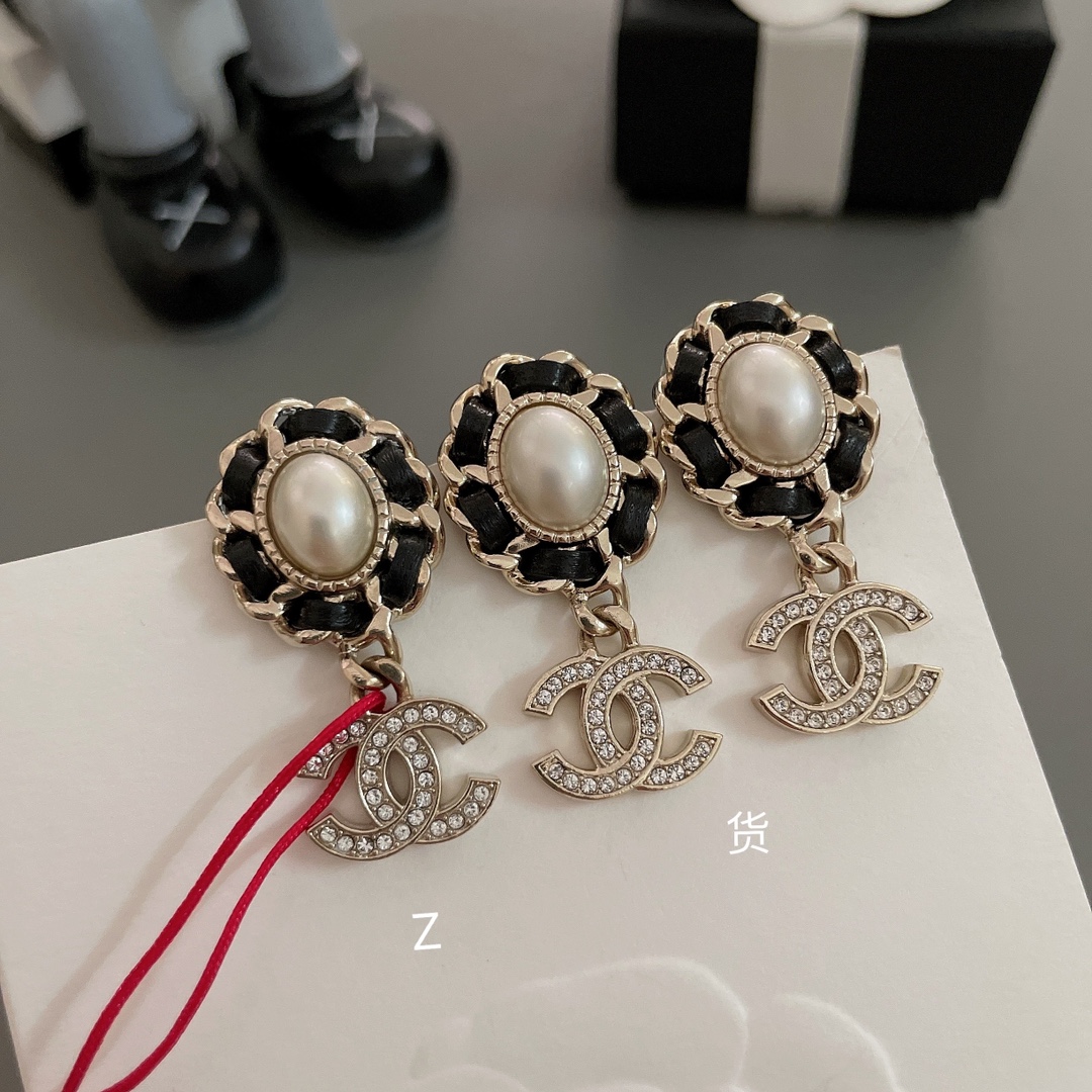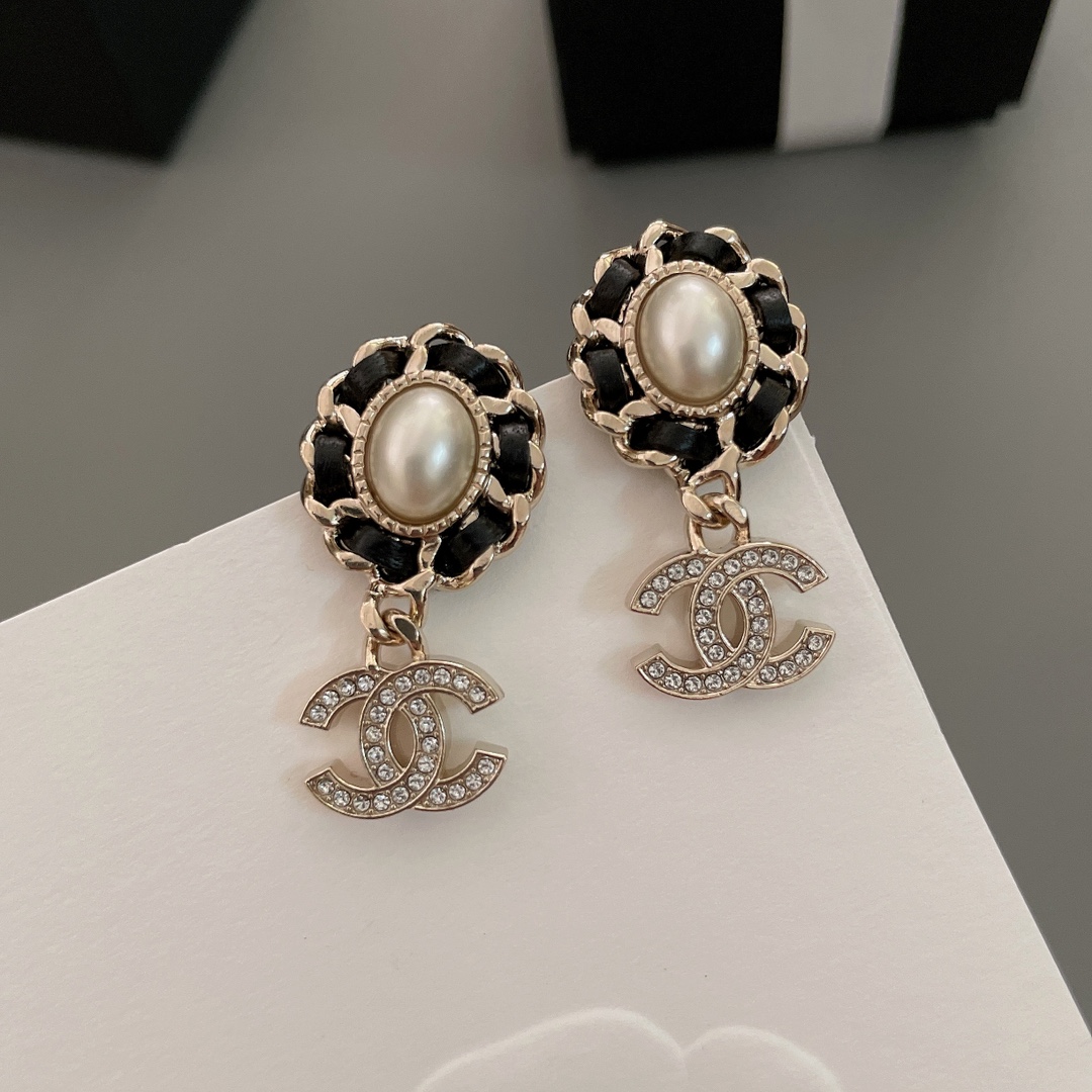 香奈儿 链条皮耳钉 纯手工穿皮,施华洛珍珠+水晶,五金链条侧面边缘手工抛光,非常的光亮 (XTY)