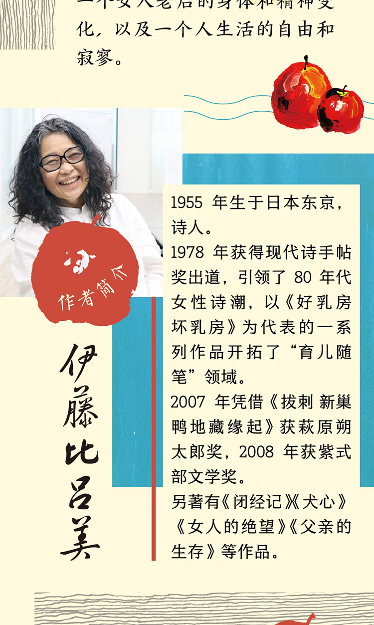 1978年获得现代诗手帖奖出道,引领了80年代女性诗潮,以《好乳房 坏乳房》为代表的一系列作品开拓了“育儿随笔”领域。2007年凭借《拔刺 新巢鸭地藏缘起》获萩原朔太郎奖,2008年获紫式部文学奖。
