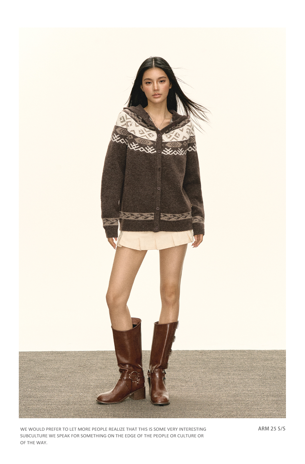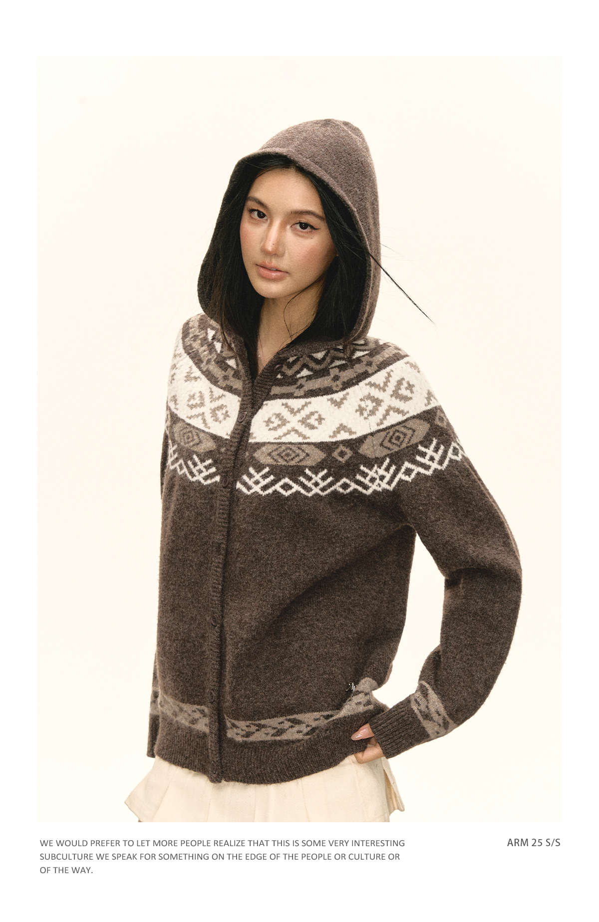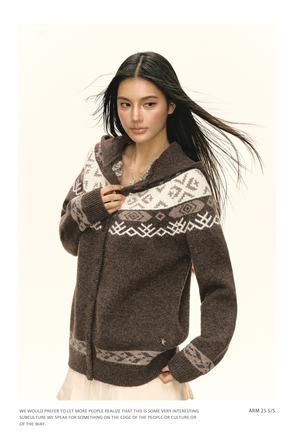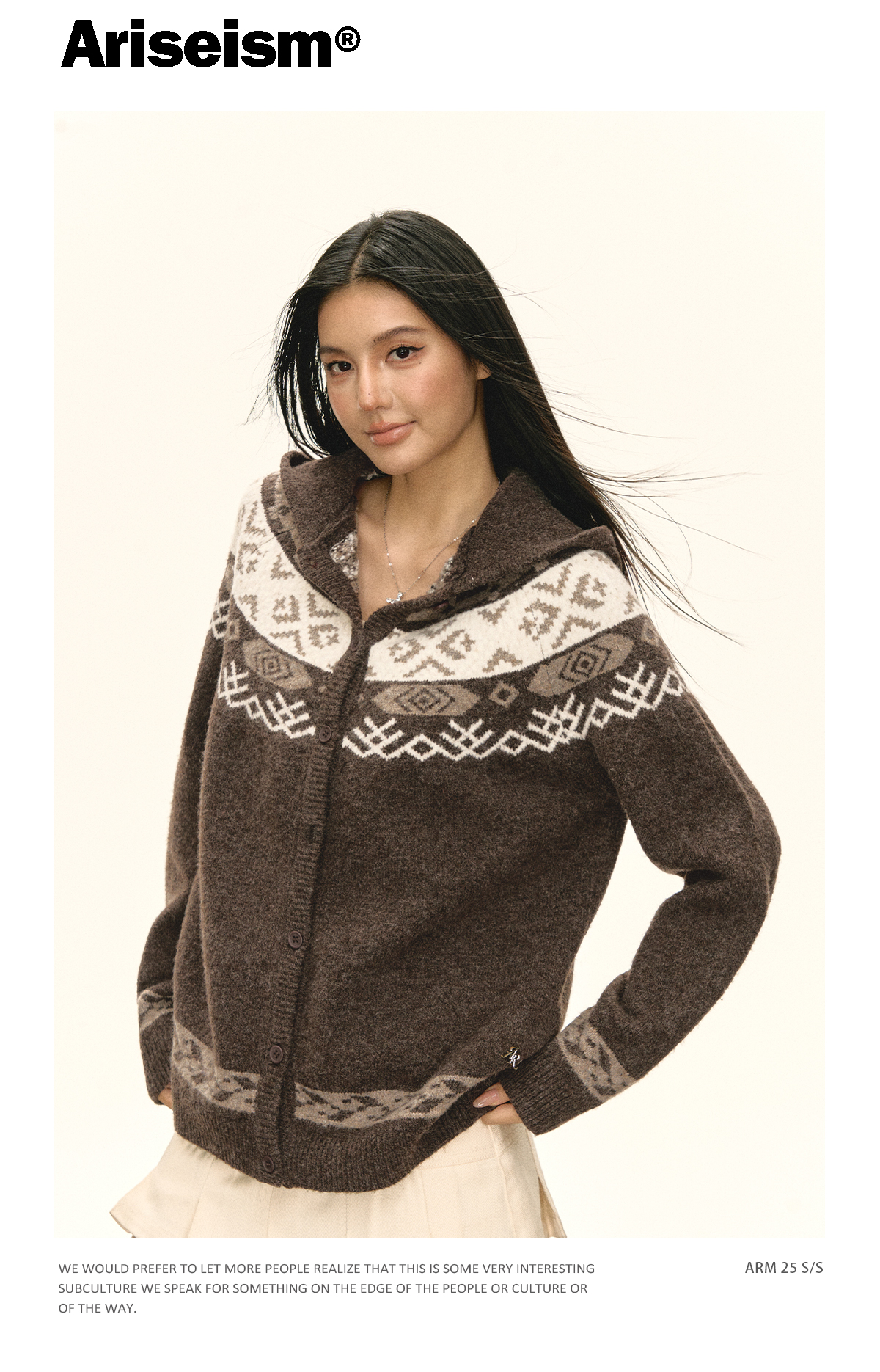 Ariseism 美式复古深卡其费尔岛连帽毛衣女秋季新款