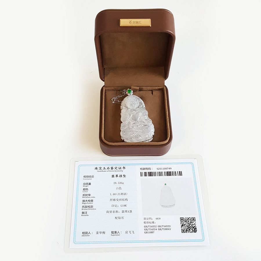 【天然正品】A货翡翠AU750收藏级白金镶钻镶天然细腻冰种白色度母翡翠吊坠项链链长:45CM(长度可调节)女士010725AH38