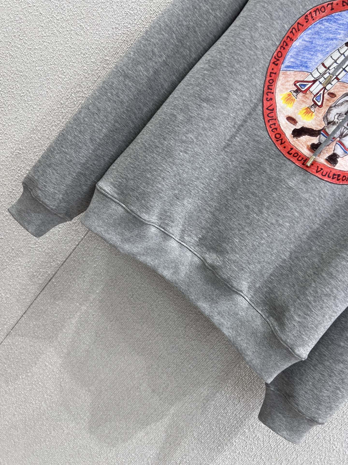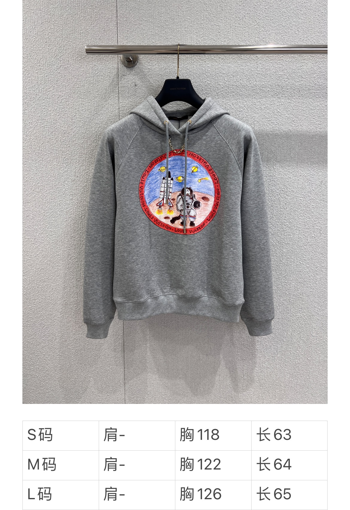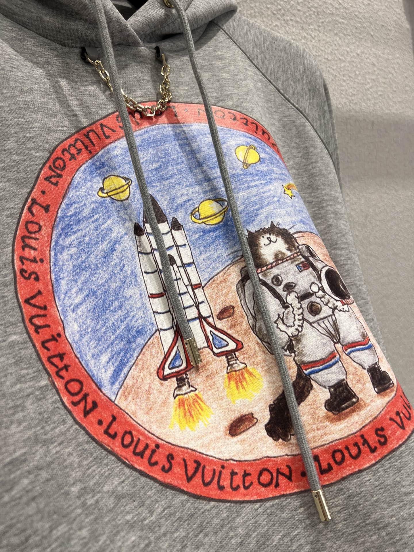Louis Vui*ton 25FW秋冬新款 链条印花连帽卫衣丨⚠独家yb开发!高版出品!浅灰色卫衣基底简约大气,胸前圆形印花充满故事感:穿着宇航服的猫咪在火星地表探索,旁边火箭蓄势待发,周遭行星与星辰点缀,仿佛将宇宙冒险的浪漫画卷穿在身上;红色环形饰边印有品牌标识,细节处彰显奢华基因。现货发售S/M/L