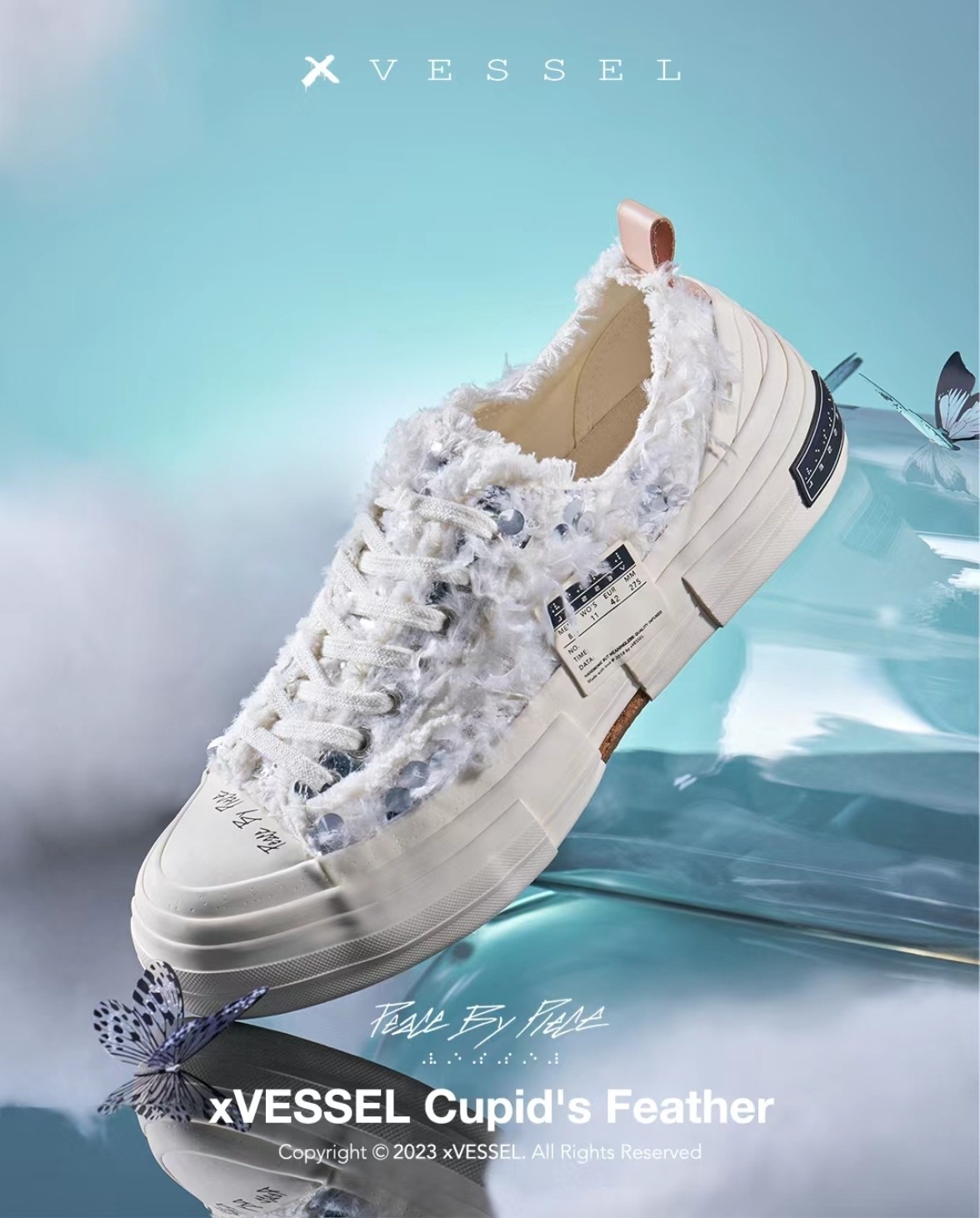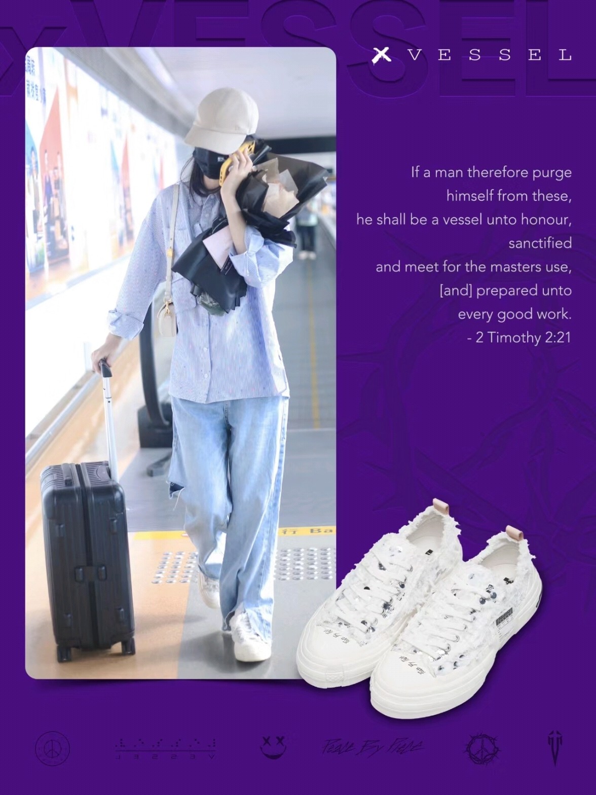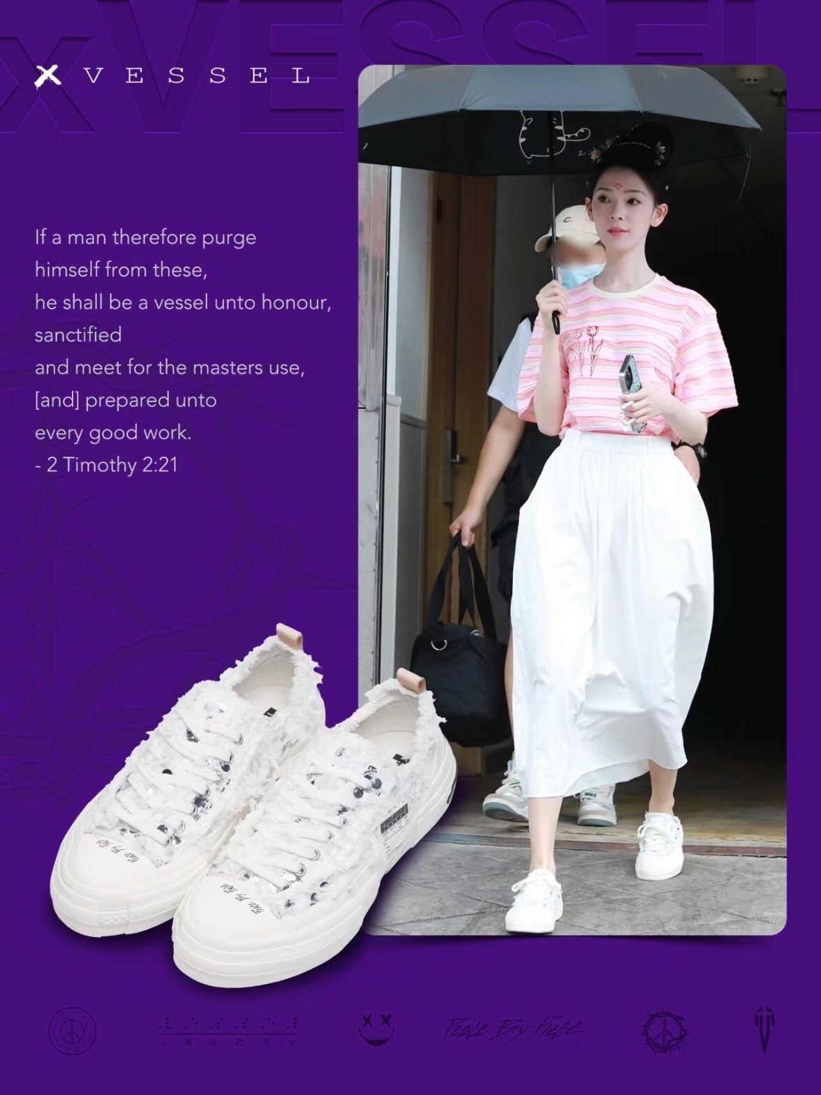 吴建豪 x Vessel 乞丐硫化帆布鞋——这款帆布鞋设计前卫,以三双拼接一双,鞋带和鞋舌的地方运用了毛边的设计,乞丐系列 号称是世界上第一双软木硫化鞋的鞋,充满了艺术感和复古的感觉,同时鞋子的设计颇有解构与重组的设计感,这也是这双鞋看起来像帆布鞋,却很有科幻感和空间感的原因所在。 中底软木填充 把古法手工皮鞋工艺与硫化鞋完美结合鞋面的设计也是沿袭了解构与重组的设计风格,将酷帅进行到底