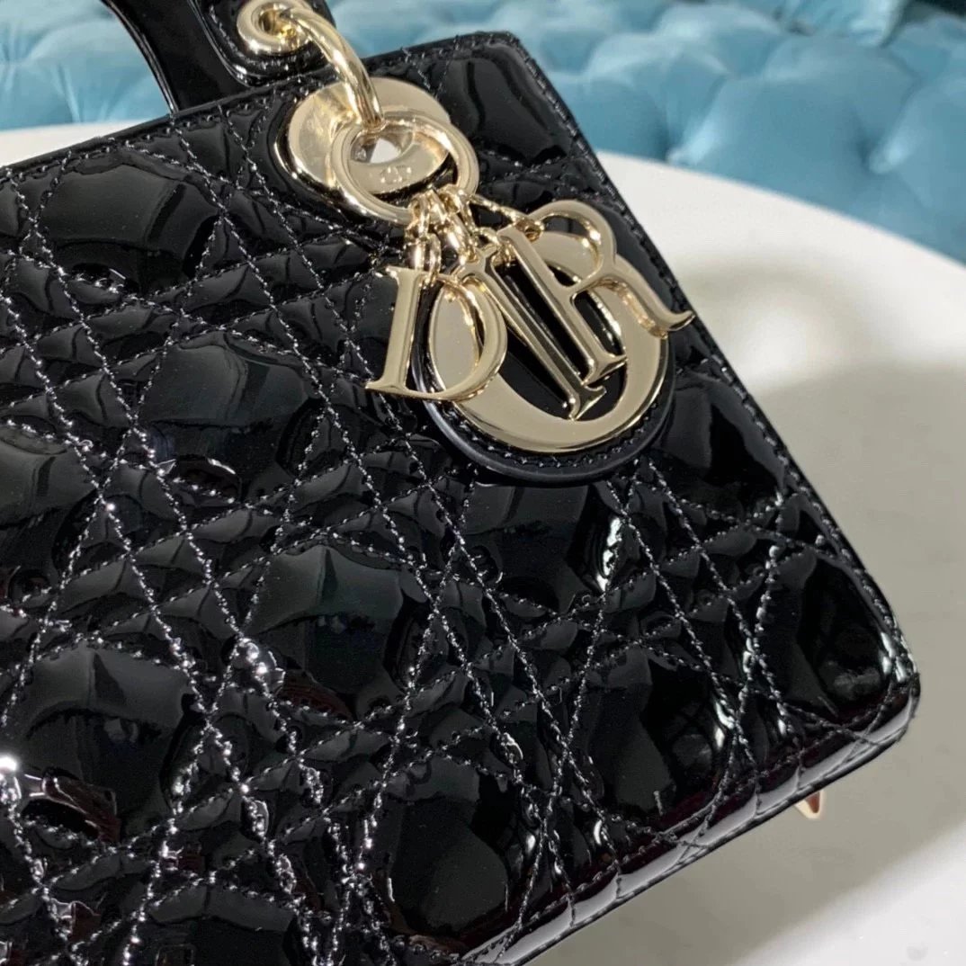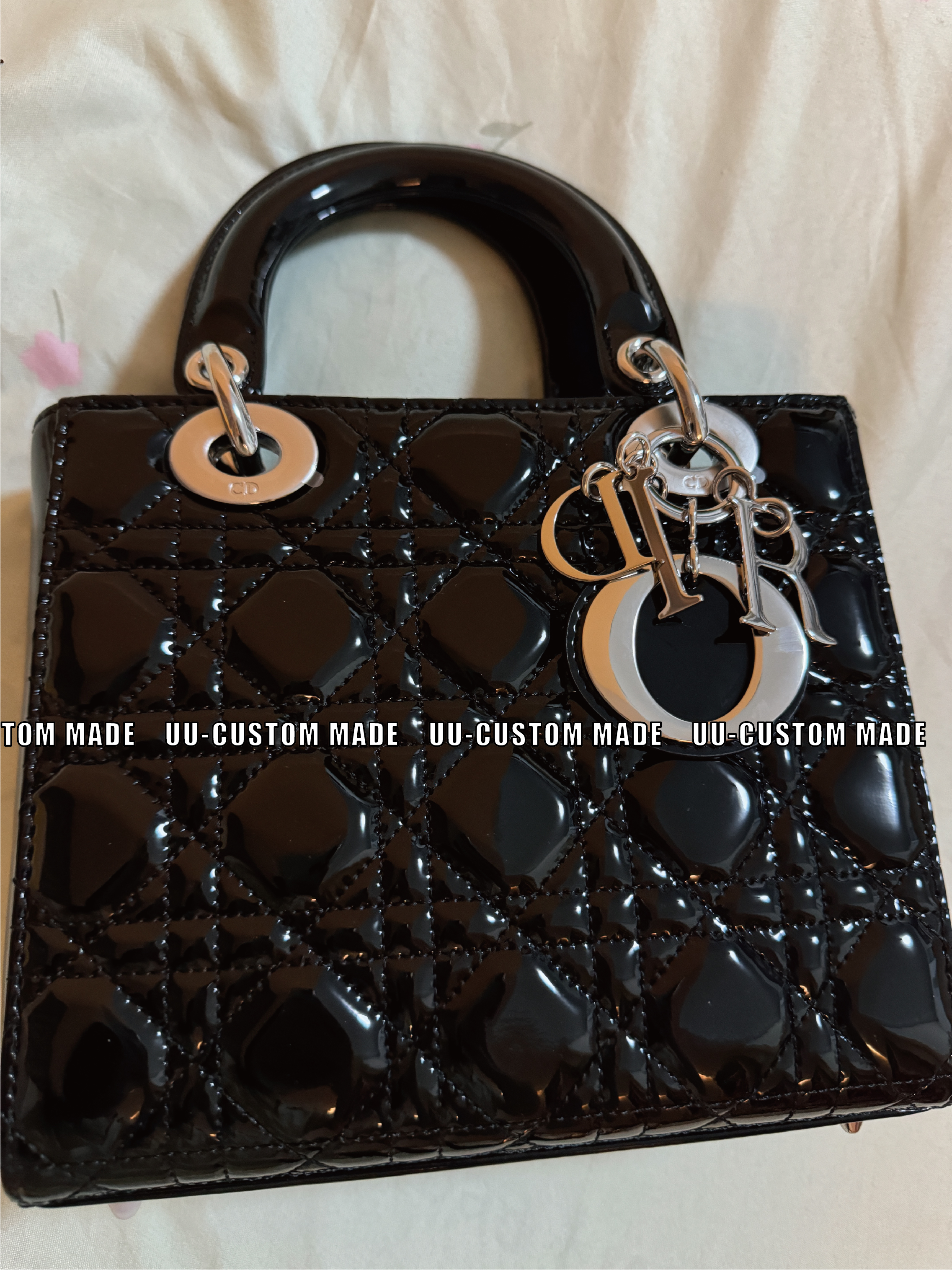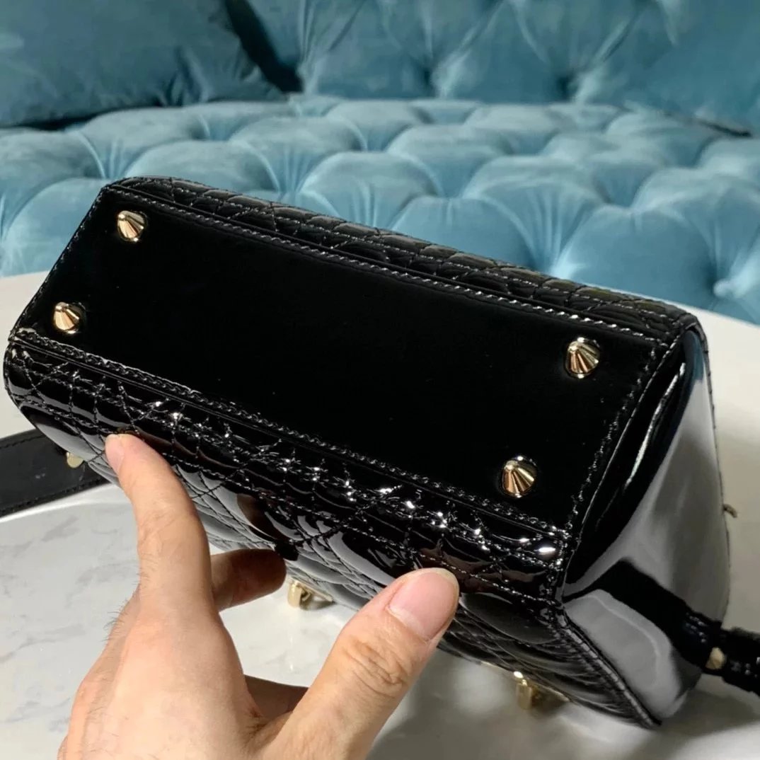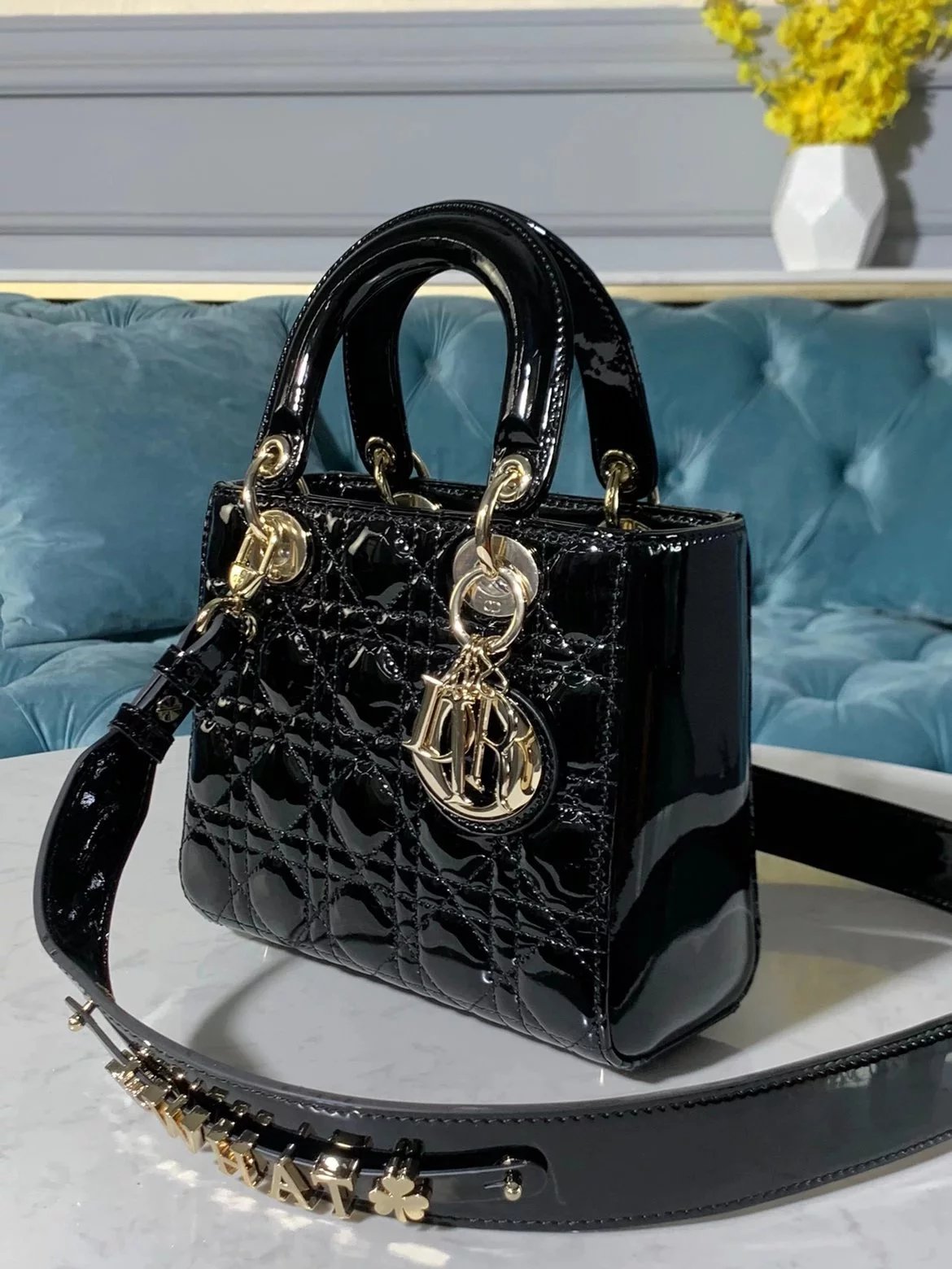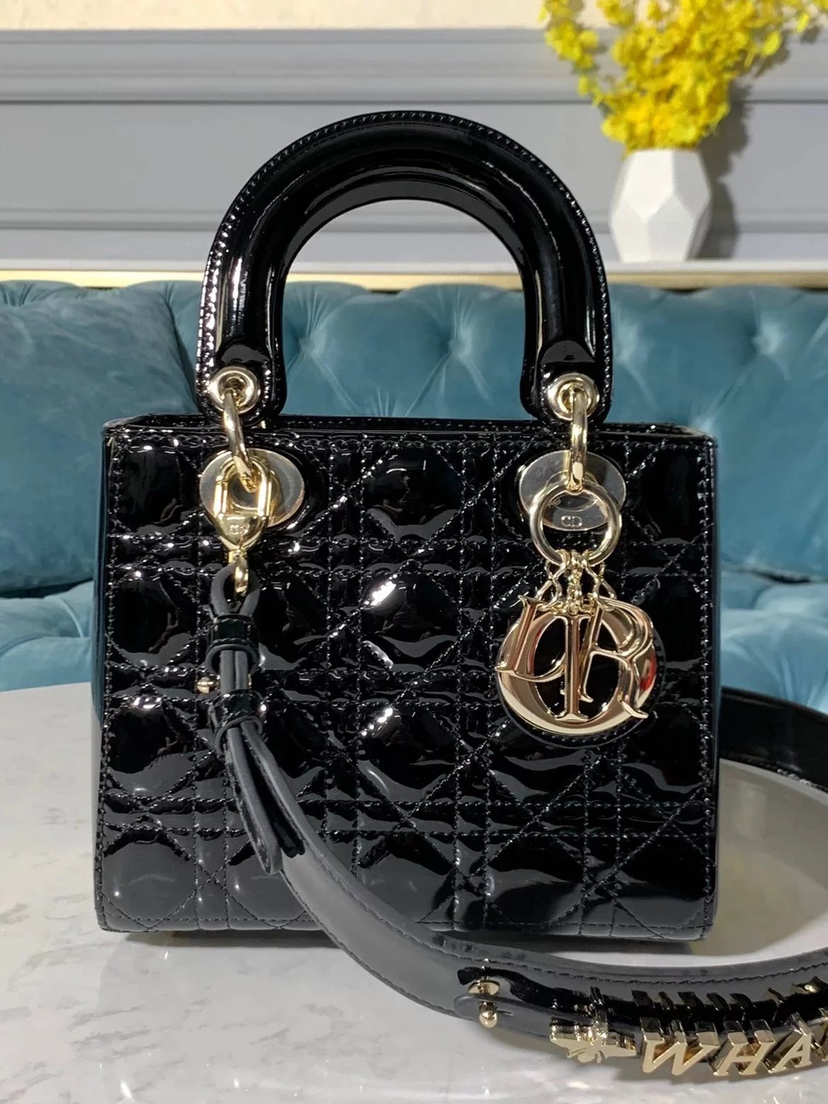 Lady Dior 2 0 cm 戴妃包 4格 黑色漆皮 采用原色藤格纹漆皮材质 搭配可个性化宽肩背带 淡金色金属配饰 26个字母和5个幸运符码自由搭配 个性化宽肩背带 点缀Dior徽章 可手提亦可肩背或斜挎 。 size20.5*8.5*17 型号M0538