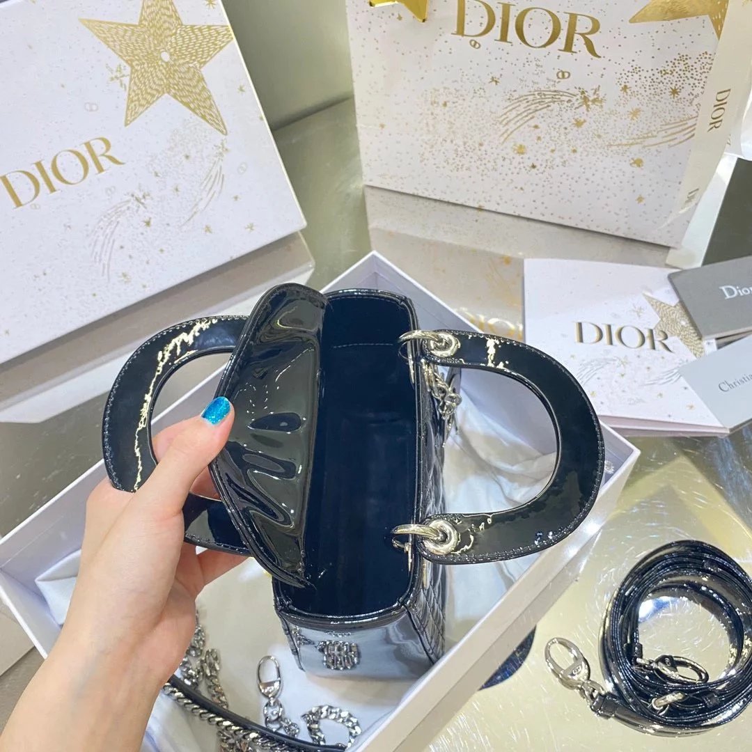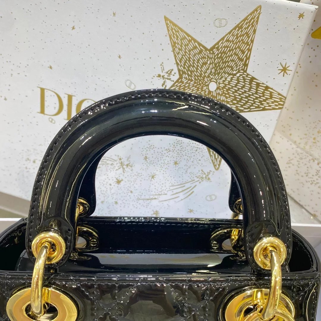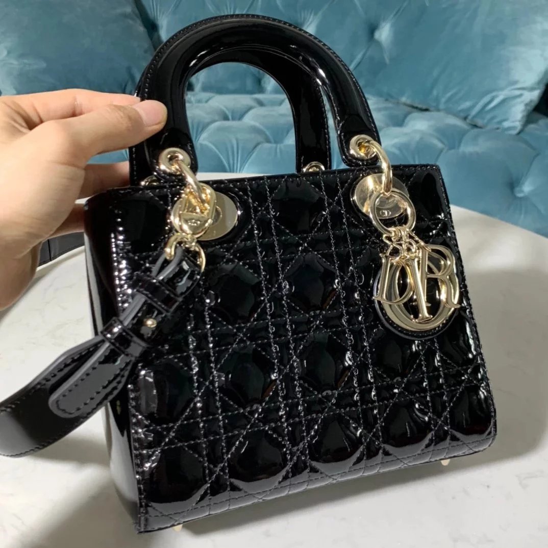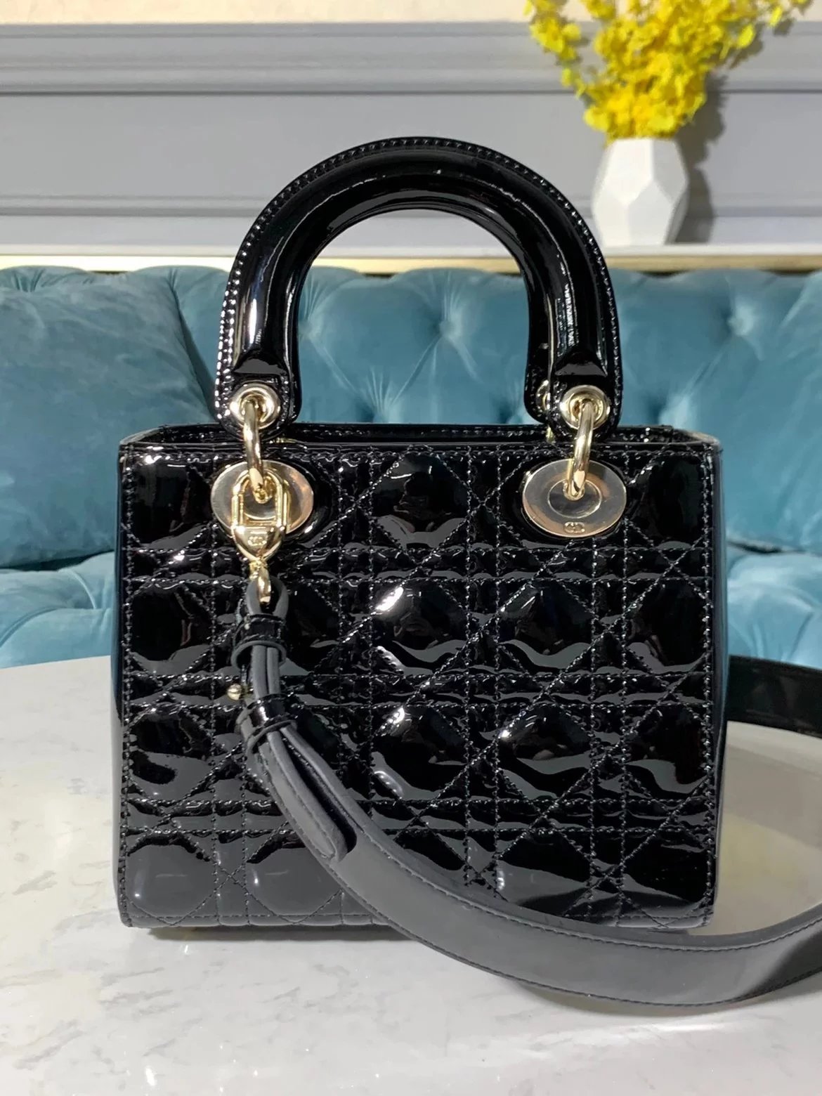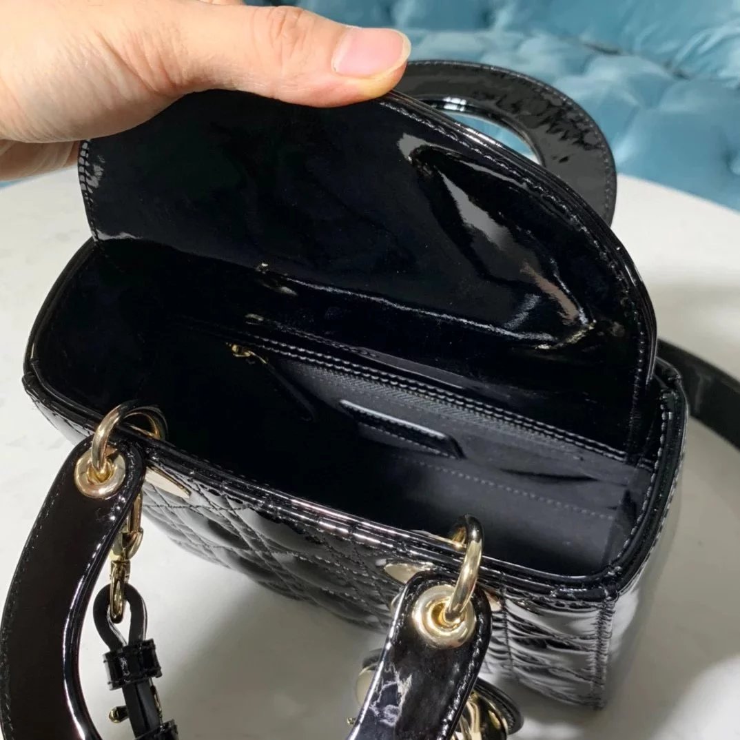 Lady Dior 2 0 cm 戴妃包 4格 黑色漆皮 采用原色藤格纹漆皮材质 搭配可个性化宽肩背带 淡金色金属配饰 26个字母和5个幸运符码自由搭配 个性化宽肩背带 点缀Dior徽章 可手提亦可肩背或斜挎 。 size20.5*8.5*17 型号M0538