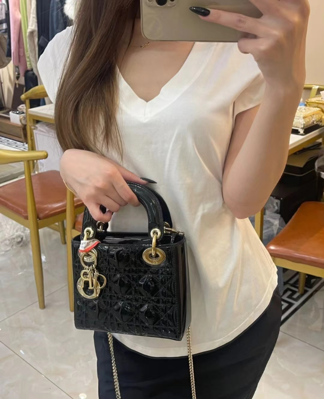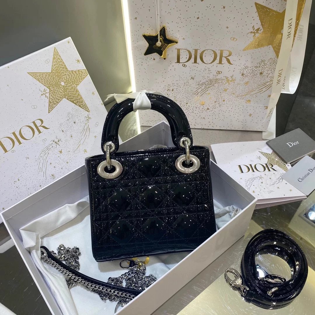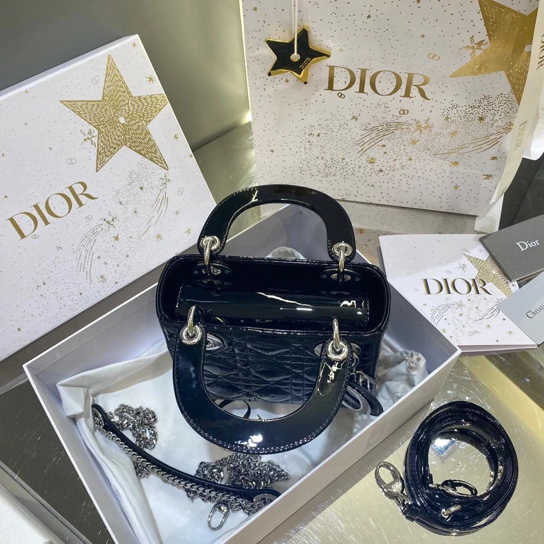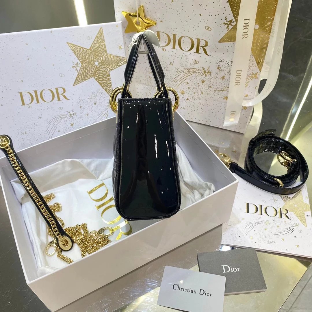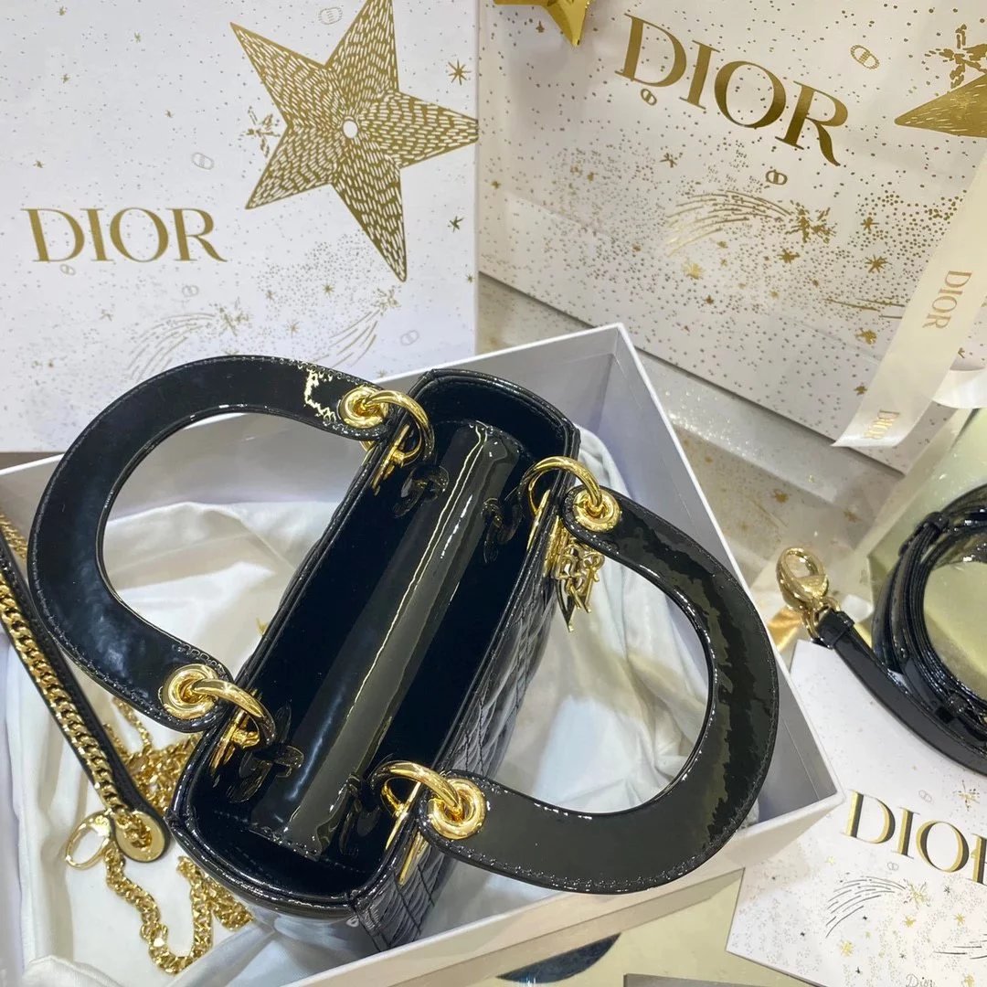 Lady Dior 2 0 cm 戴妃包 4格 黑色漆皮 采用原色藤格纹漆皮材质 搭配可个性化宽肩背带 淡金色金属配饰 26个字母和5个幸运符码自由搭配 个性化宽肩背带 点缀Dior徽章 可手提亦可肩背或斜挎 。 size20.5*8.5*17 型号M0538