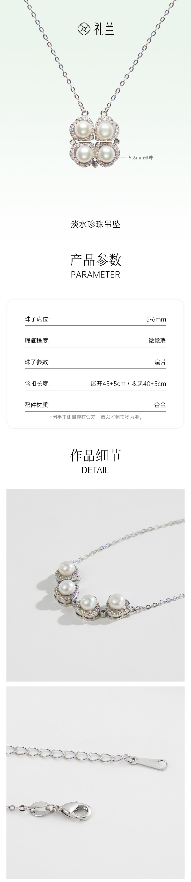 礼兰 淡水珍珠四叶草吊坠 可展开设计气质项链5-6mm