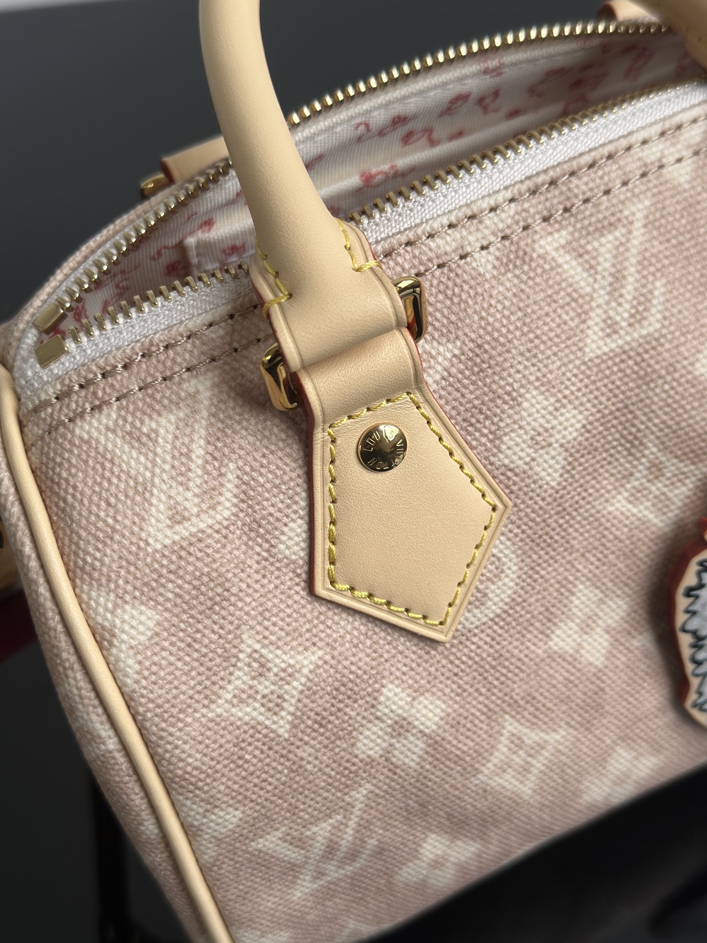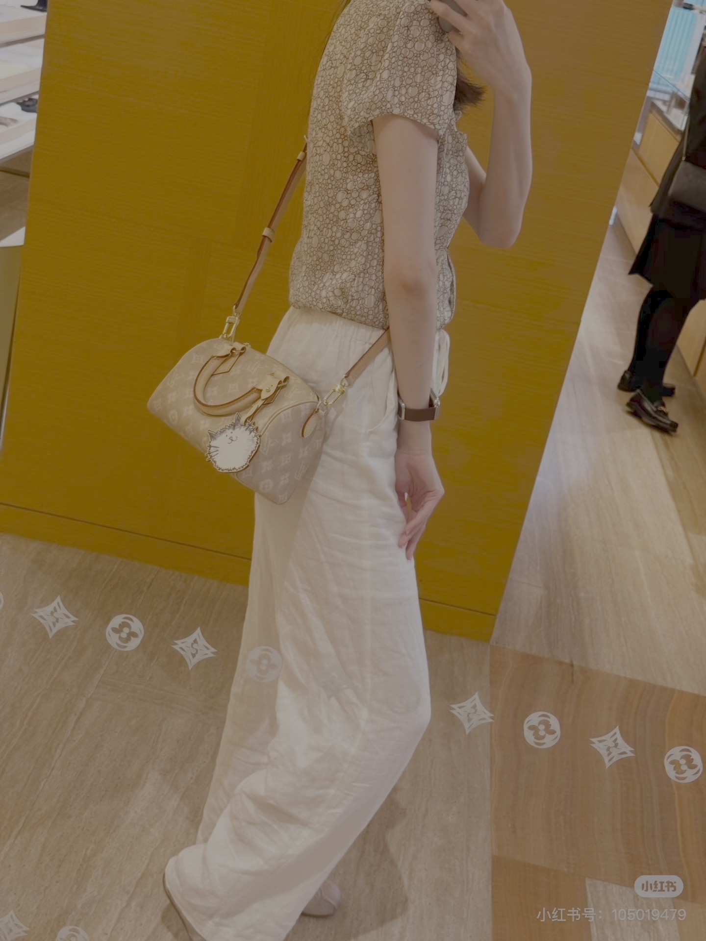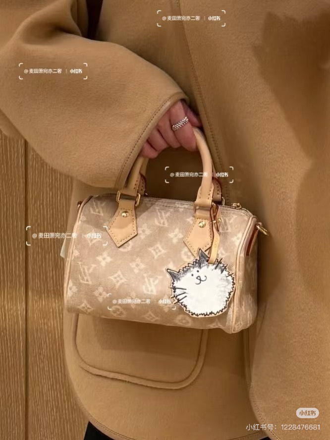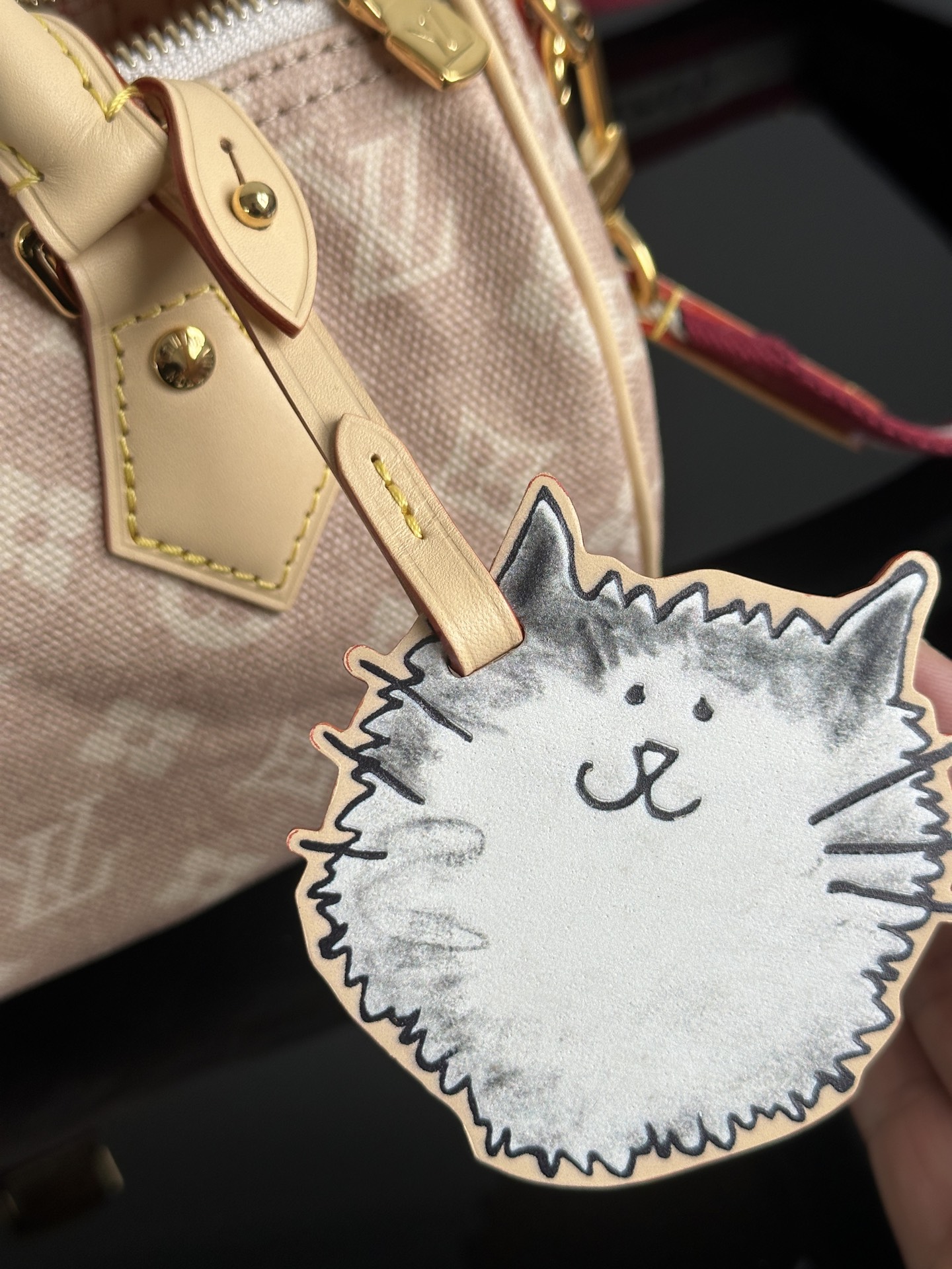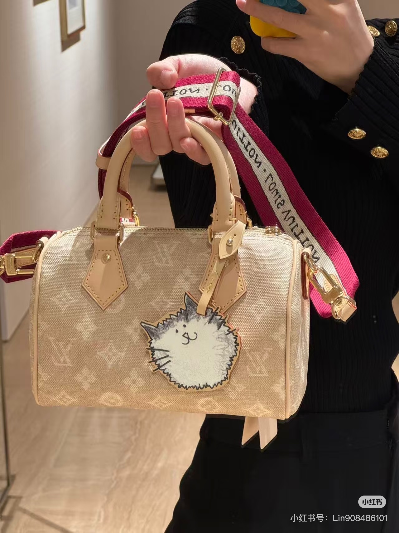 Speedy 20 Bandoulière 手袋取材 Meowgram 帆布,瞩目亮相品牌与 Vogue 前创意总监打造的 LV Travels With Grace Coddington 合作系列。可爱猫咪造型挂饰和皮革手柄丰富细节,挂锁等金属件再添考究笔触。尺寸:13.5 x 12 x 20.5 厘米